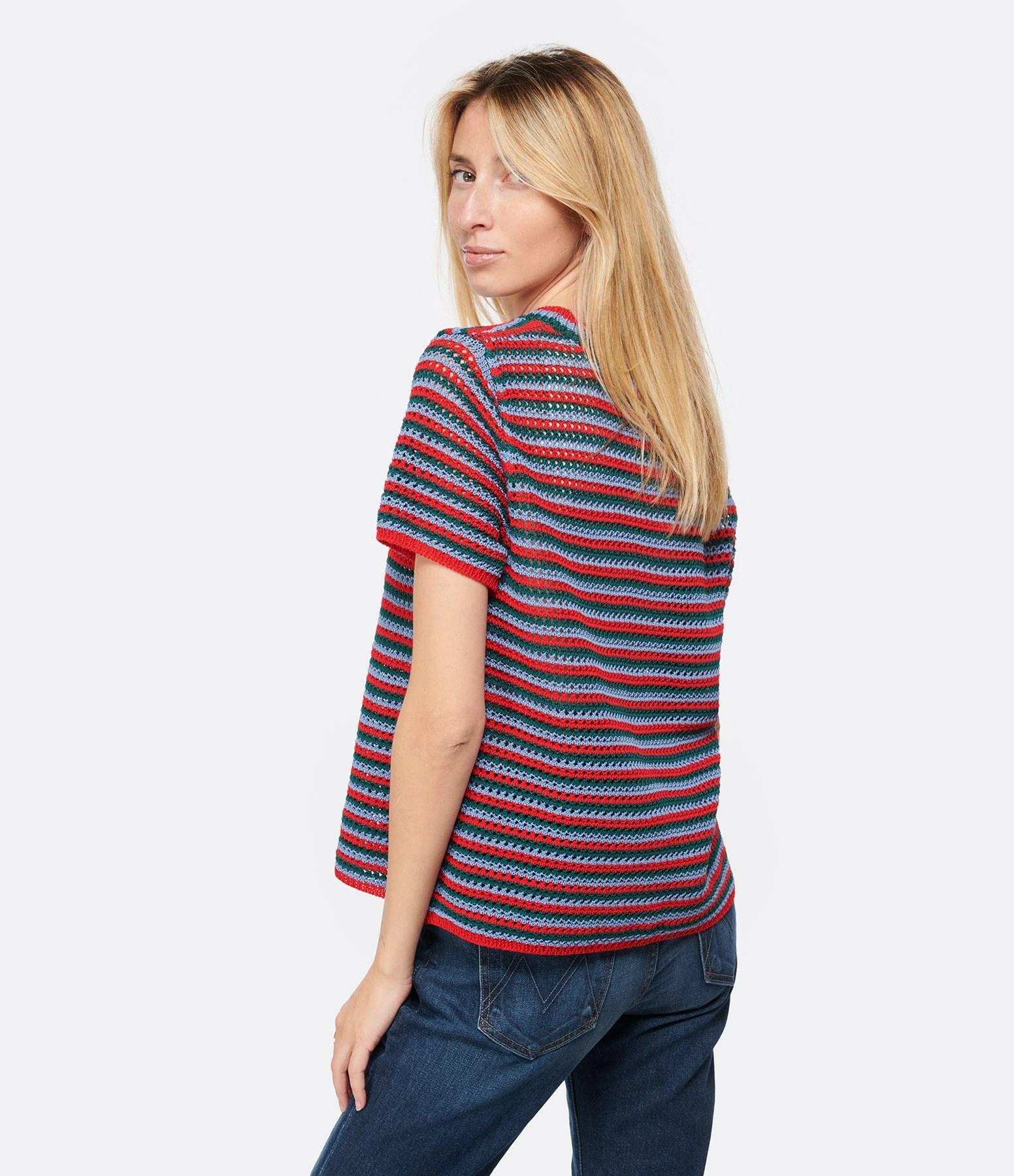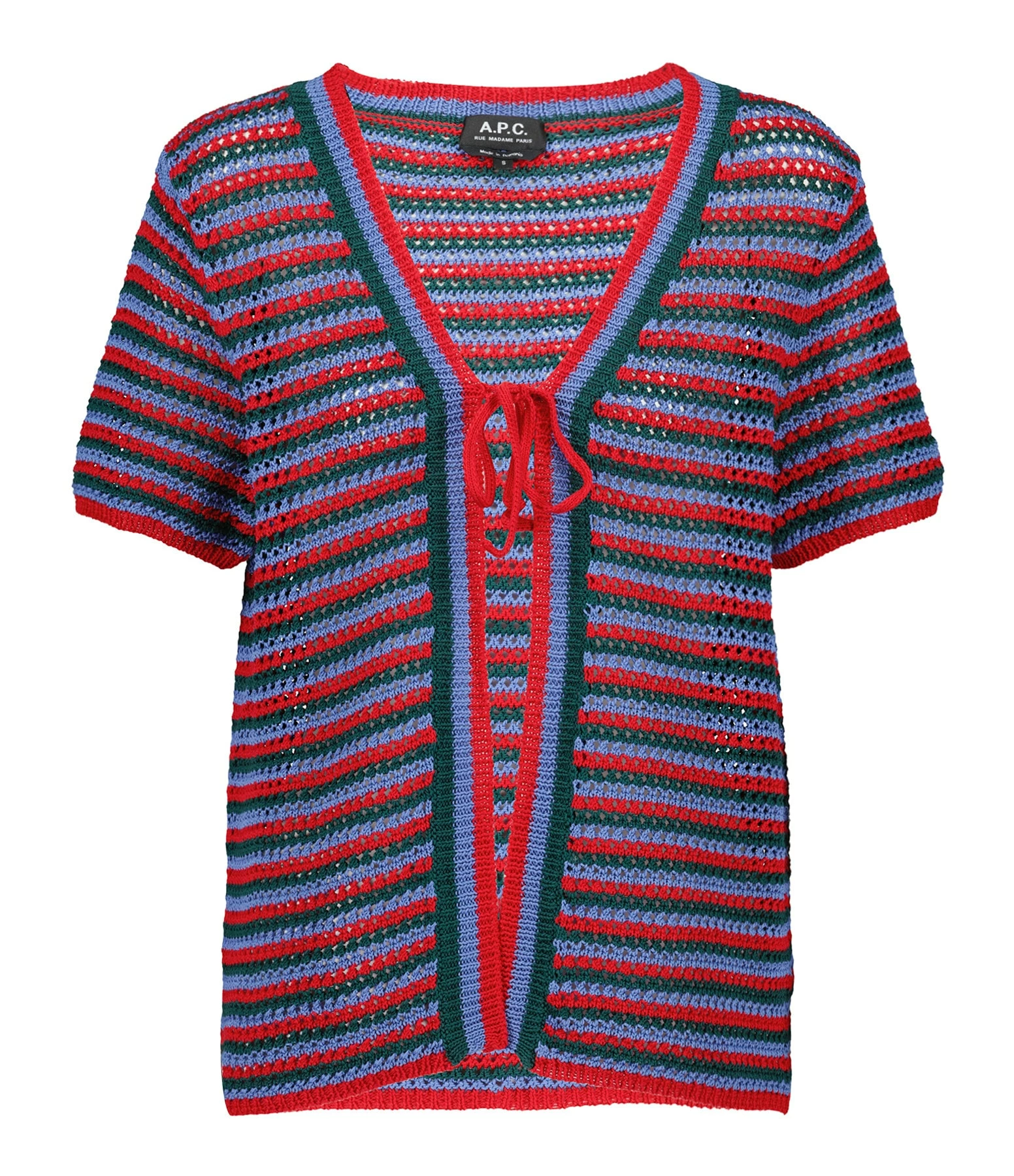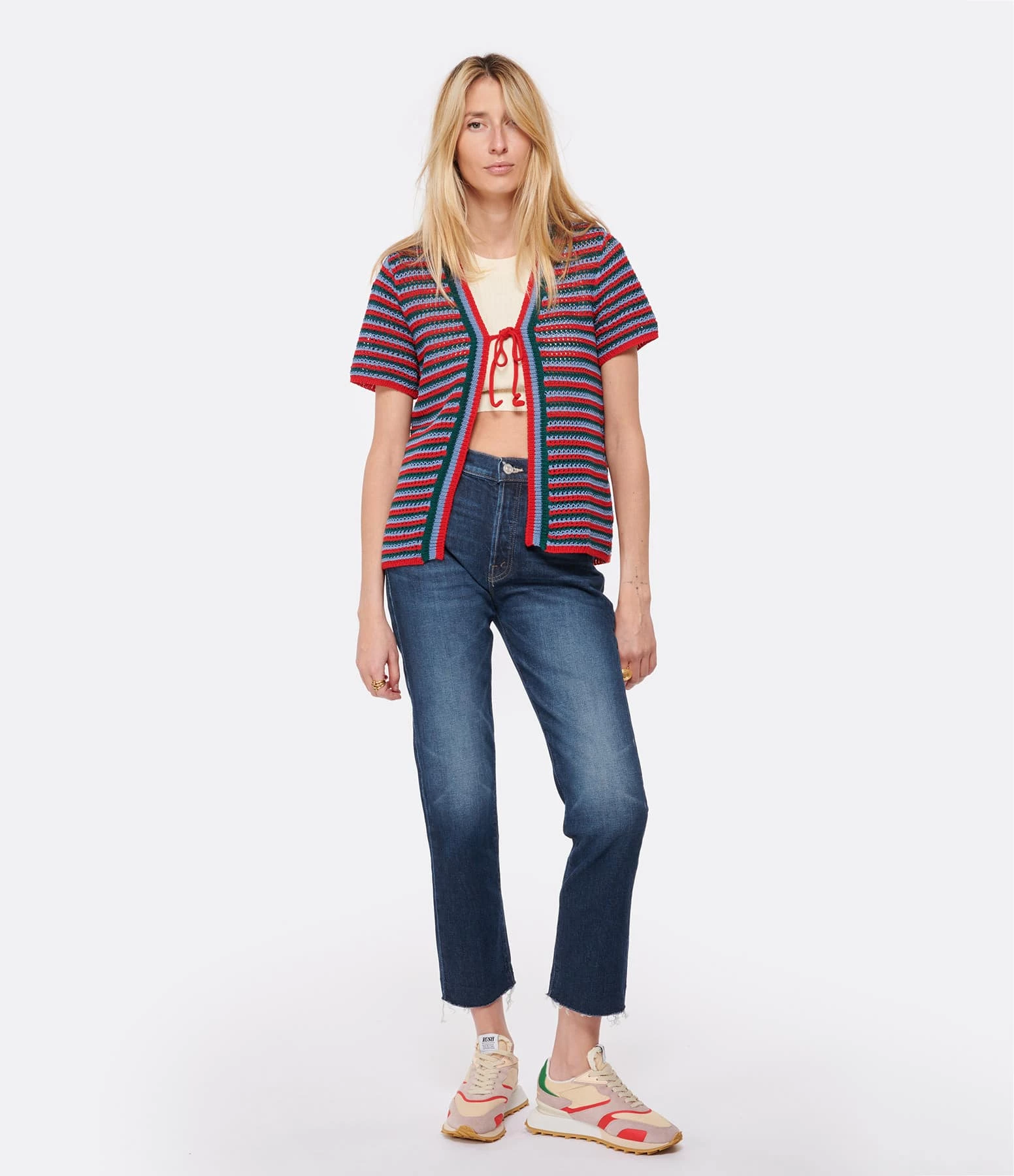 Cardigan à rayures multicolores en coton crocheté. Manches courtes. Fermeture par cordon de serrage sur le devant. Coupe droite. Base droite.