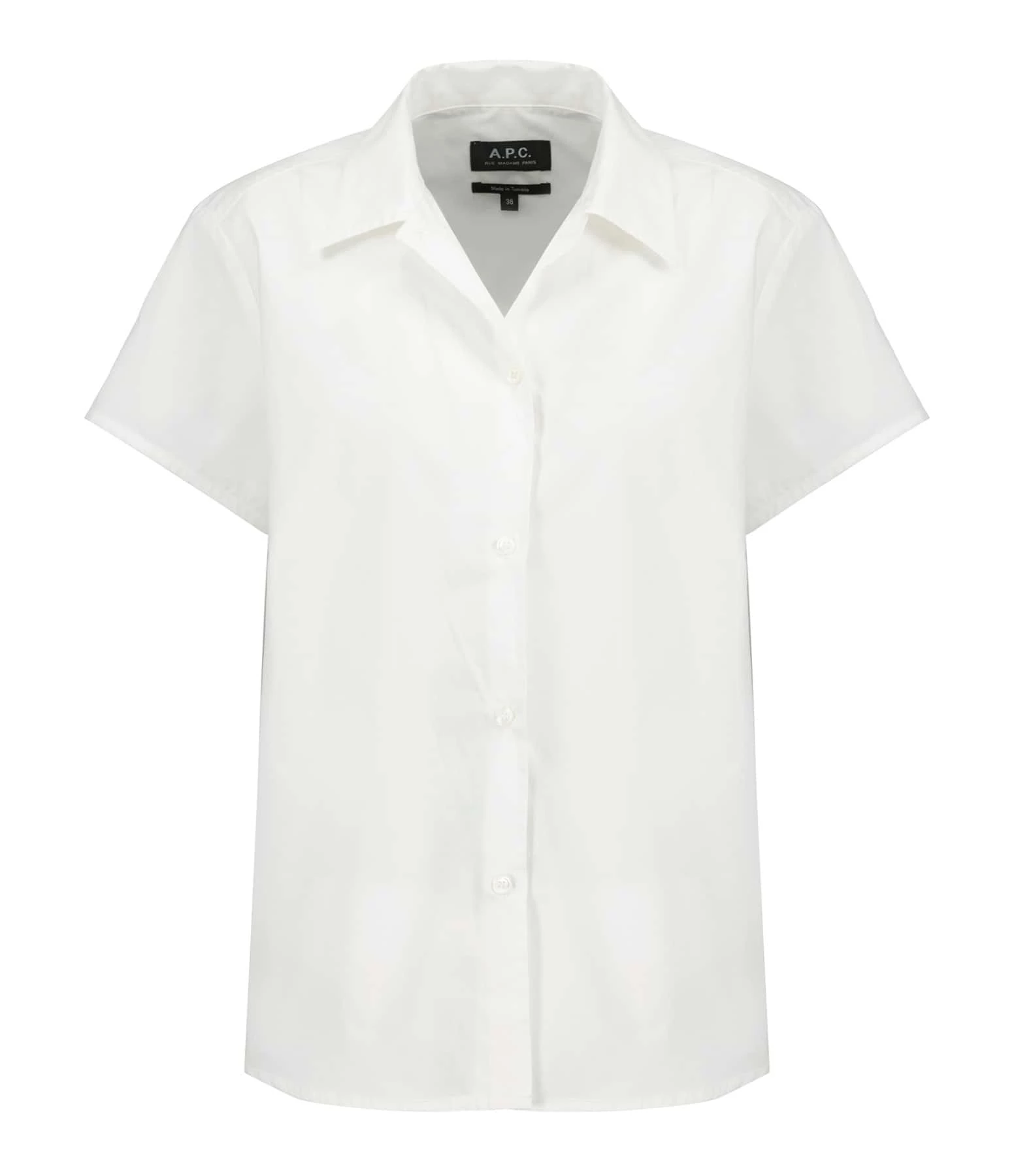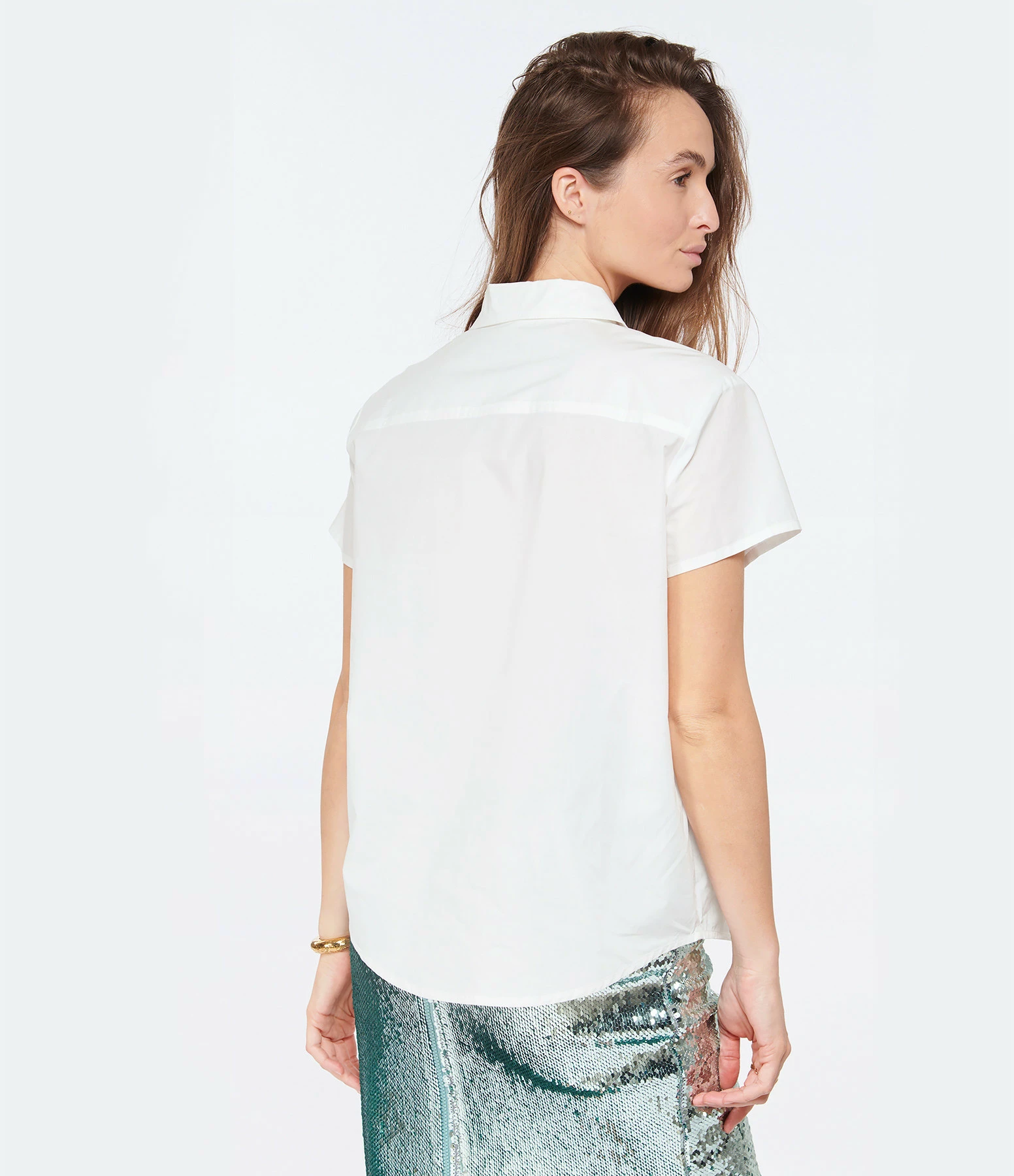 Chemise à manches courtes en coton blanc. Col chemise. Coupe droite. Fermeture par boutons. Base arrondie.