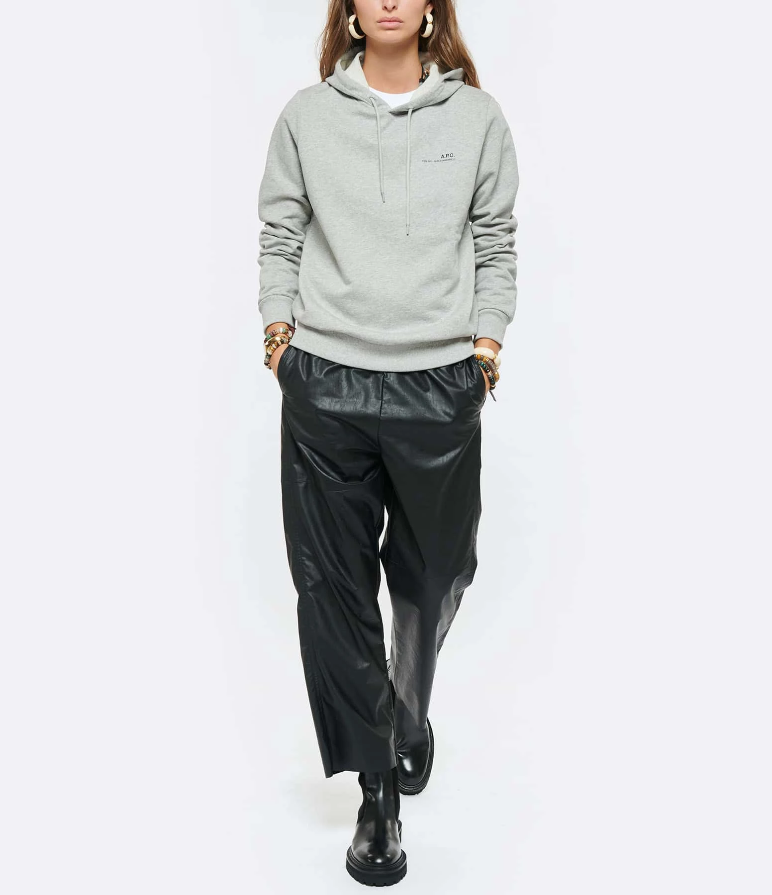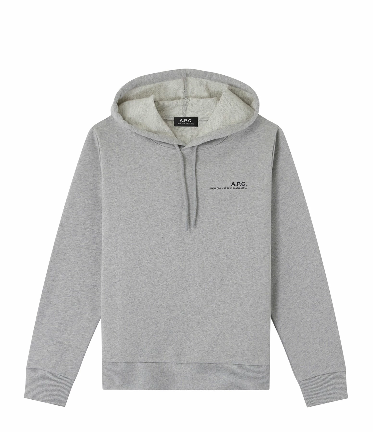 Hoodie en coton gris chiné. Inscription “A.P.C 39 RUE MADAME //” en blanc côté cœur. Manches longues. Coupe droite. Base droite.