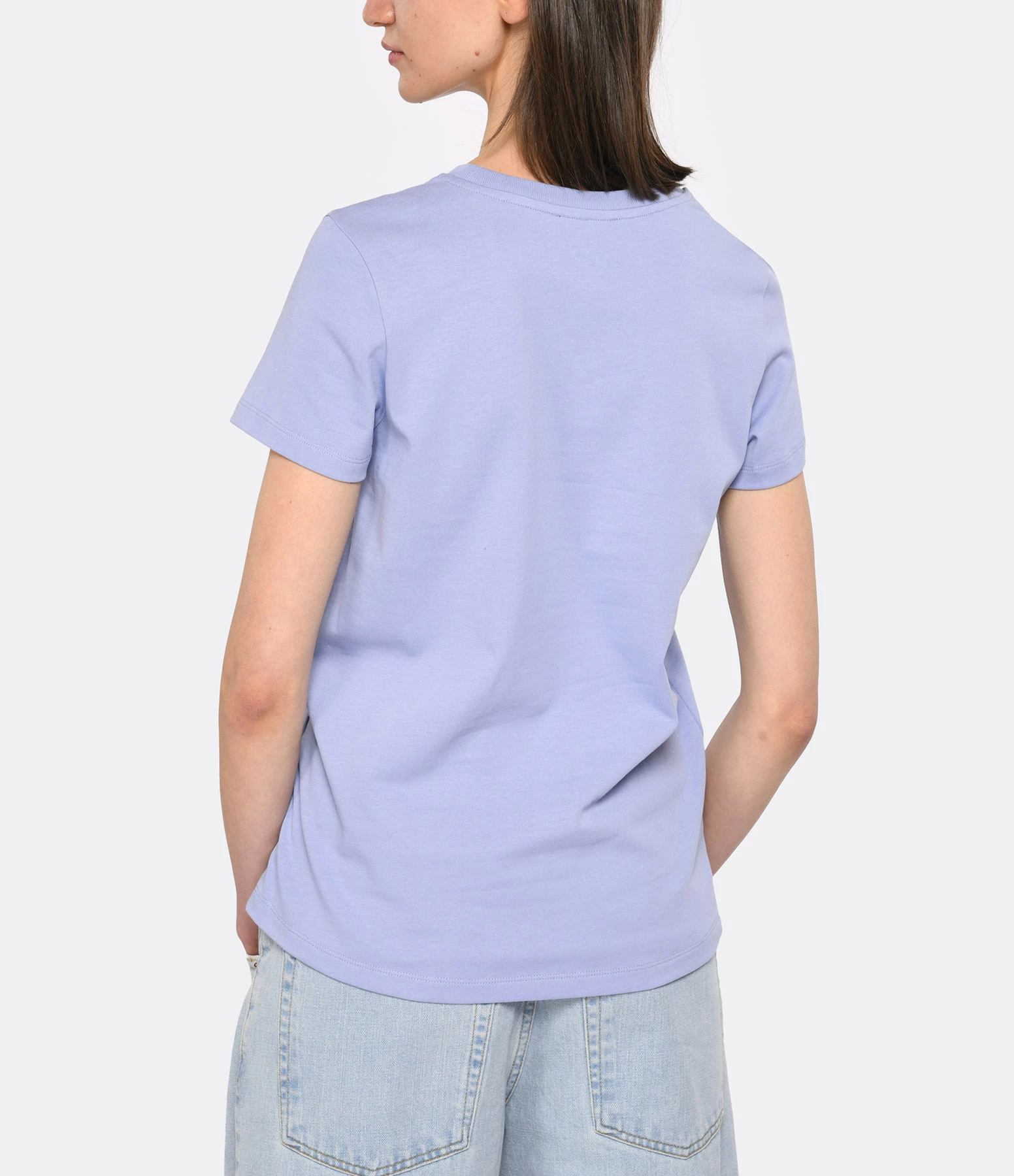 Tee-shirt en coton lila avec l’inscription “A.P.C. Rue Madame Paris” brodée en bleu ciel sur la poitrine. Col rond. Manches courtes. Coupe droite. Base droite.