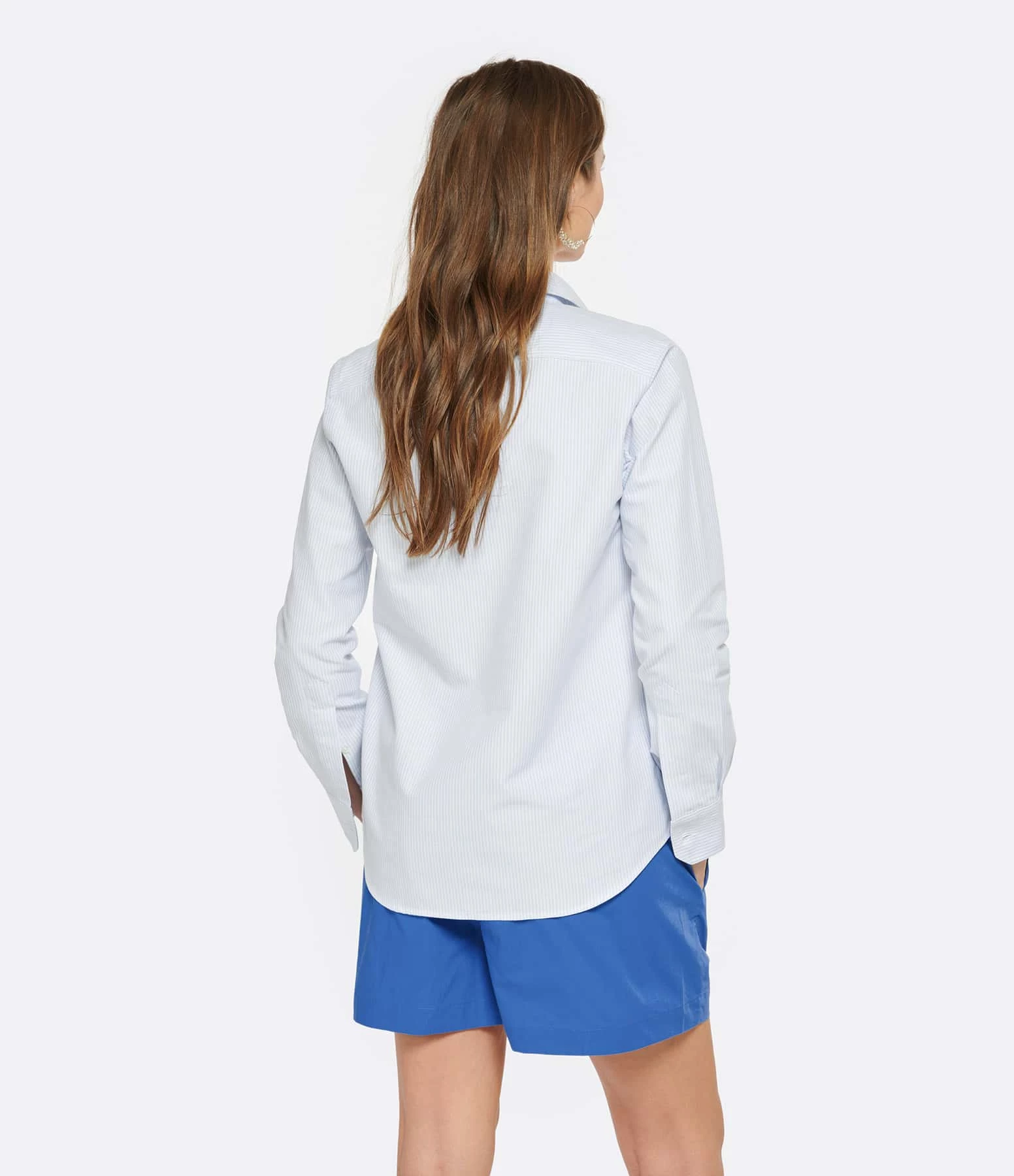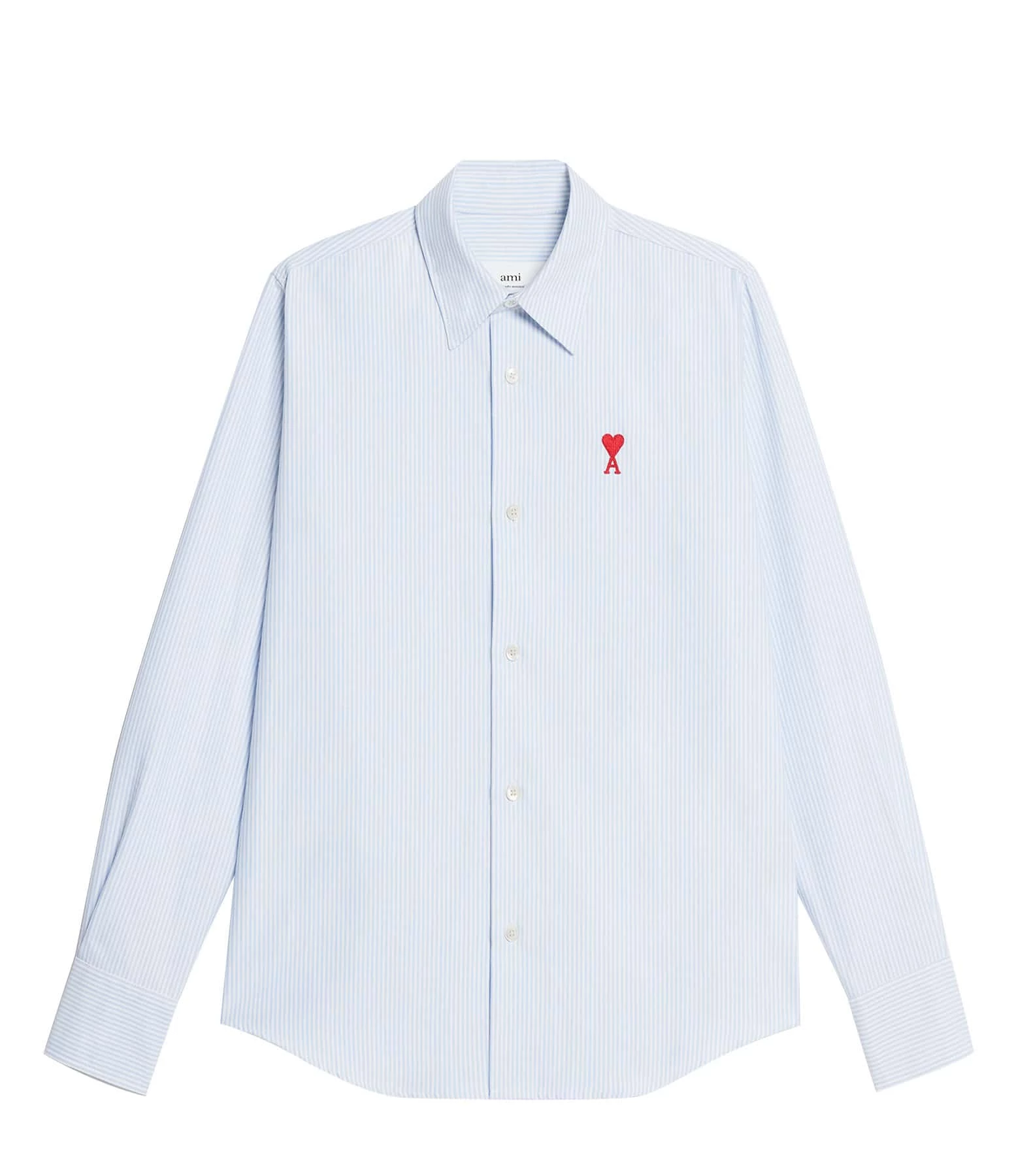 Chemise en coton à rayures bleu clair. Logo “Ami de cœur” brodé en rouge sur la poitrine. Col chemisier. Fermeture boutonnée. Manches longues boutonnées. Coupe droite. Base arrondie.
