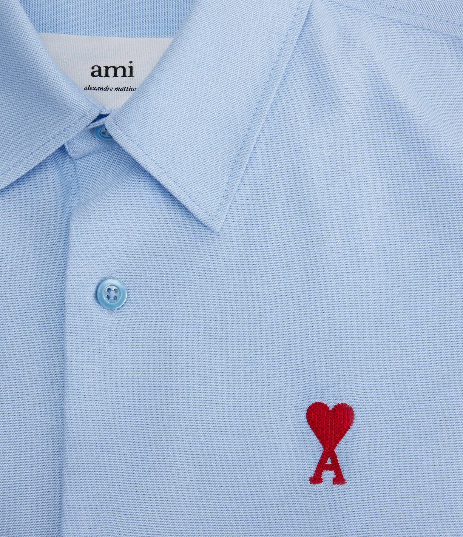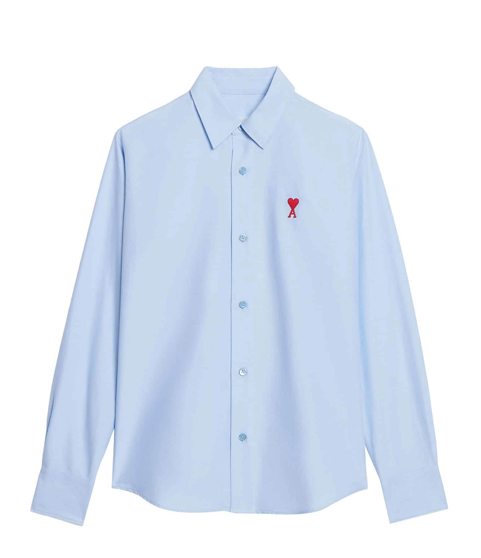 Chemise en coton bleu ciel. Logo “Ami de cœur” brodé en rouge sur la poitrine. Col chemisier. Fermeture boutonnée. Manches longues boutonnées. Coupe droite. Base arrondie.