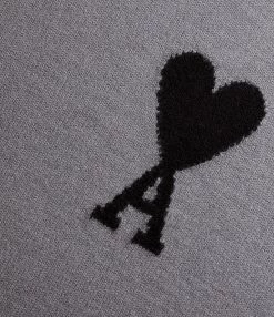 Pull en maille de laine grise ornée du logo “Ami de cœur” brodé en points chaînette noir sur la poitrine. Col montant côtelé. Manches longues avec poignets côtelés. Coupe large. Base droite côtelée.