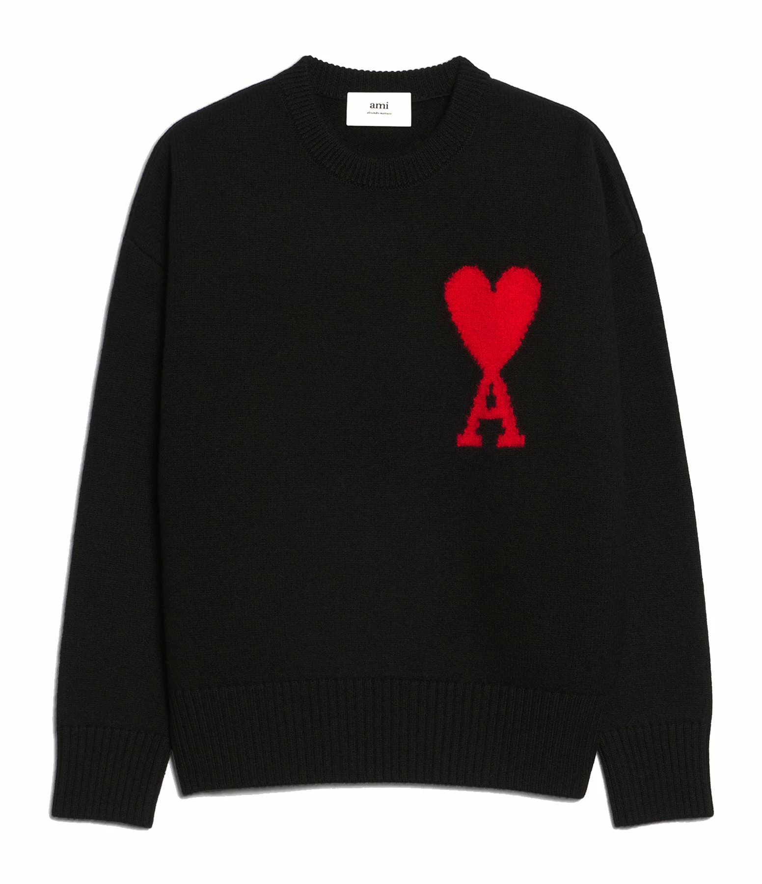 Pull en laine noir avec logo “Ami de cœur” brodé en rouge sur la poitrine. Col rond côtelé. Manches longues avec poignets côtelés. Coupe droite ample. Base droite côtelée.