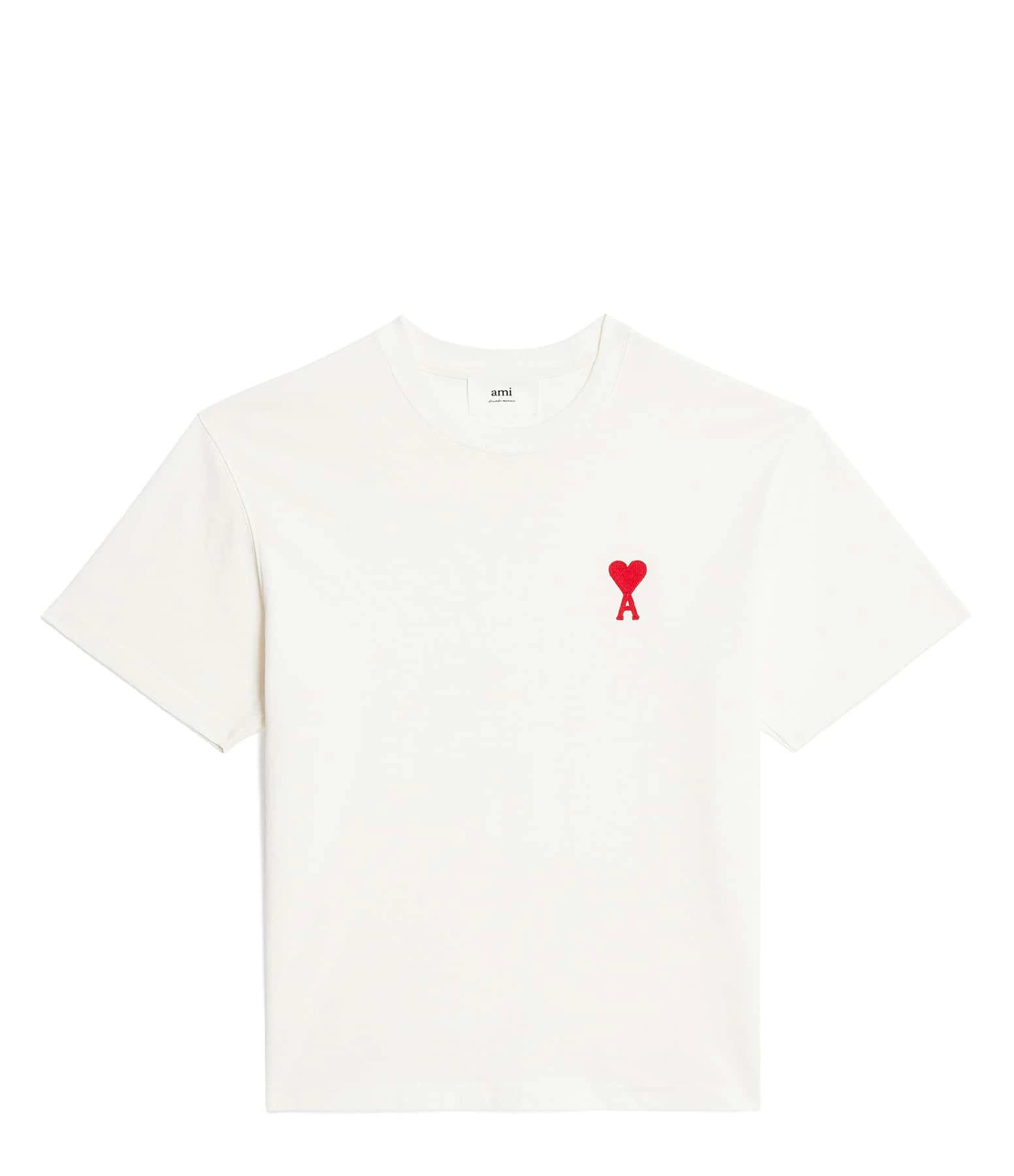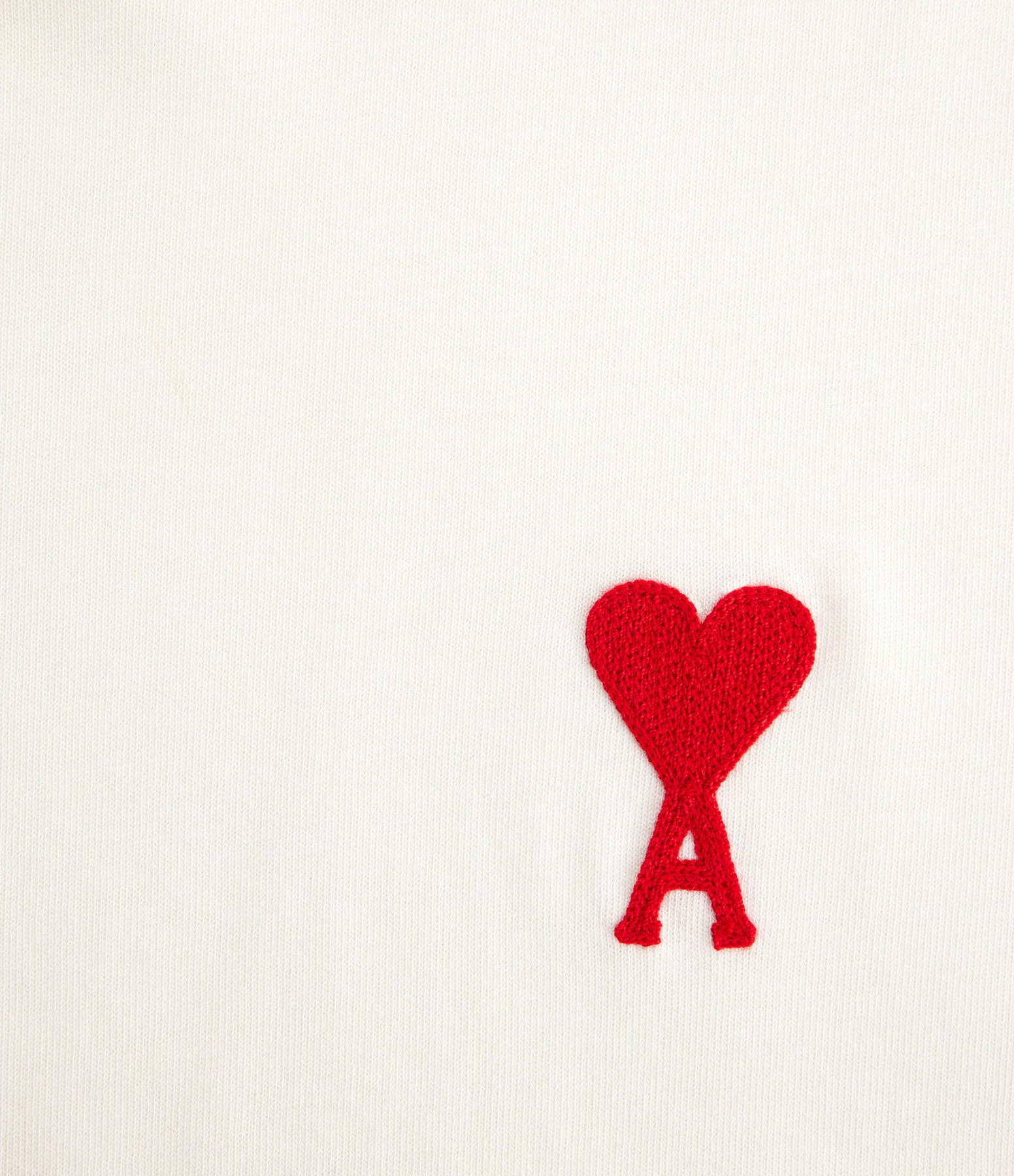 Tee-shirt unisexe en coton blanc avec logo rouge “Ami de cœur” brodé sur la poitrine. Col rond côtelé. Manches courtes. Coupe droite. Base droite.
