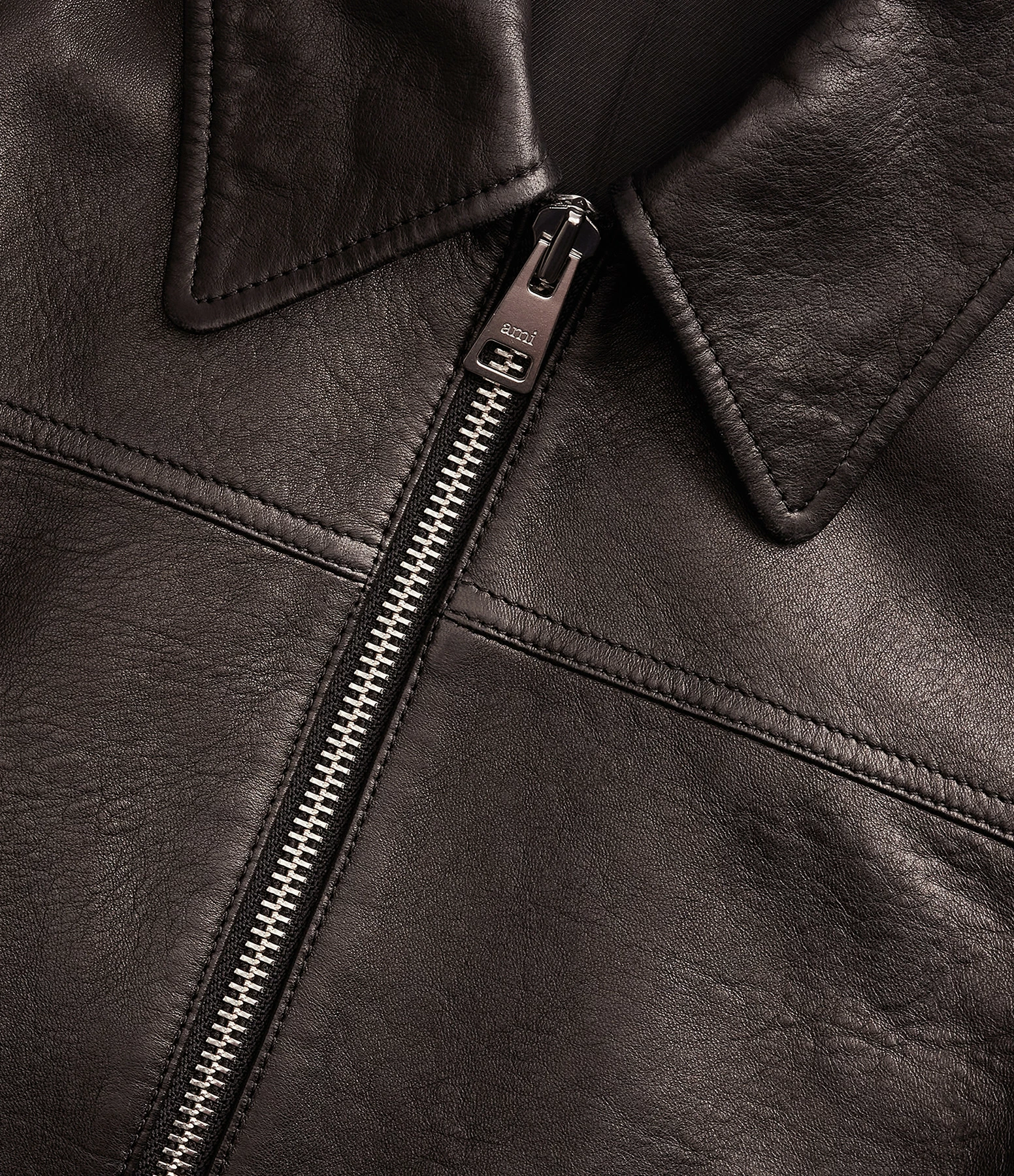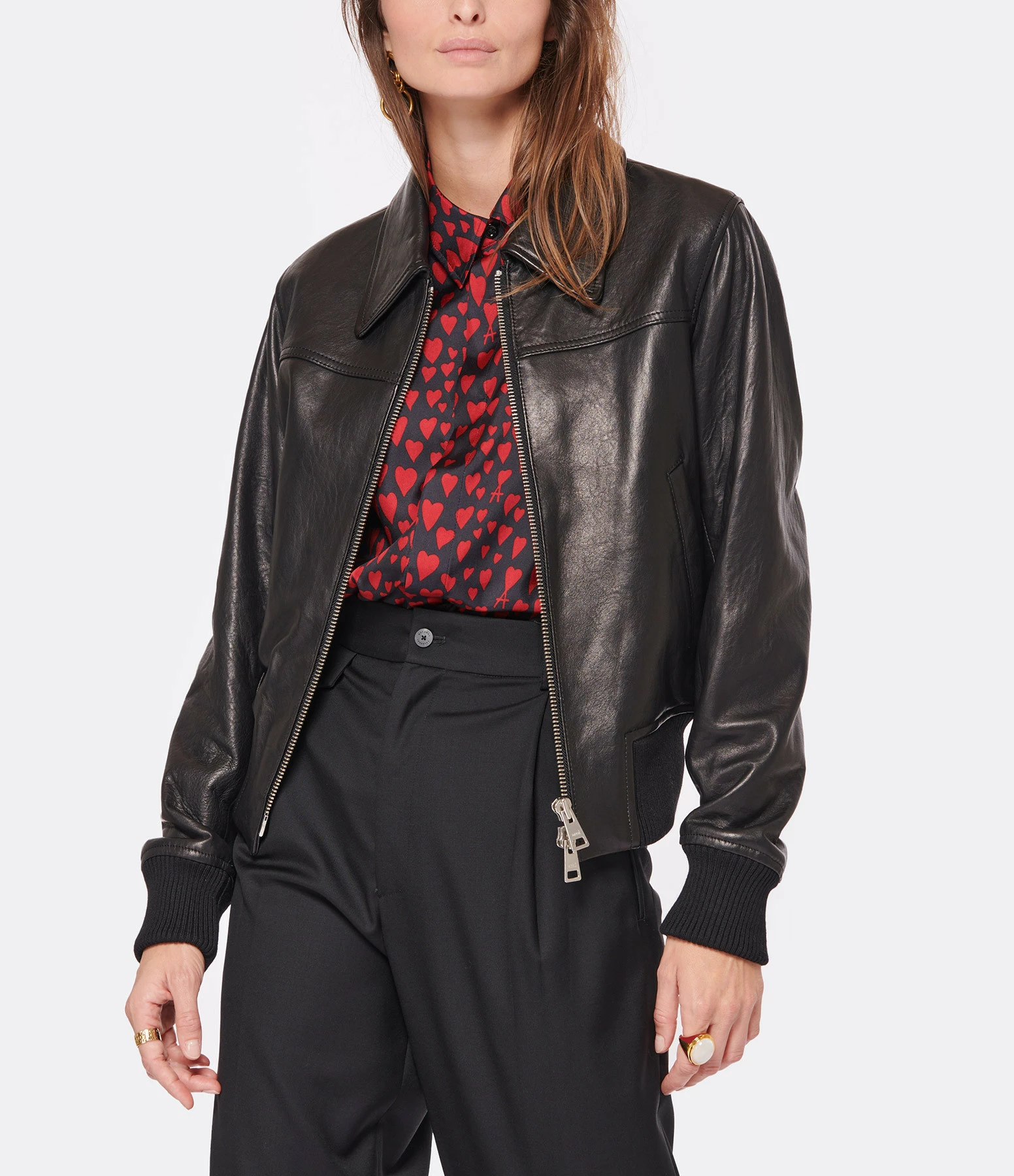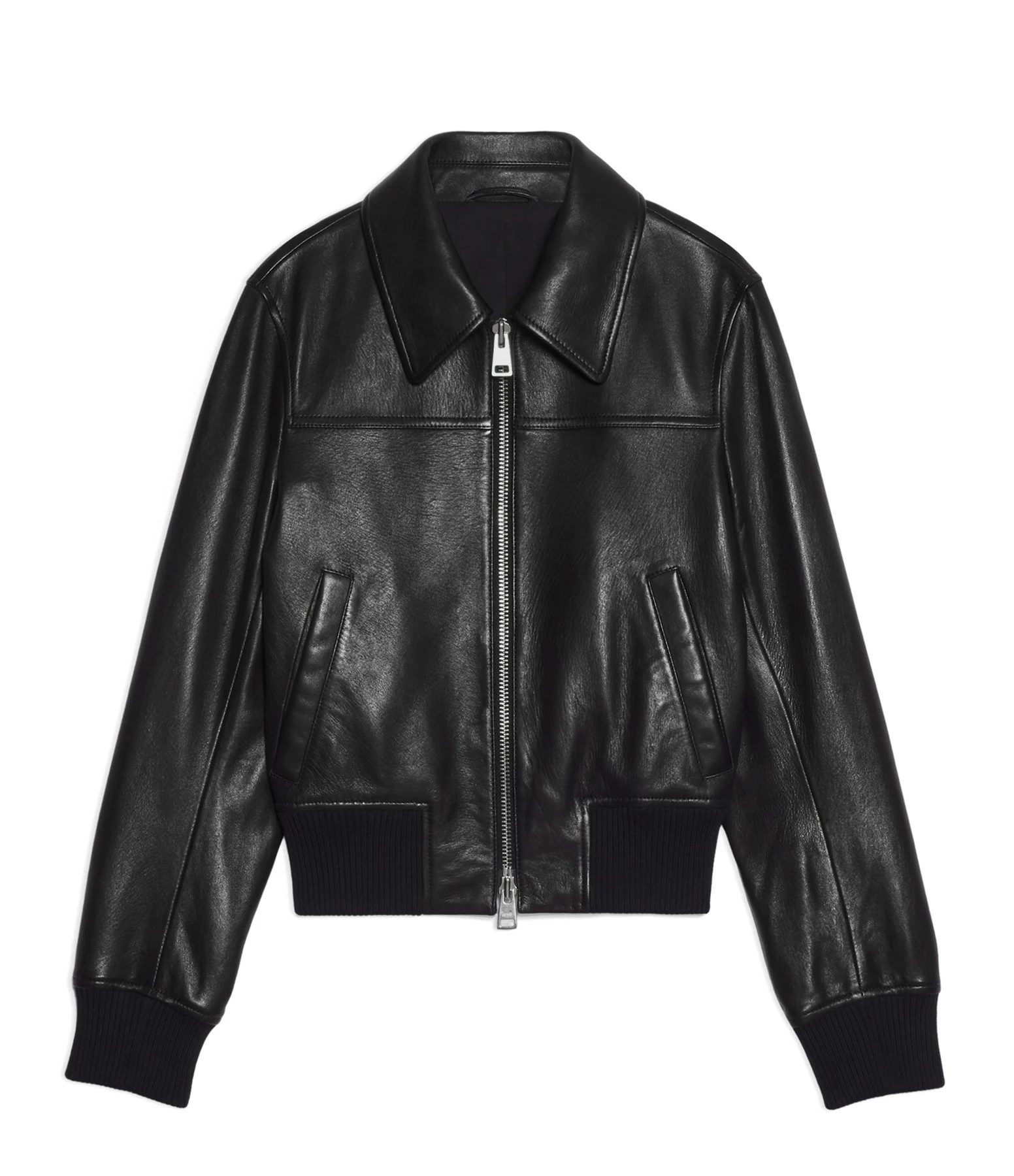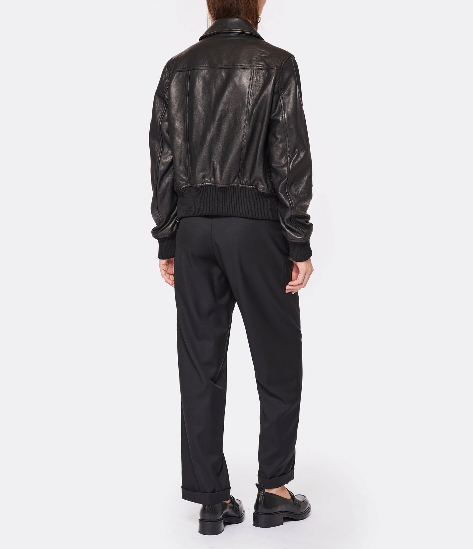 Veste bomber en cuir noir. Col chemisier. Manches longues. Fermeture zippée. Deux poches raglans. Coupe droite. Base droite élastiquée.