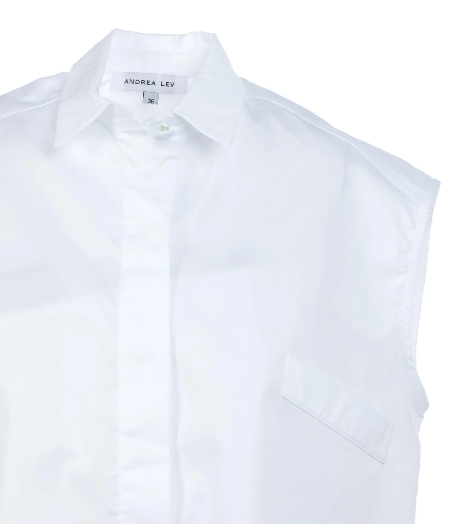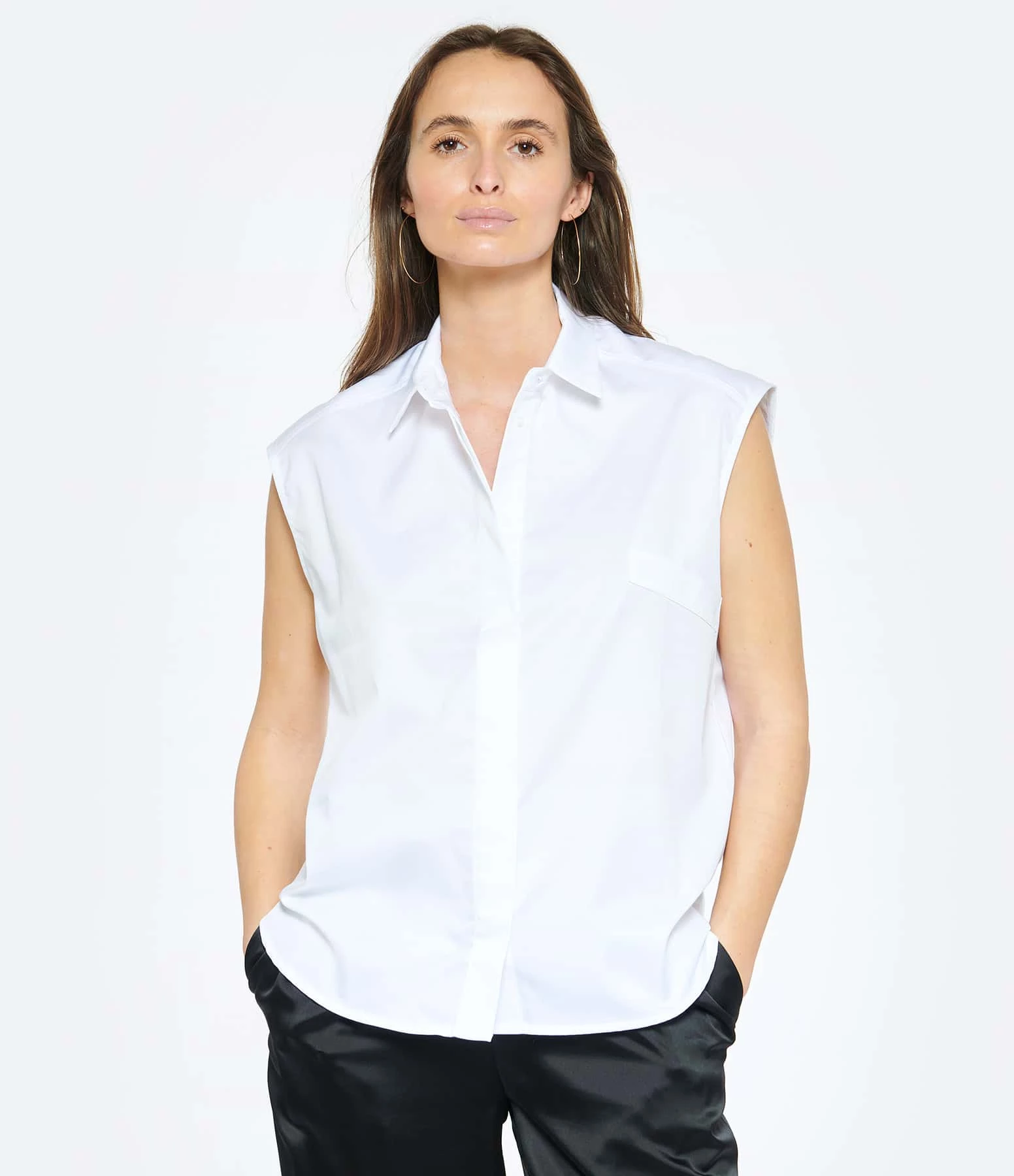 Chemise sans manches en coton blanc. Col chemise. Fermeture boutonnée. Une poche passepoilée en biais sur le côté. Coupe droite. Base droite.