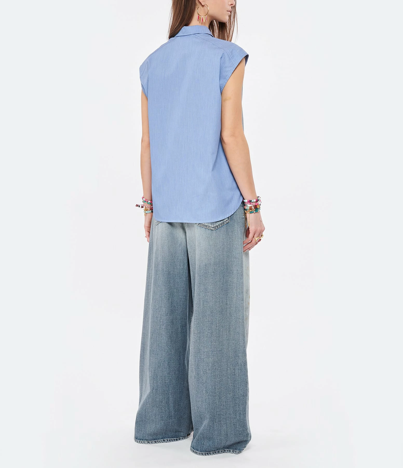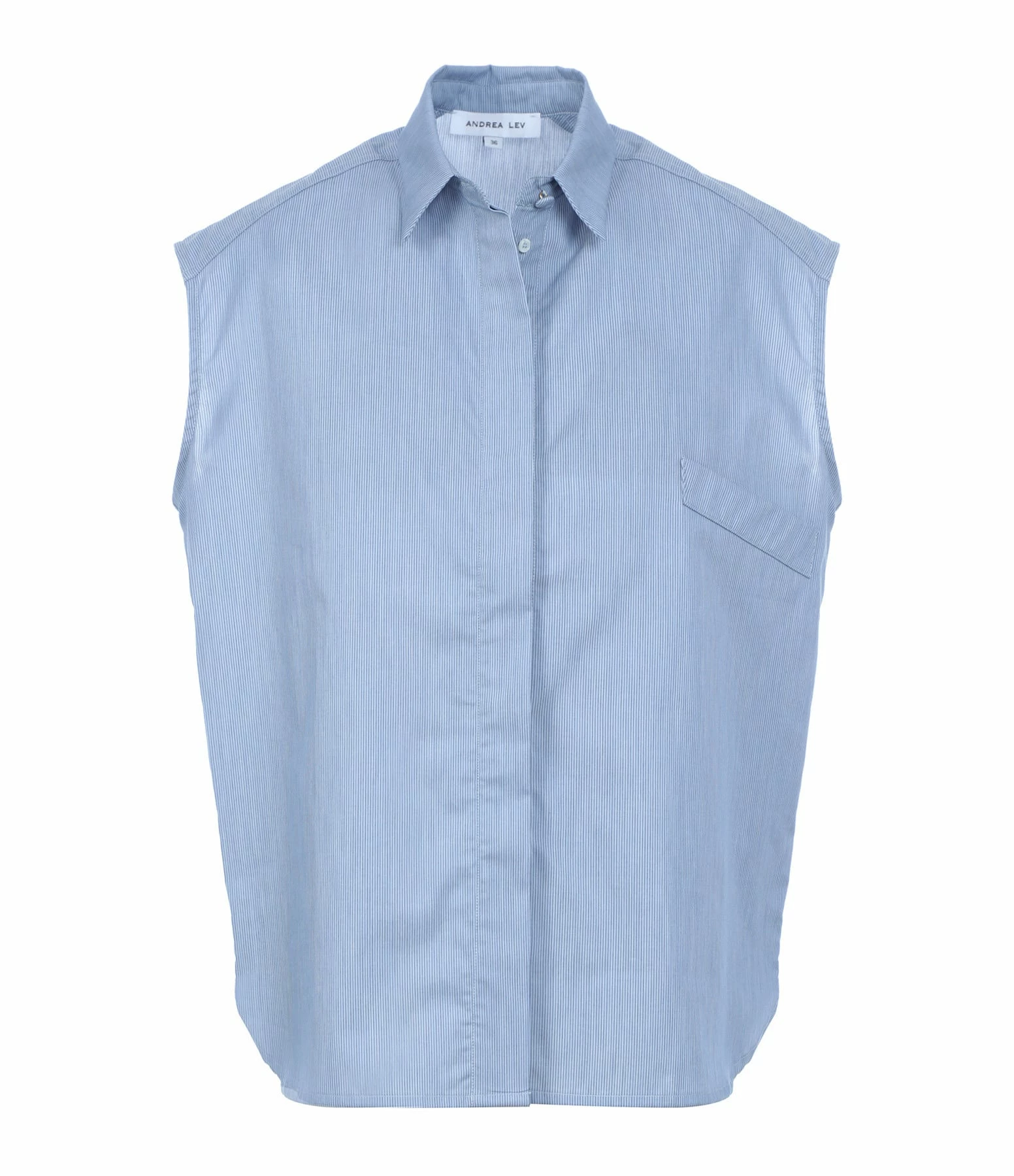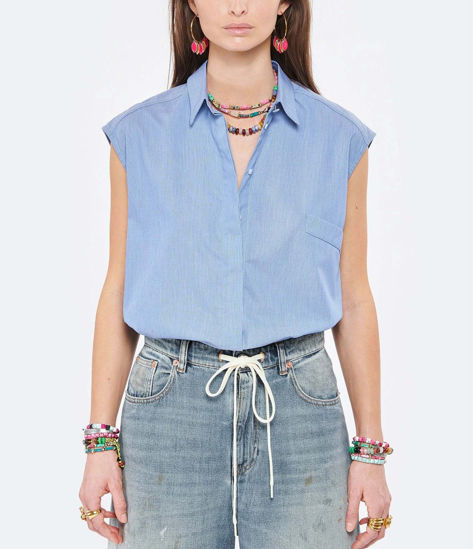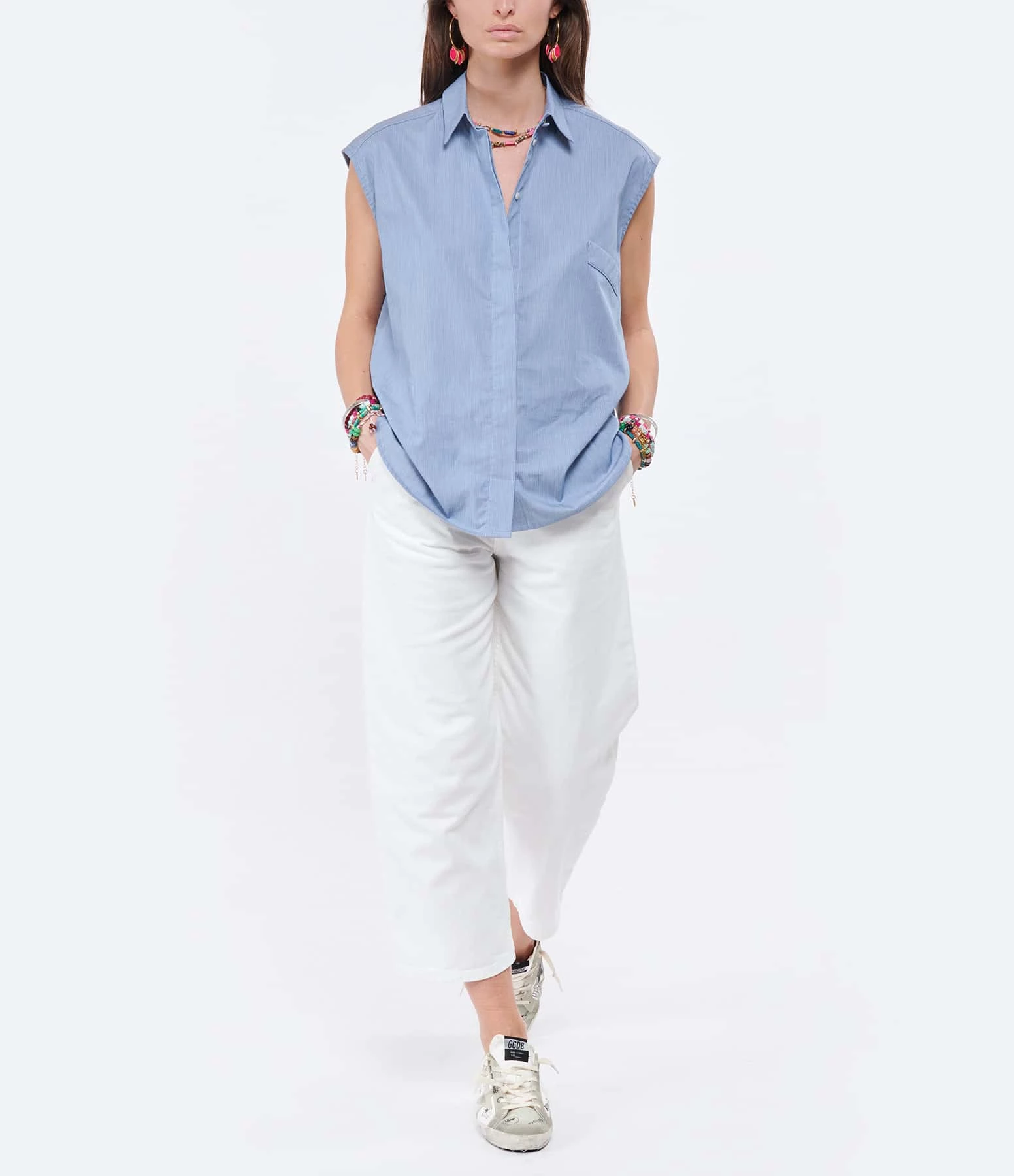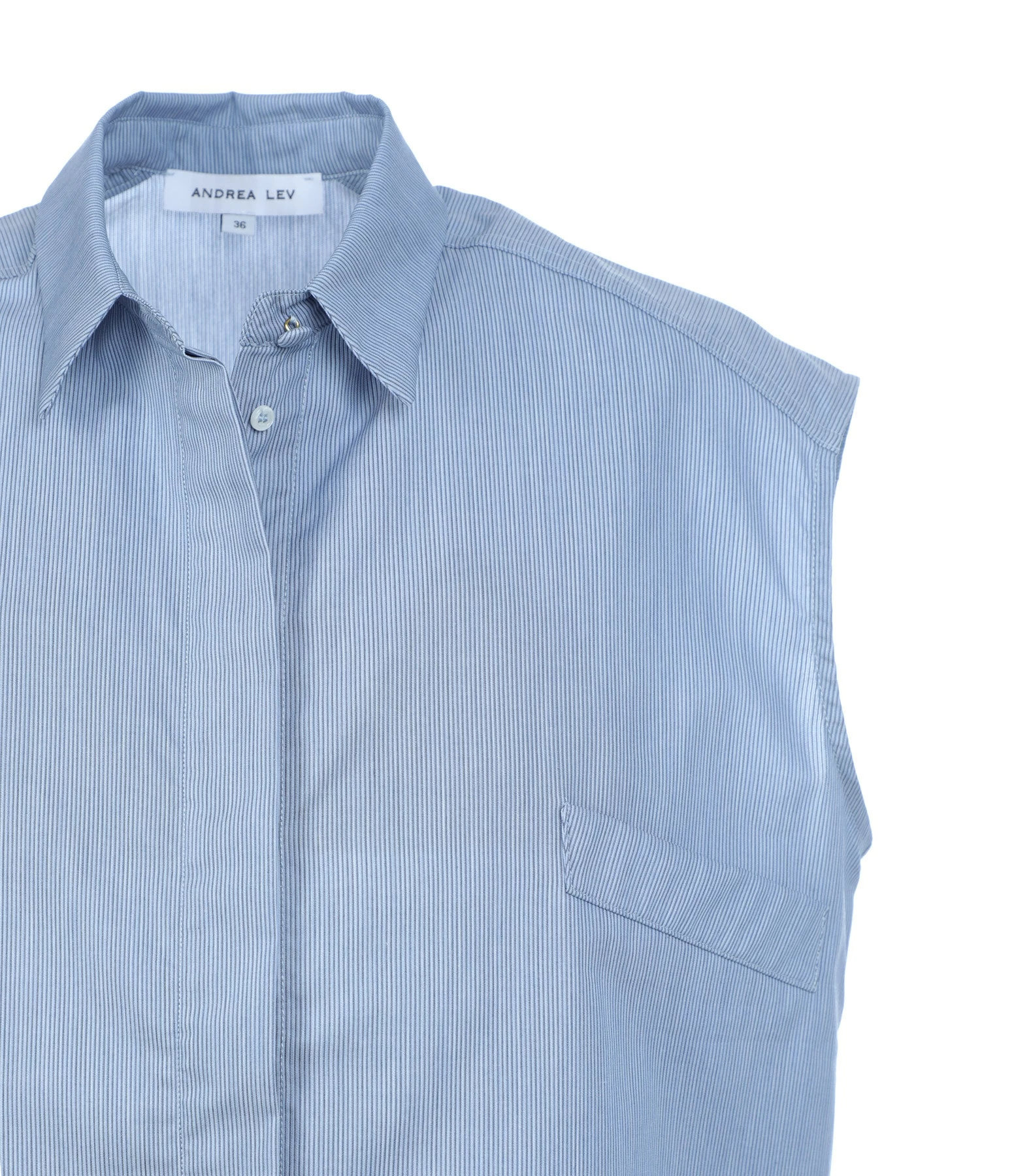 Chemise sans manches en coton à rayures bleues. Col chemise. Fermeture boutonnée. Une poche passepoilée en biais sur le côté. Coupe droite. Base droite.
