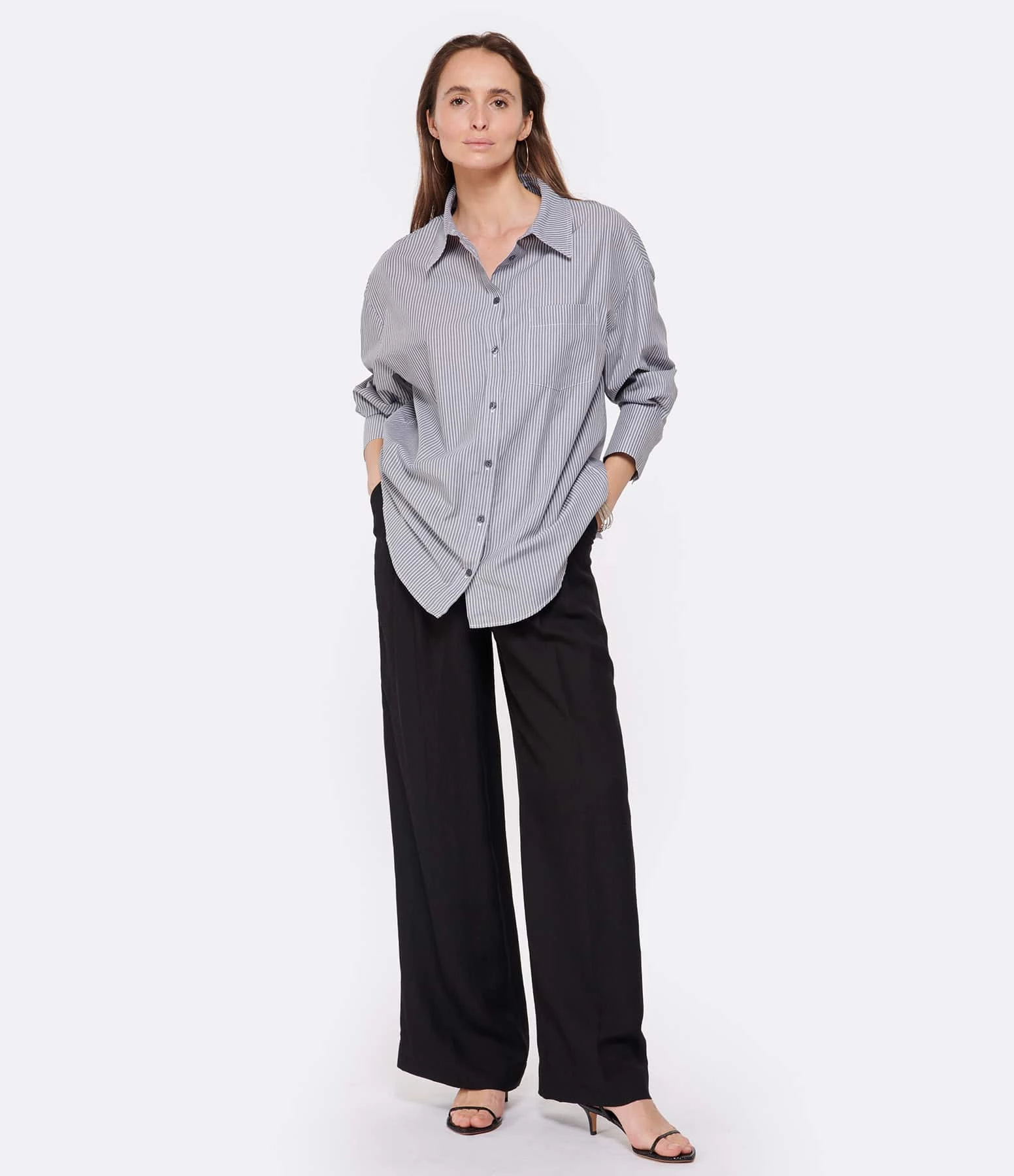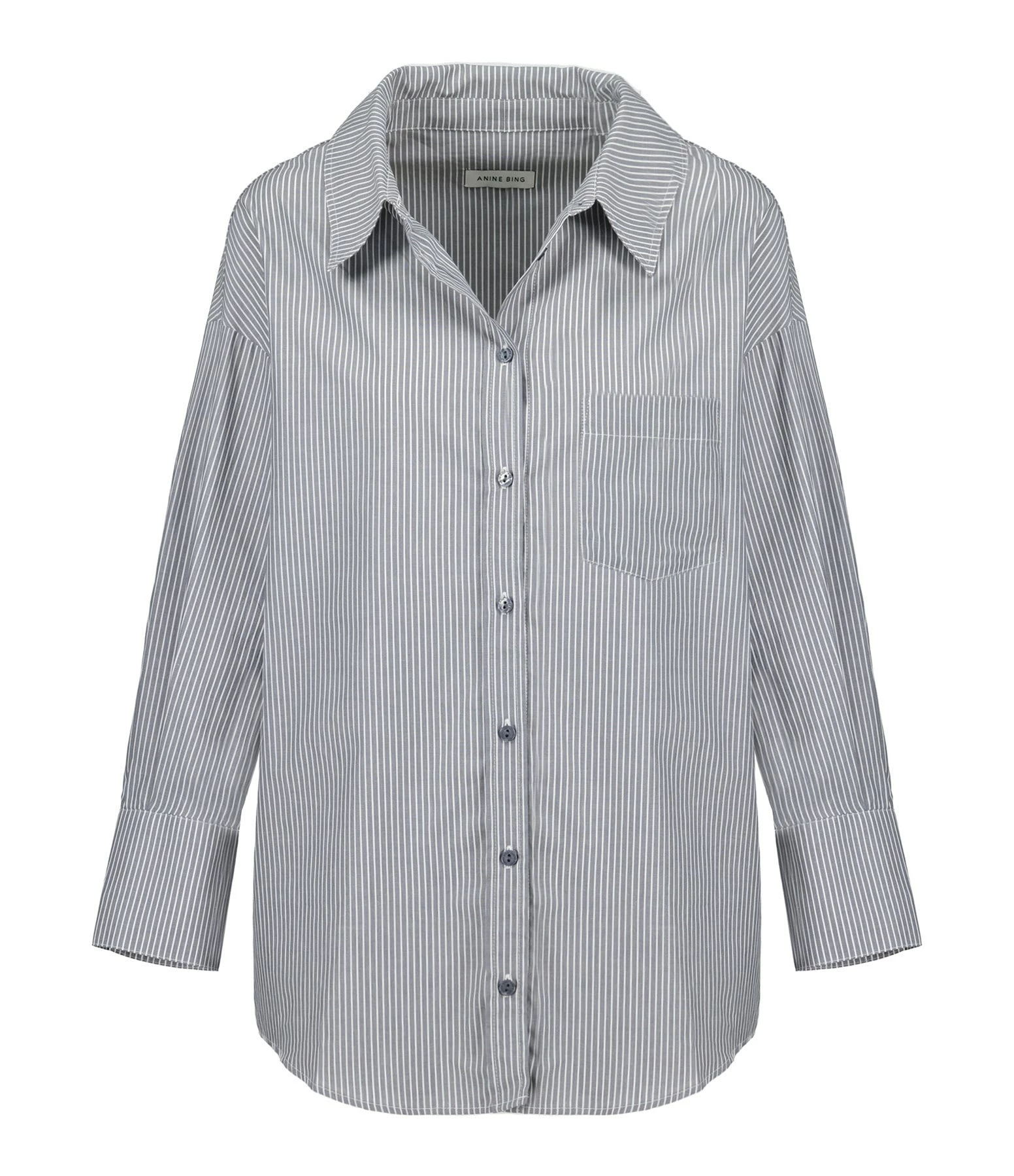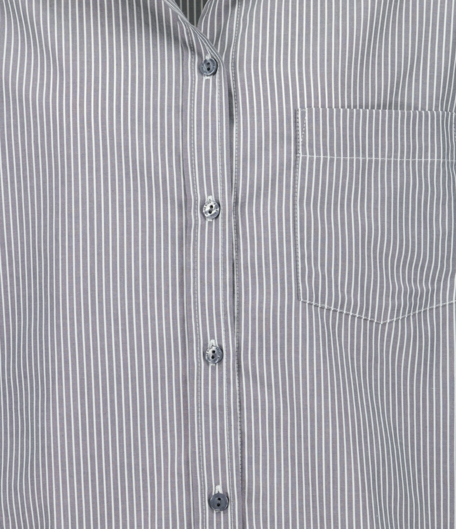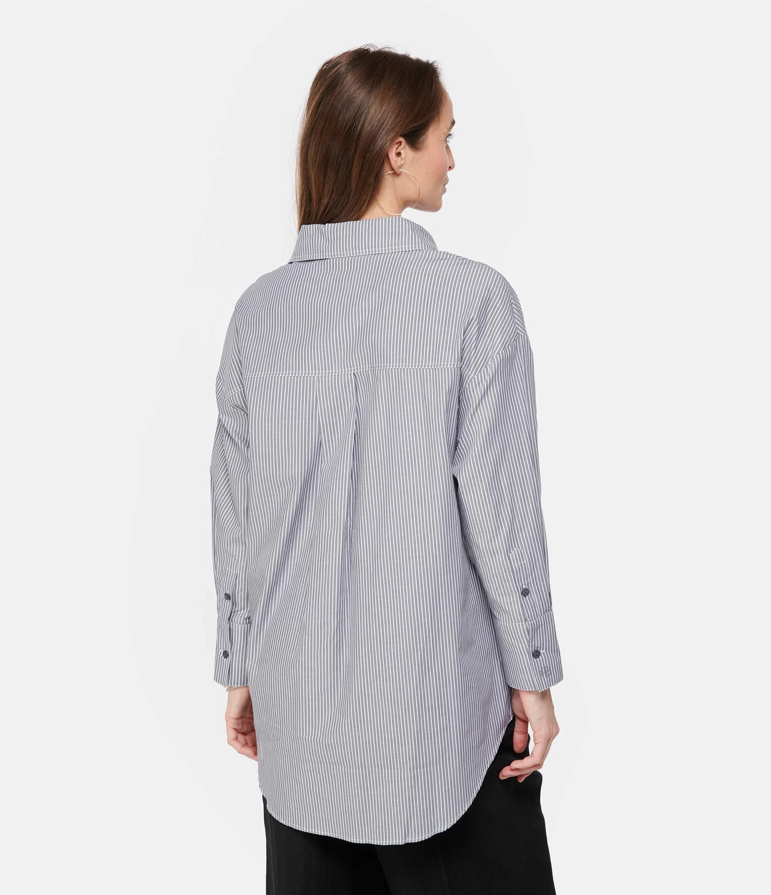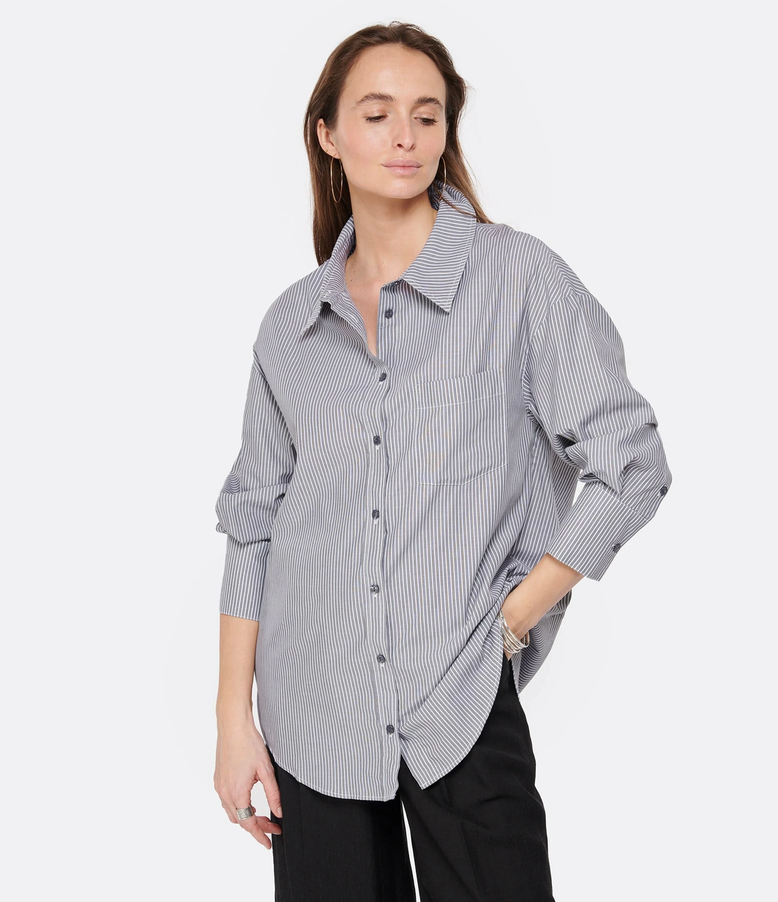 Chemise en popeline de coton imprimé à rayures grises et blanches. Col chemisier. Manches longues avec fentes et poignets boutonnés. Logo brodé en bleu sur le poignet droit. Fermeture boutonnée sur le devant. Petits boutons bleus nacrés. Une poche plaquée sur le devant. Pli creux dans le dos. Coupe ample. Longueur plus courte sur le devant que dans le dos. Base arrondie.