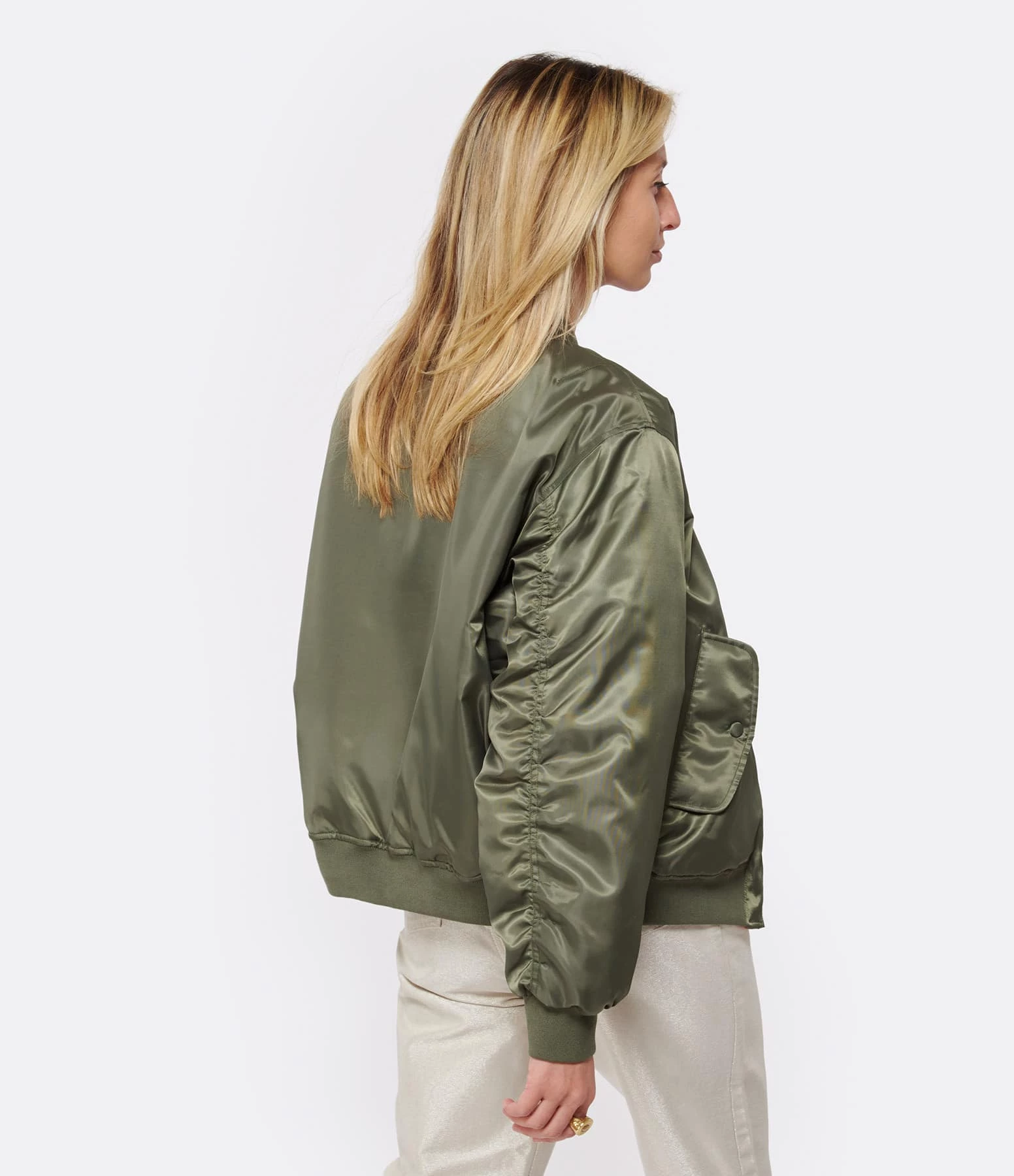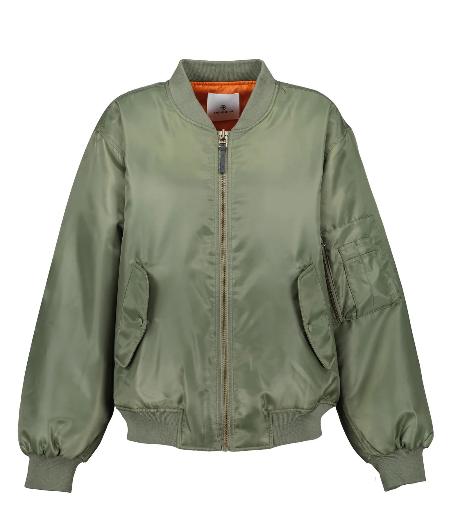 Veste bomber kaki. Deux poches à rabat sur le devant, une poche zippée sur la manche. Fermeture par zip. Doublure intérieure en orange. Coupe oversize. Base droite.