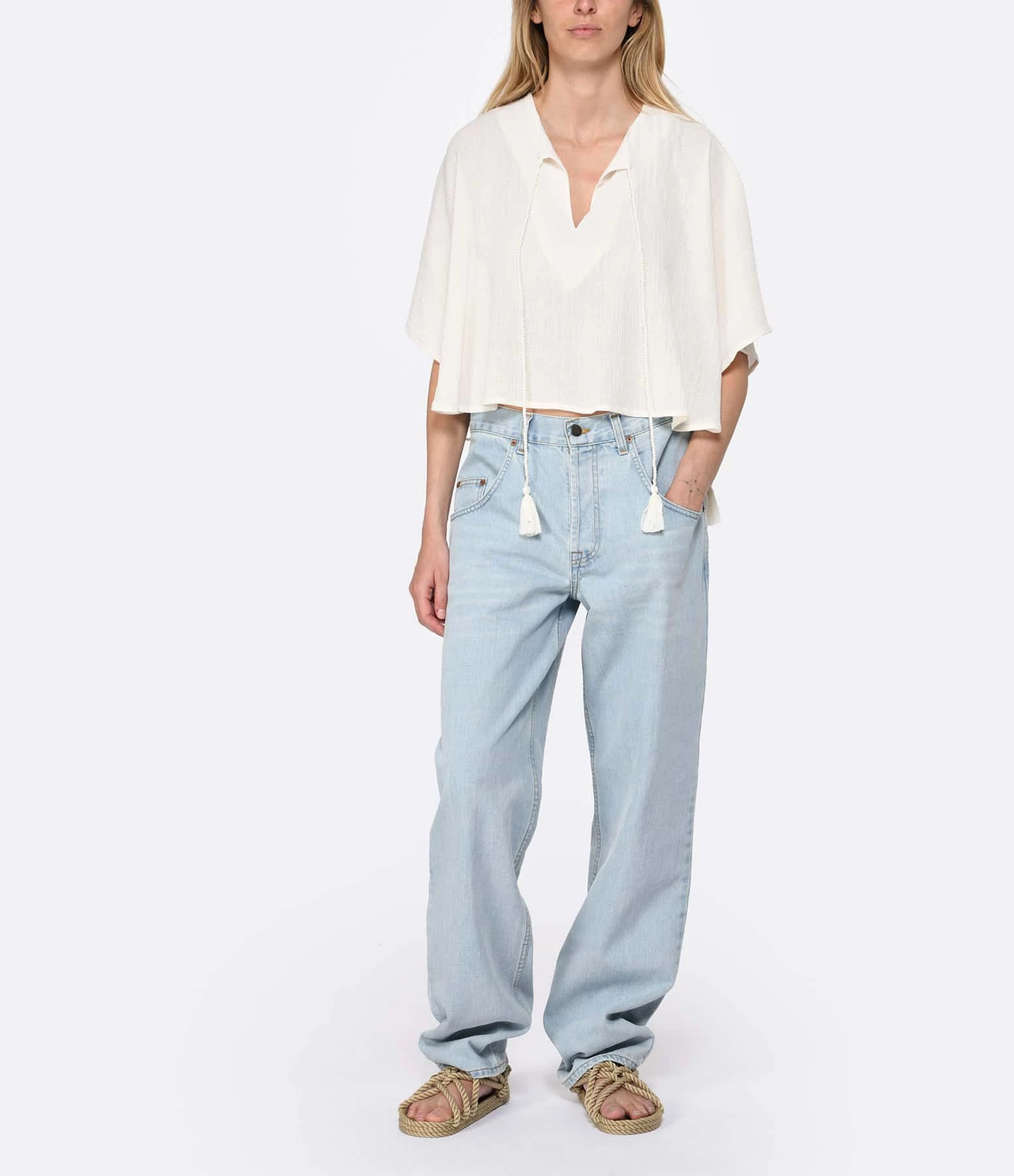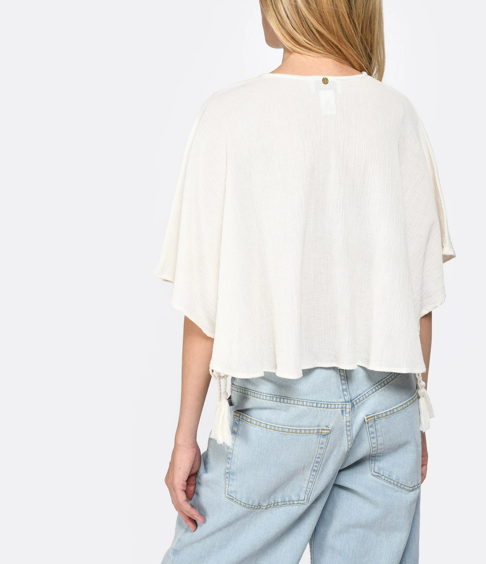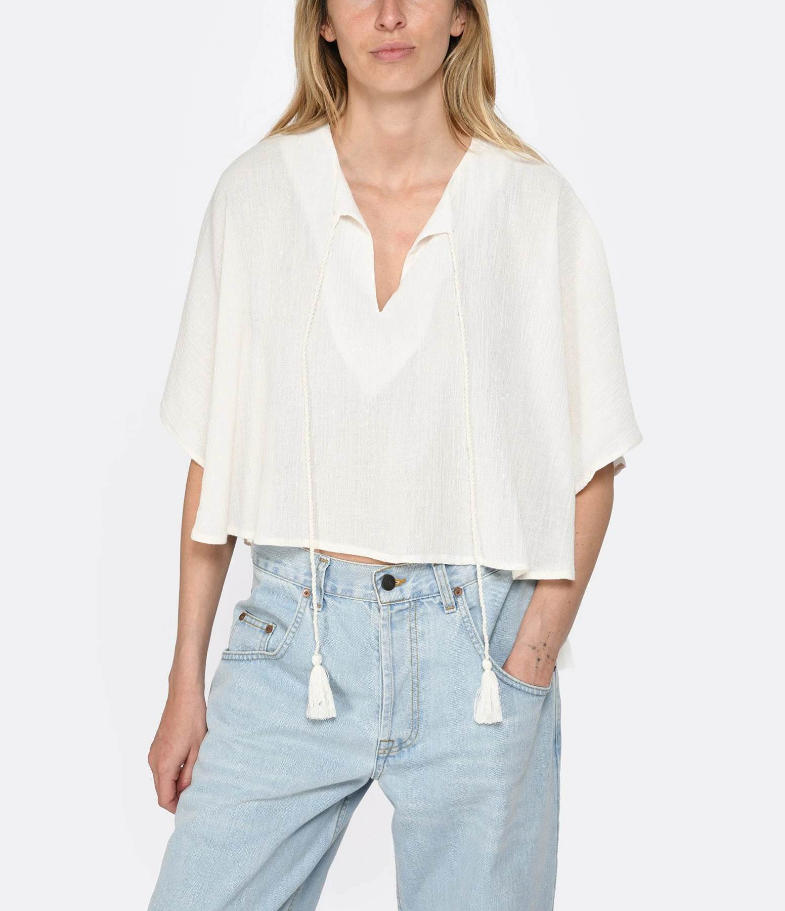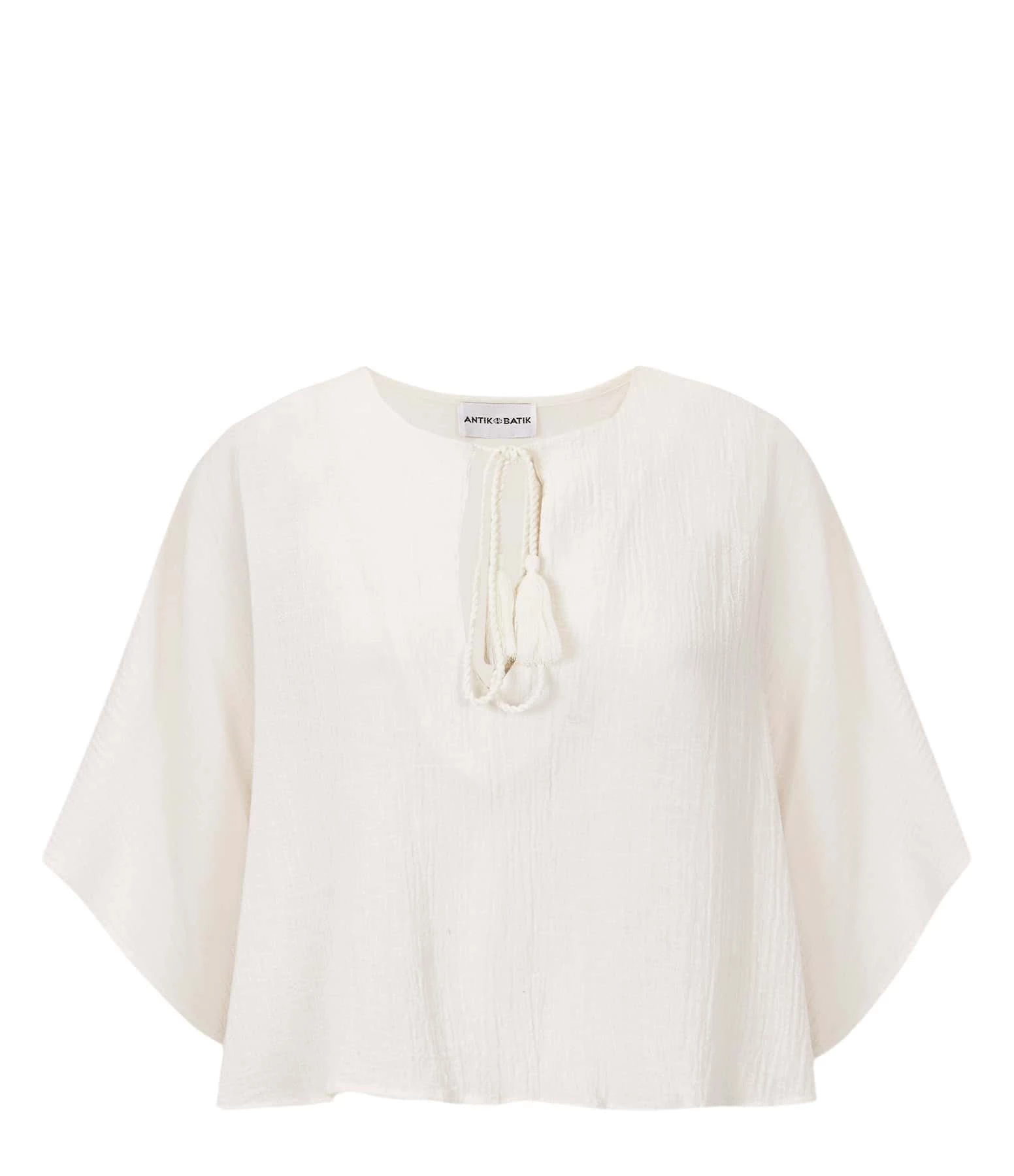 Blouse en coton uni crème. Col rond avec cordon de serrage crème à pompons. Manches trois-quarts effet chauves-souris. Coupe évasée. Base droite.
