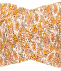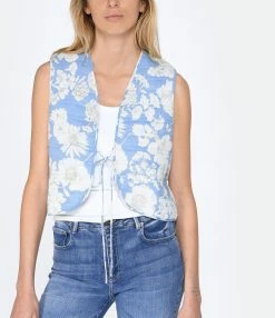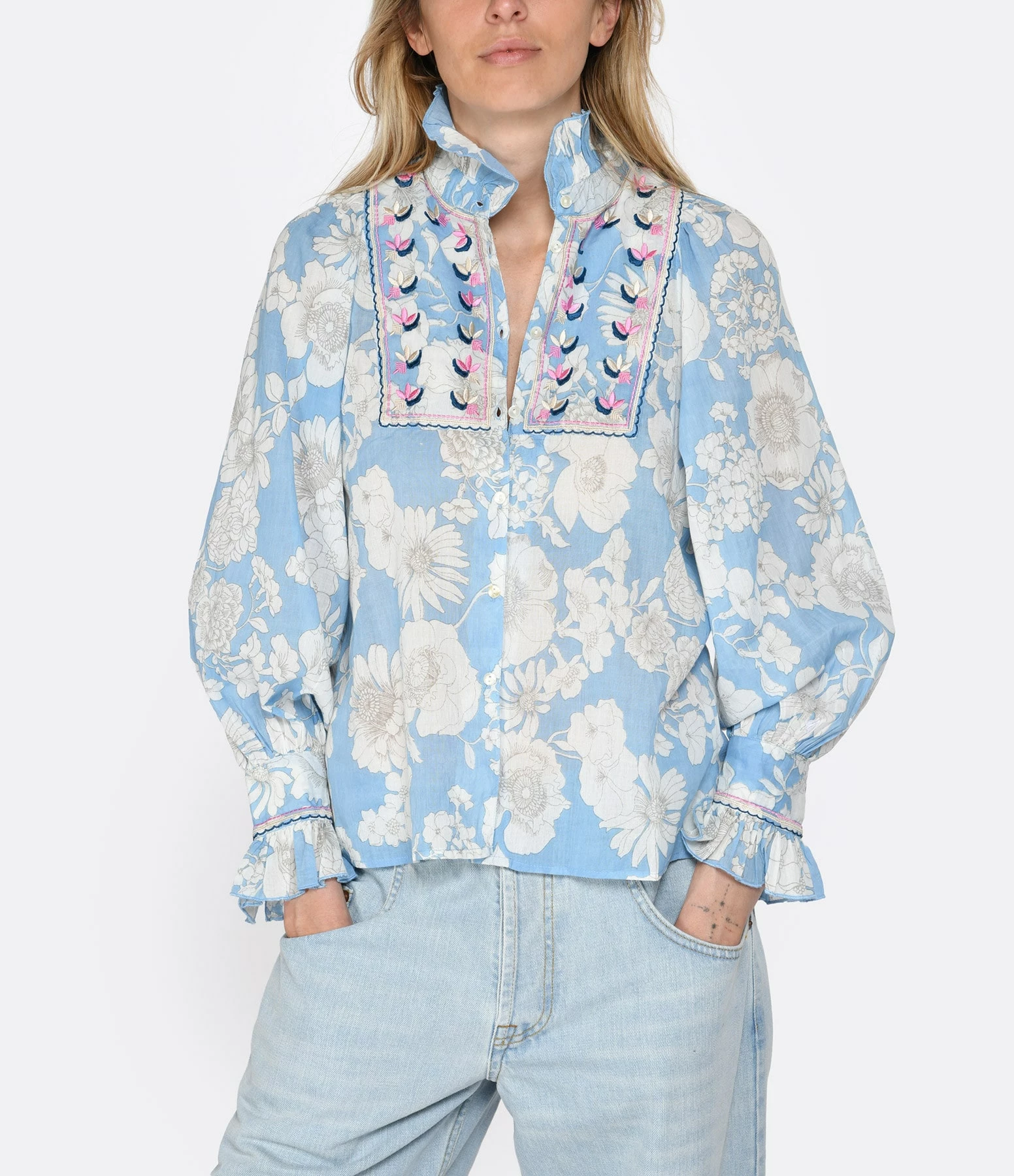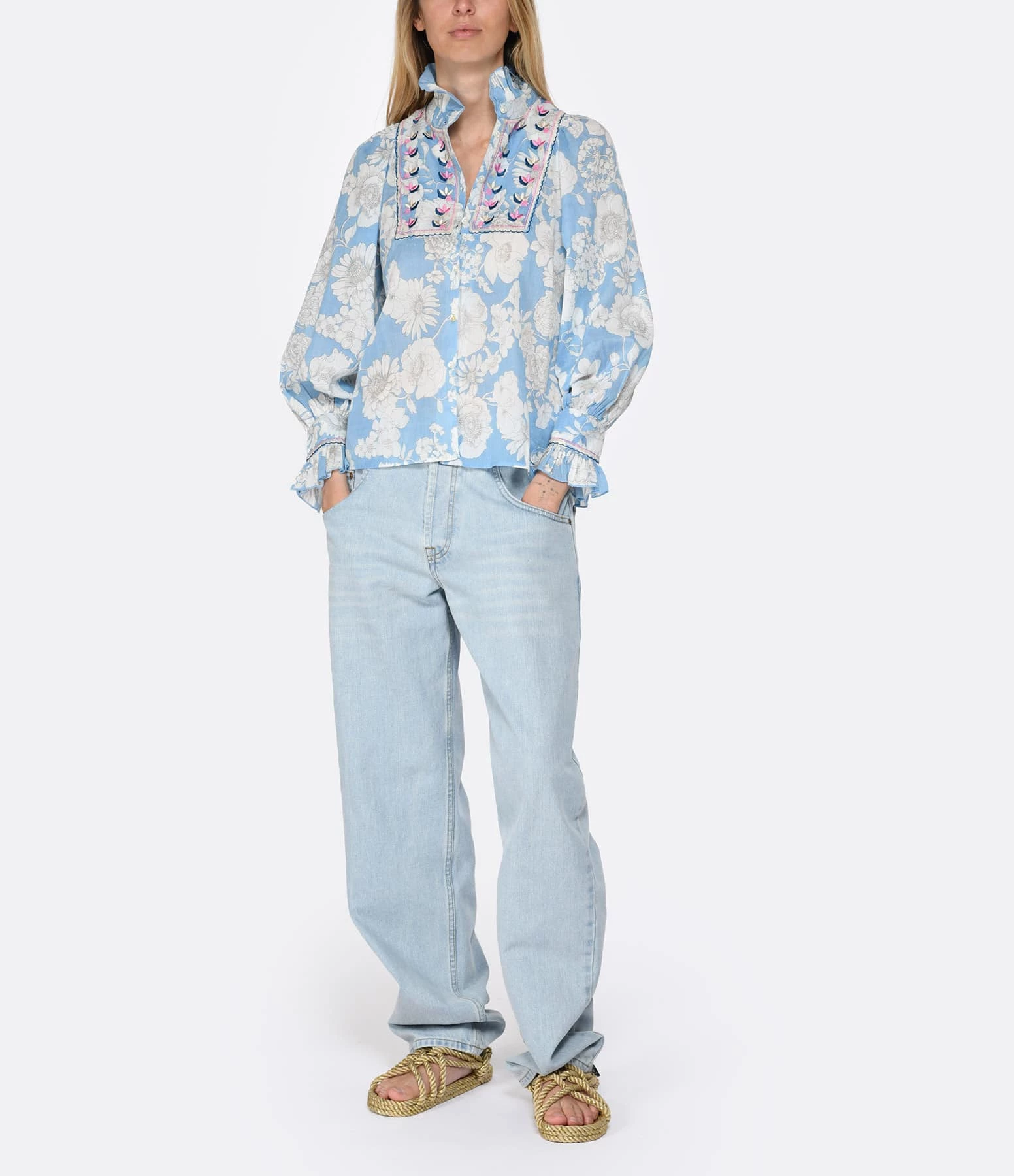 Blouse à imprimé fleuri sur fond bleu. Détails brodé en bleu et rose fluo au niveau supérieur du buste. Col montant volanté. Fermeture par boutons nacrés blancs sur le devant. Manches longues avec poignets resserrés par boutons et volants. Coupe droite. Base droite.