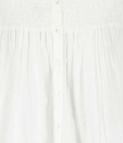 Jupe longue évasée blanche. Fermeture bar bouton blanc sur le devant. Plissée à la taille et sur plusieurs niveaux de la jupe. Coupe évasée. Base droite.