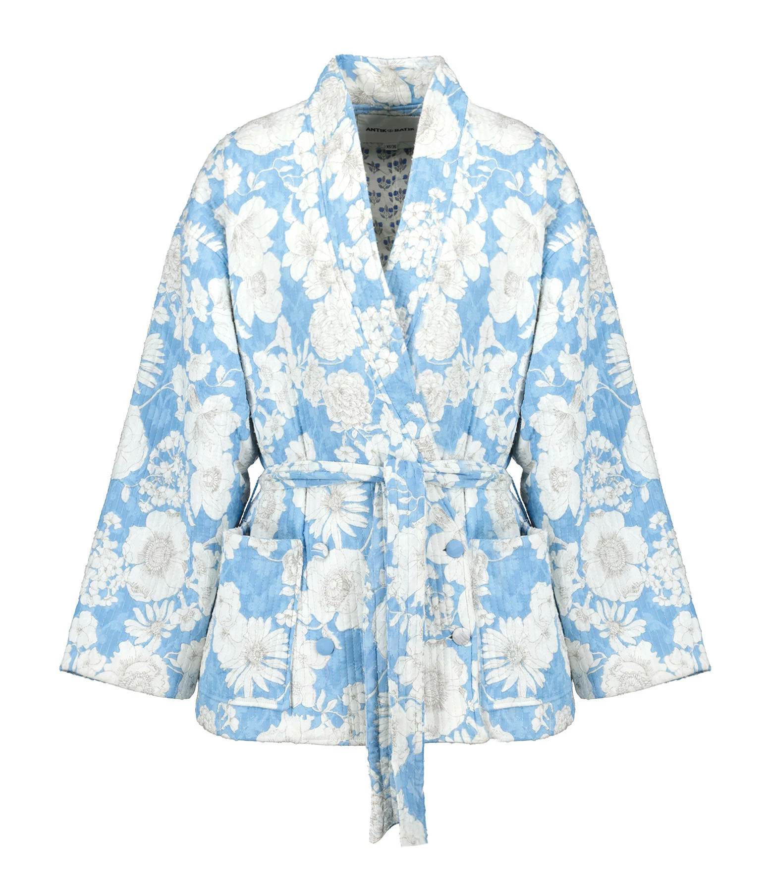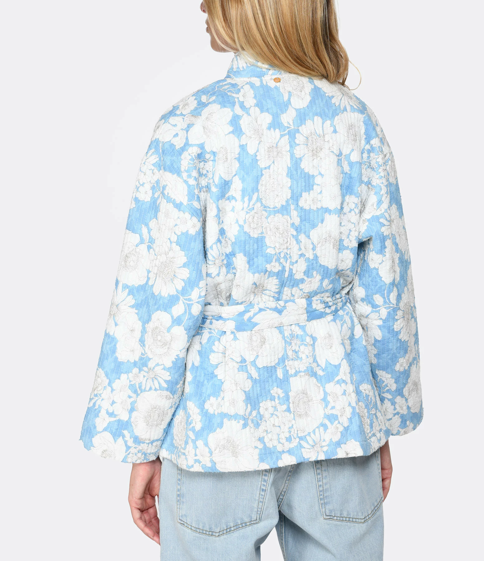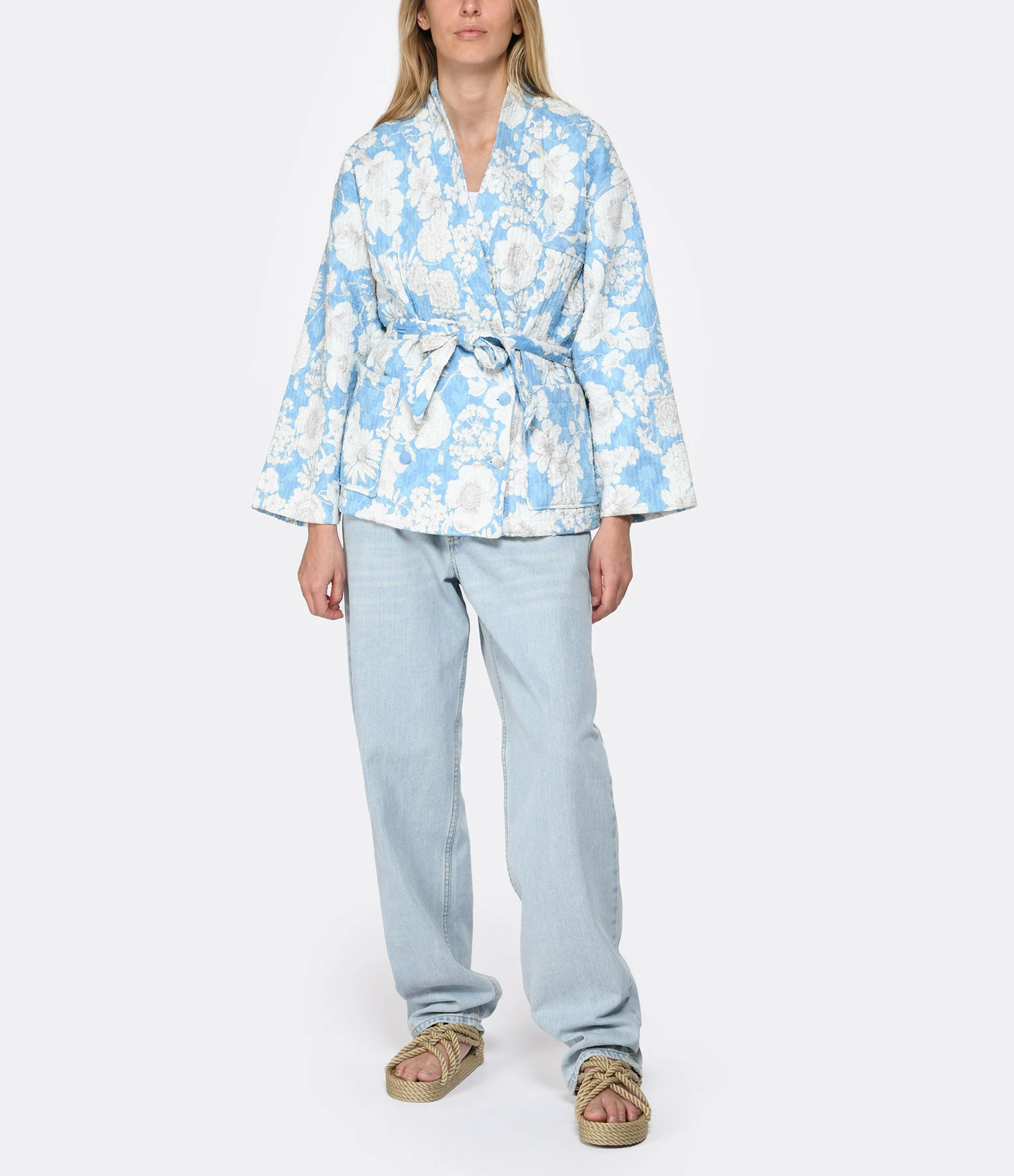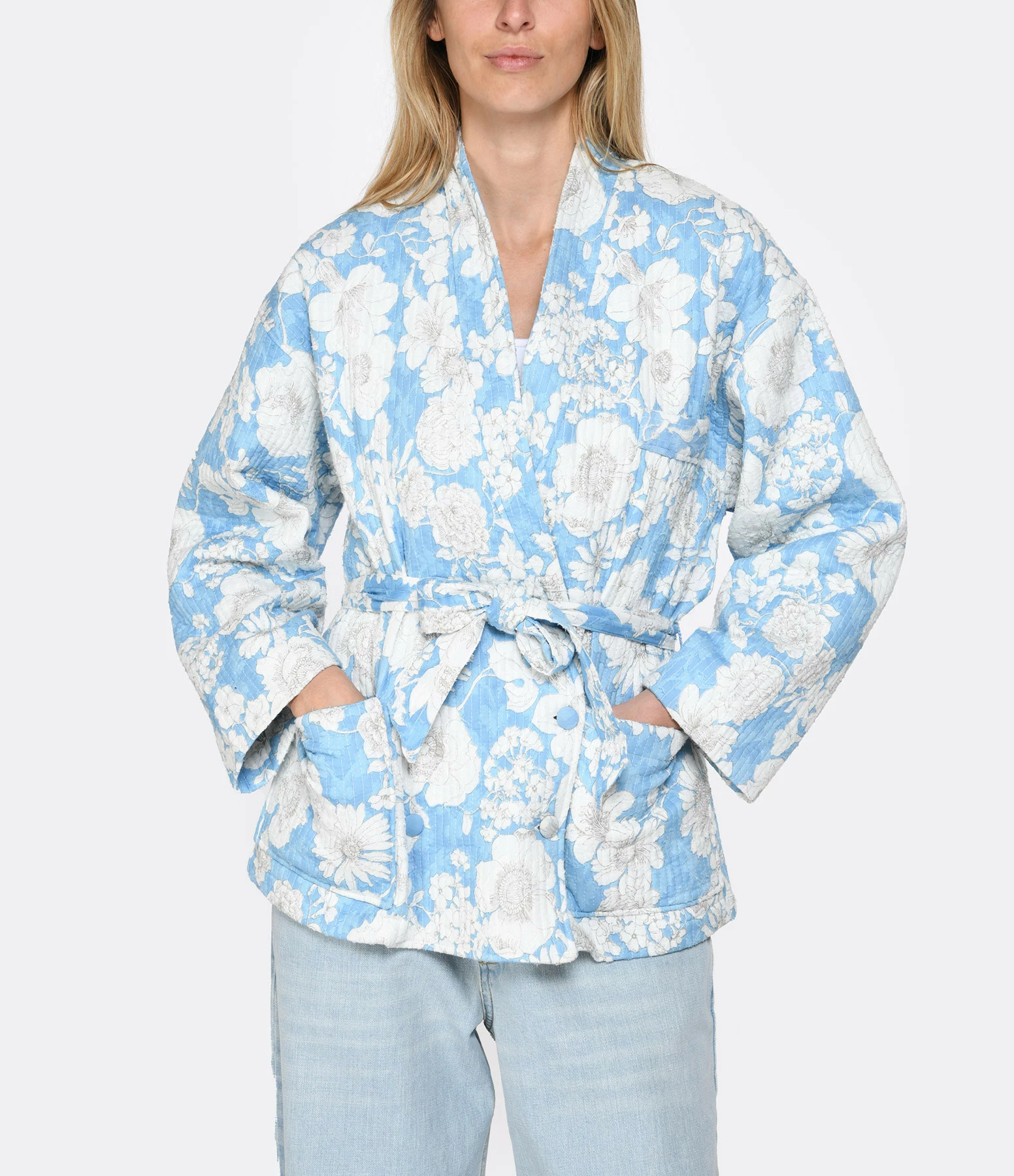Veste effet kimono à imprimé fleuri sur fond bleu. Trois poches sur le devant dont une passepoilée côté cœur. Ceinture ajustable à la taille à imprimé. Fermeture par boutons sur le devant. Manches longues. Coupe droite. Base droite.