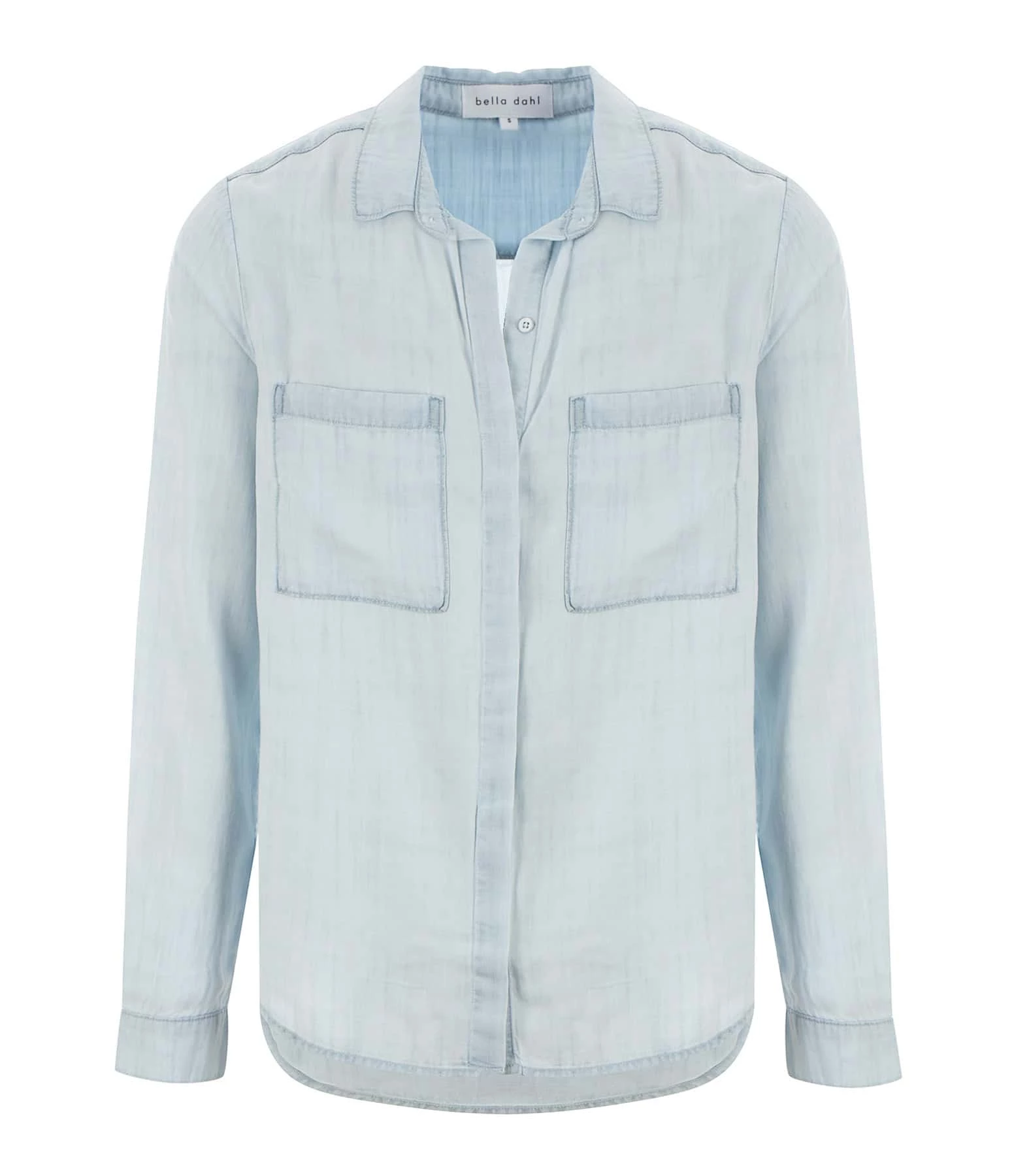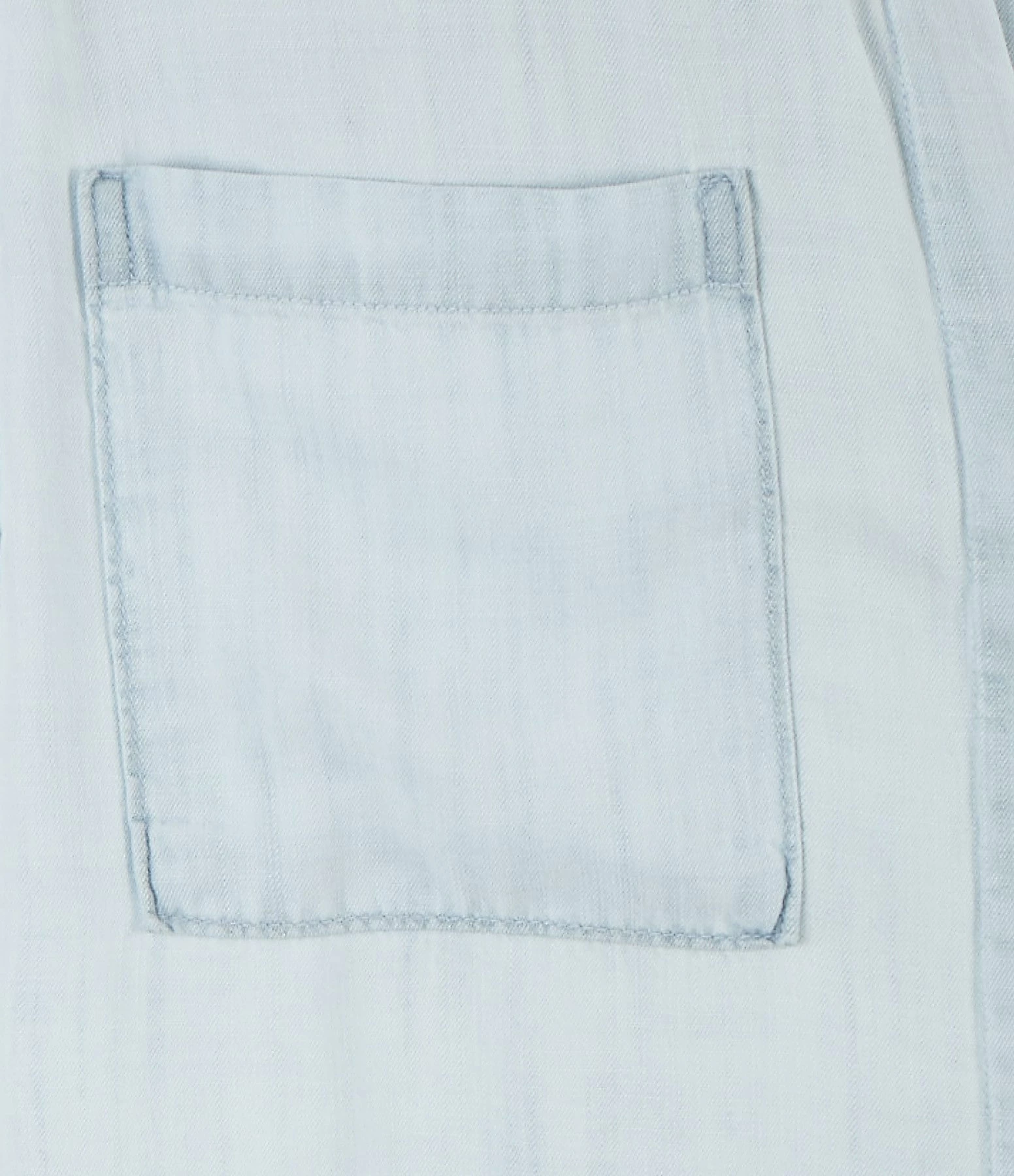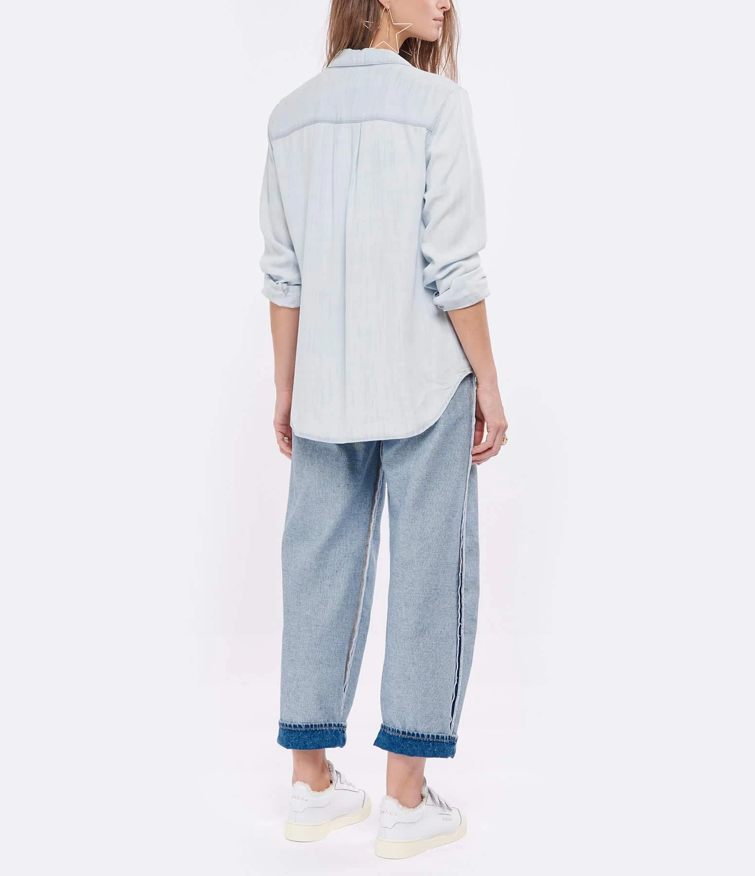 Chemise en denim bleu clair. Col chemise. Manches longues. Deux poches plaquées à l’avant. Fermeture par boutons. Plus courte à l’avant. Coupe droite. Base arrondie.