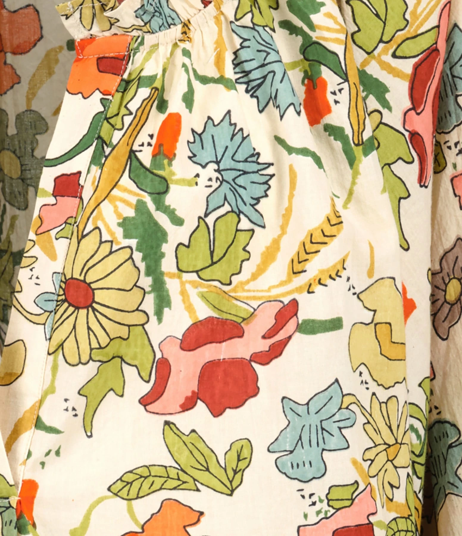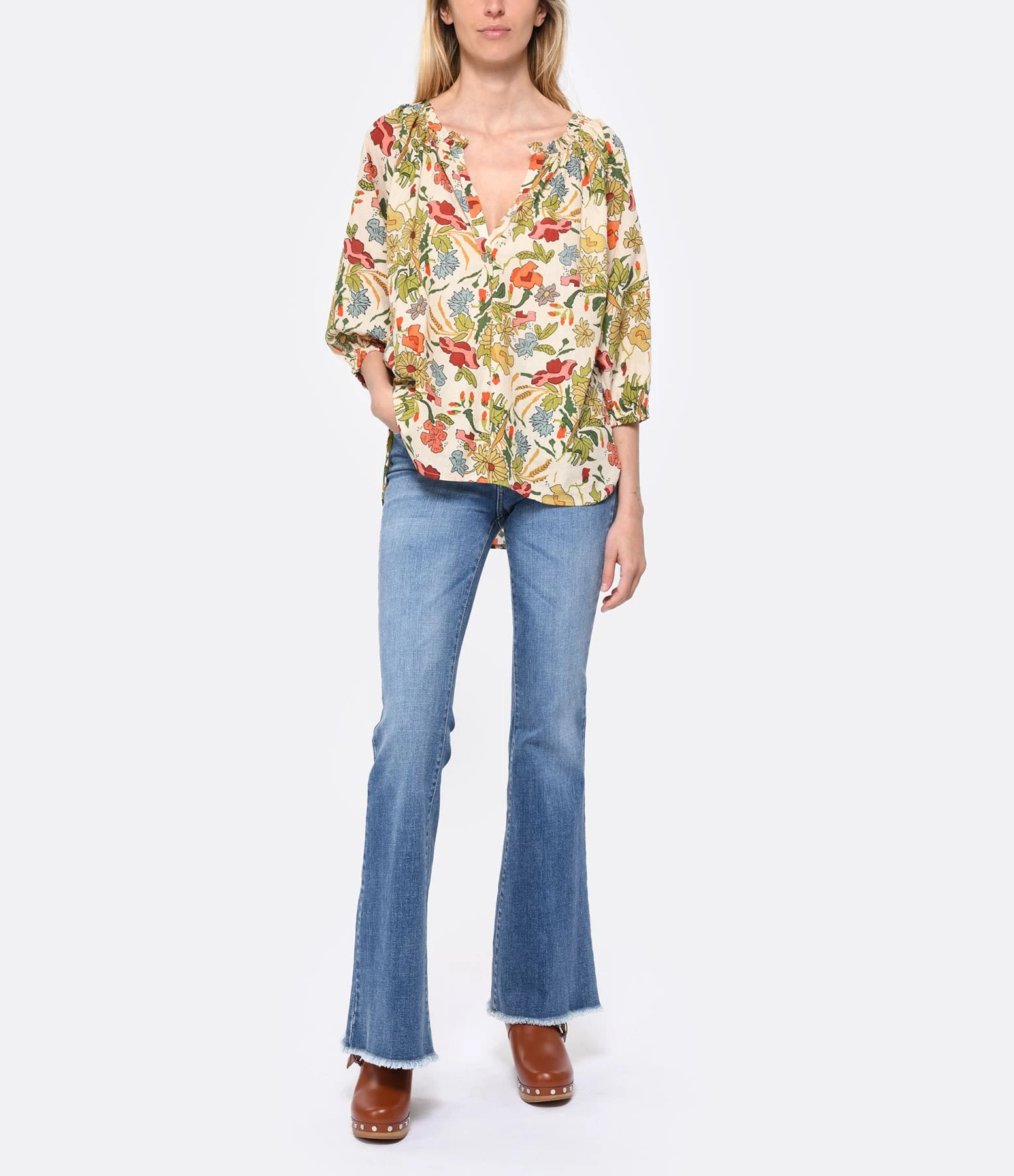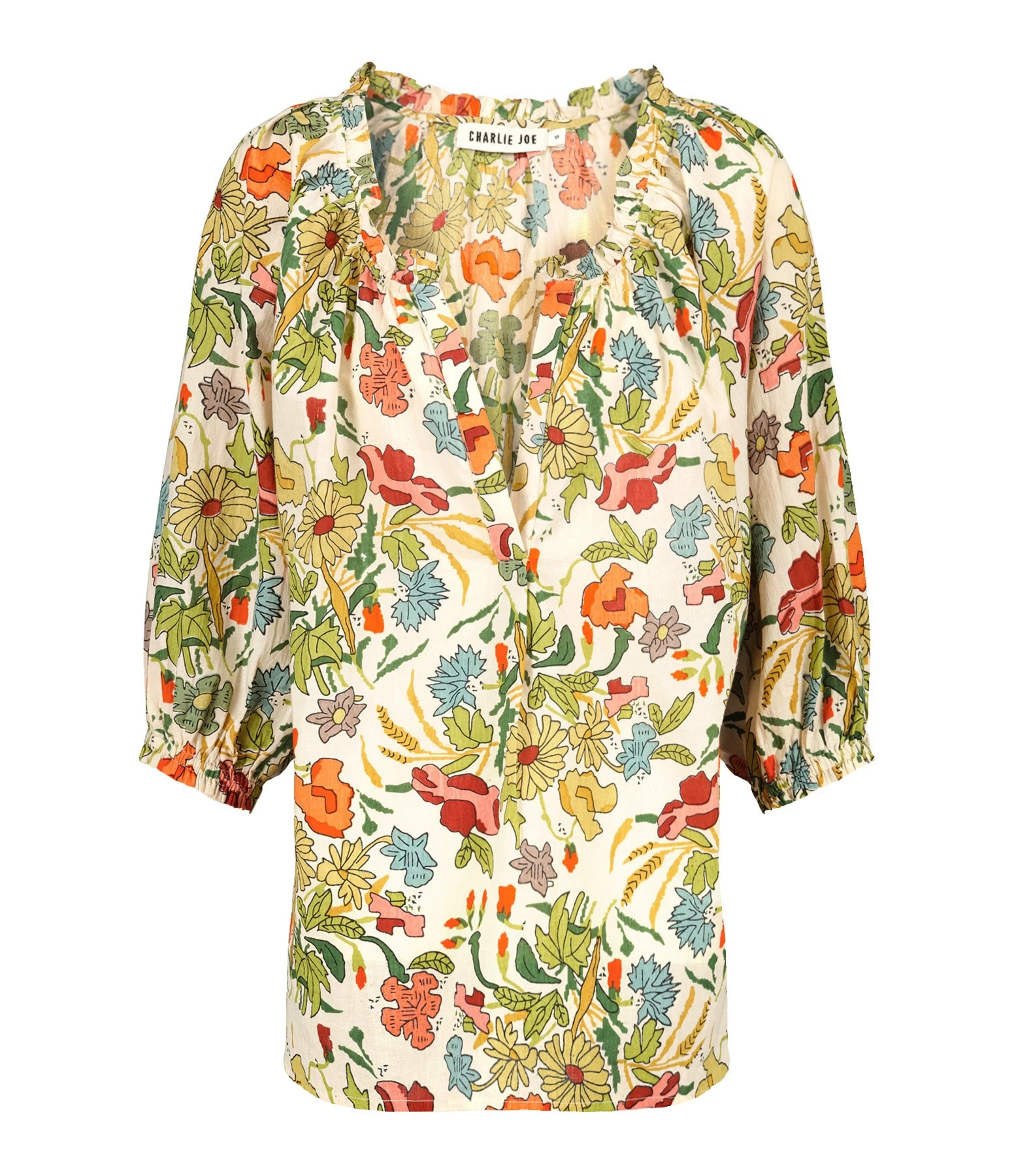 Blouse en coton à imprimé multicolore. Manches longues bouffantes élastiquées aux poignets. Col en V. Coupe droite. Base droite.