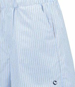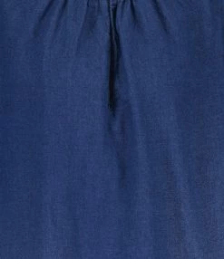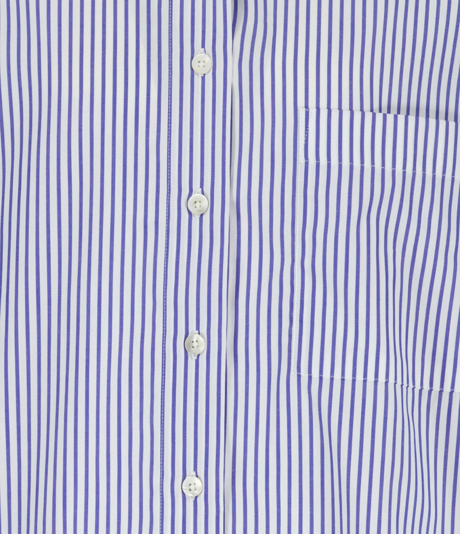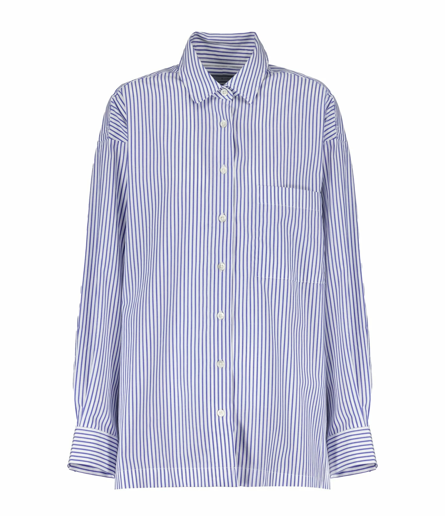 Chemise en coton rayée bleu et blanc. Col à pointes. Poche plaquée sur la poitrine. Fermeture par boutons nacré. Coupe ample. Base droite avec fentes sur les côtés.