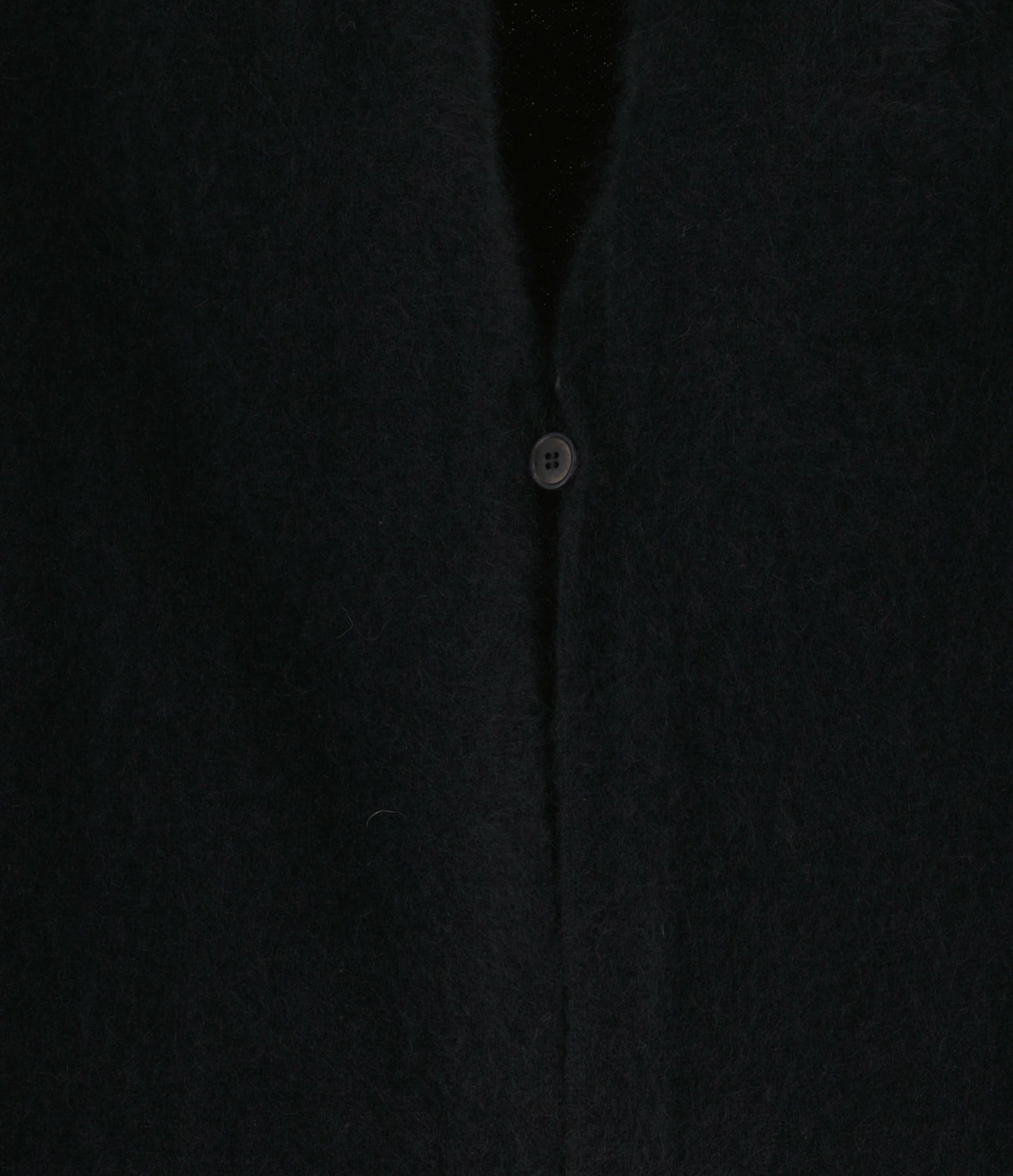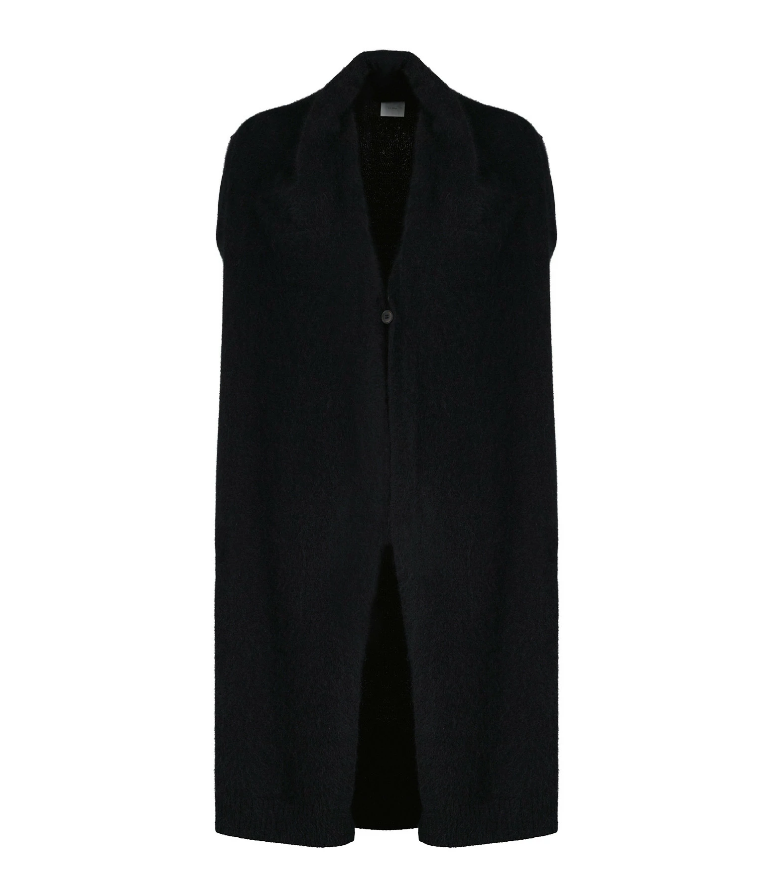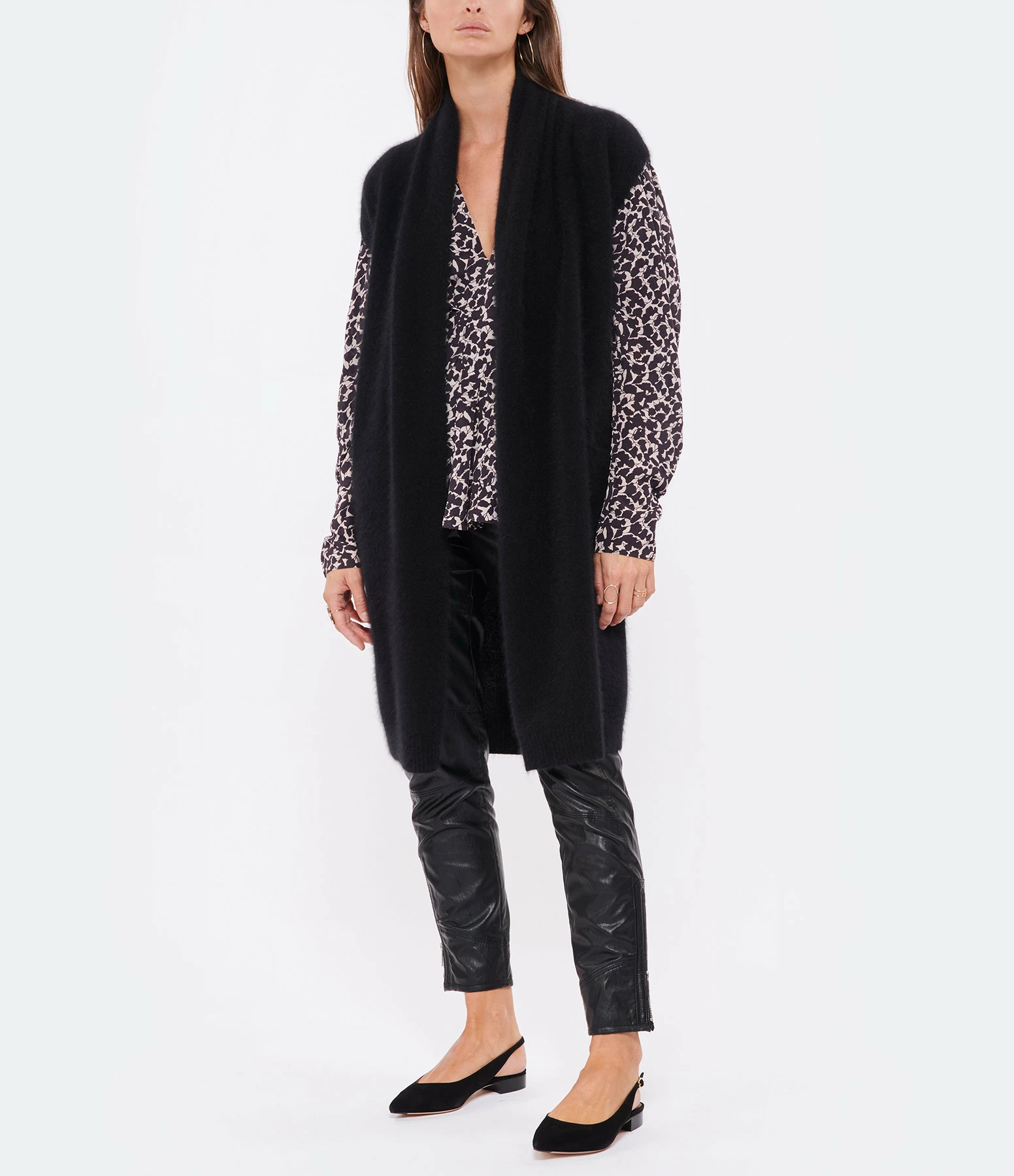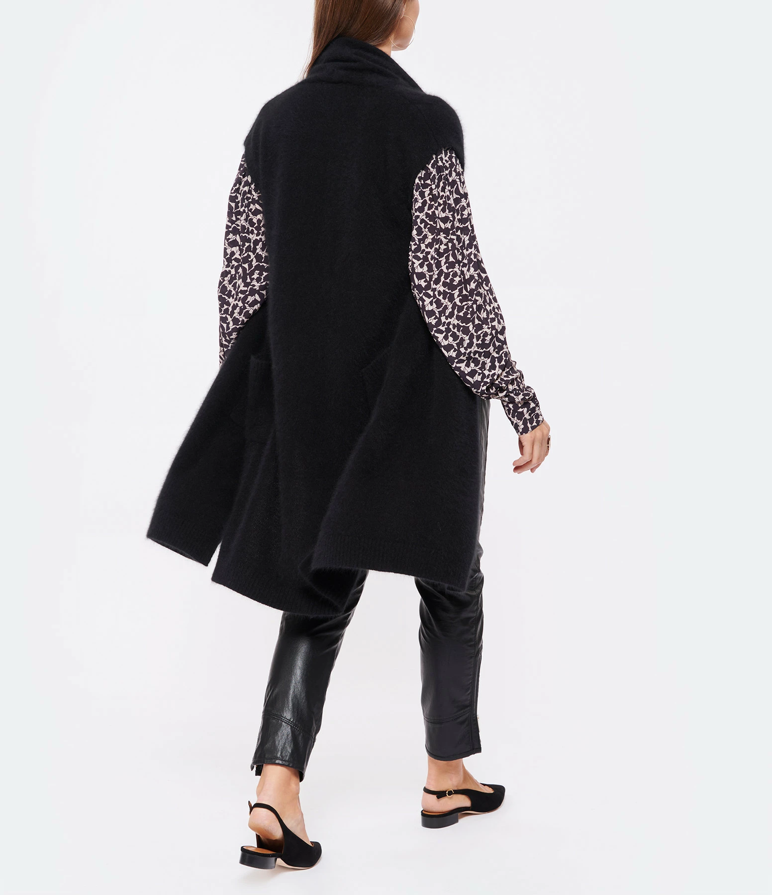Gillet long en laine noir. Col châle. Sans manches. Fermeture boutonnée simple sur le devant. Deux poches plaquées sur le devant. Fentes latérales. Coupe droite. Base droite côtelée.