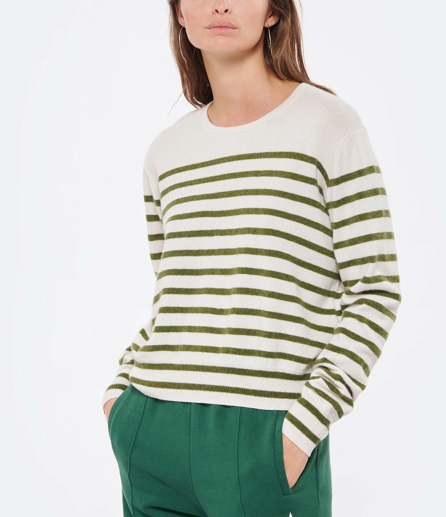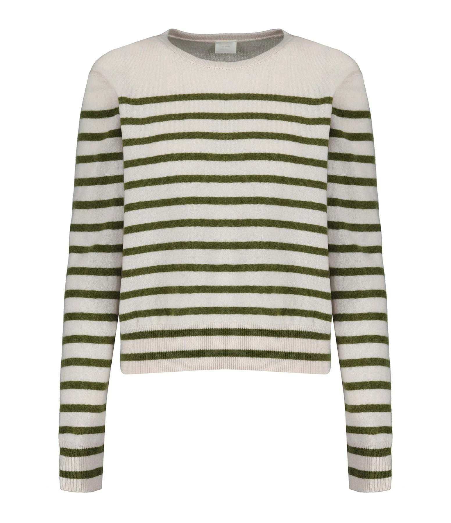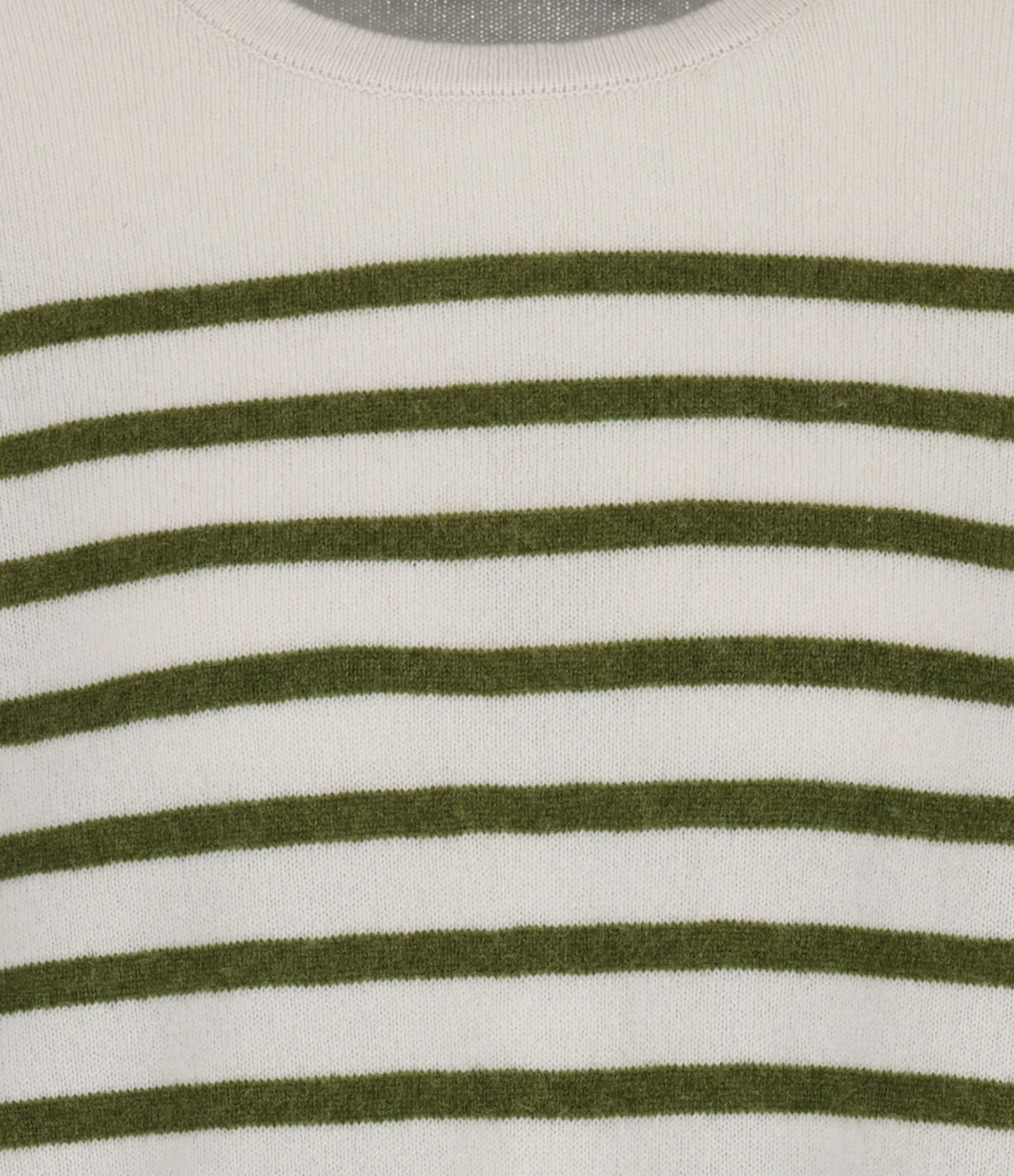 Pull en cachemire blanc à rayures kaki. Col rond côtelé. Manches longues avec poignets côtelés. Coupe droite. Base droite côtelée.