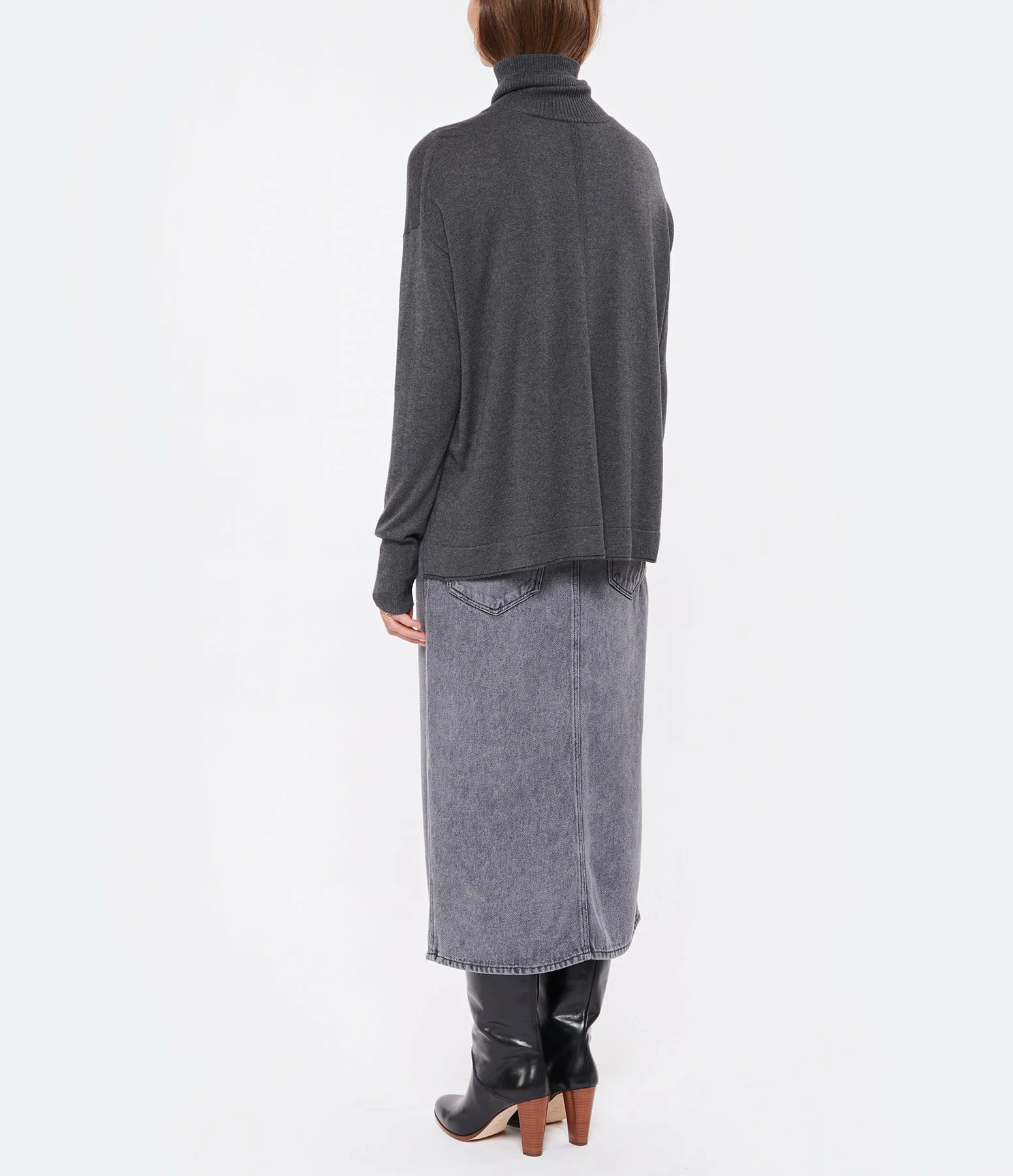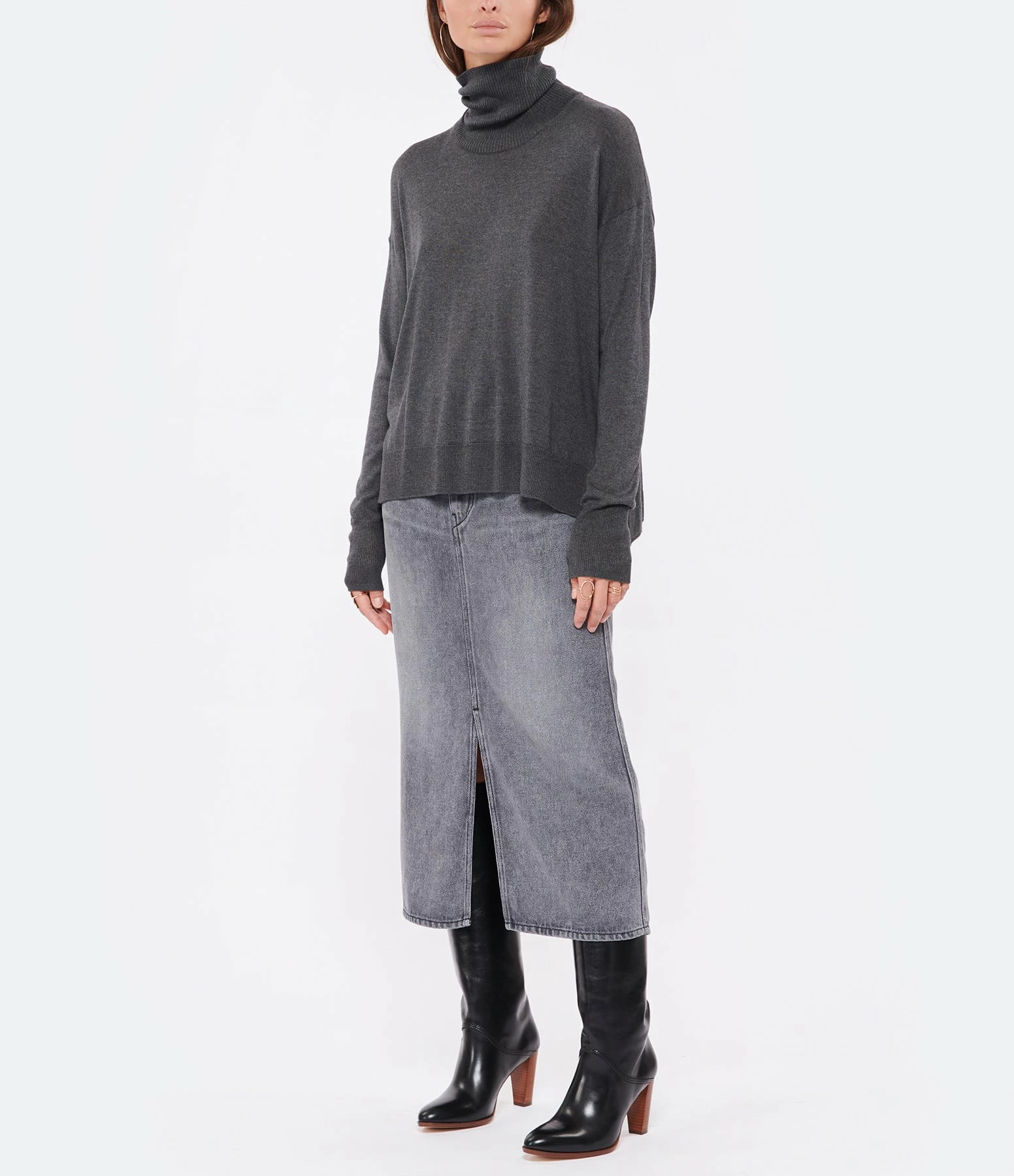 Pull en soie et cachemire gris. Col roulé côtelé. Manches longues avec poignet côtelé. Deux fentes latérales Coupe droite large. Base droite côtelée.
