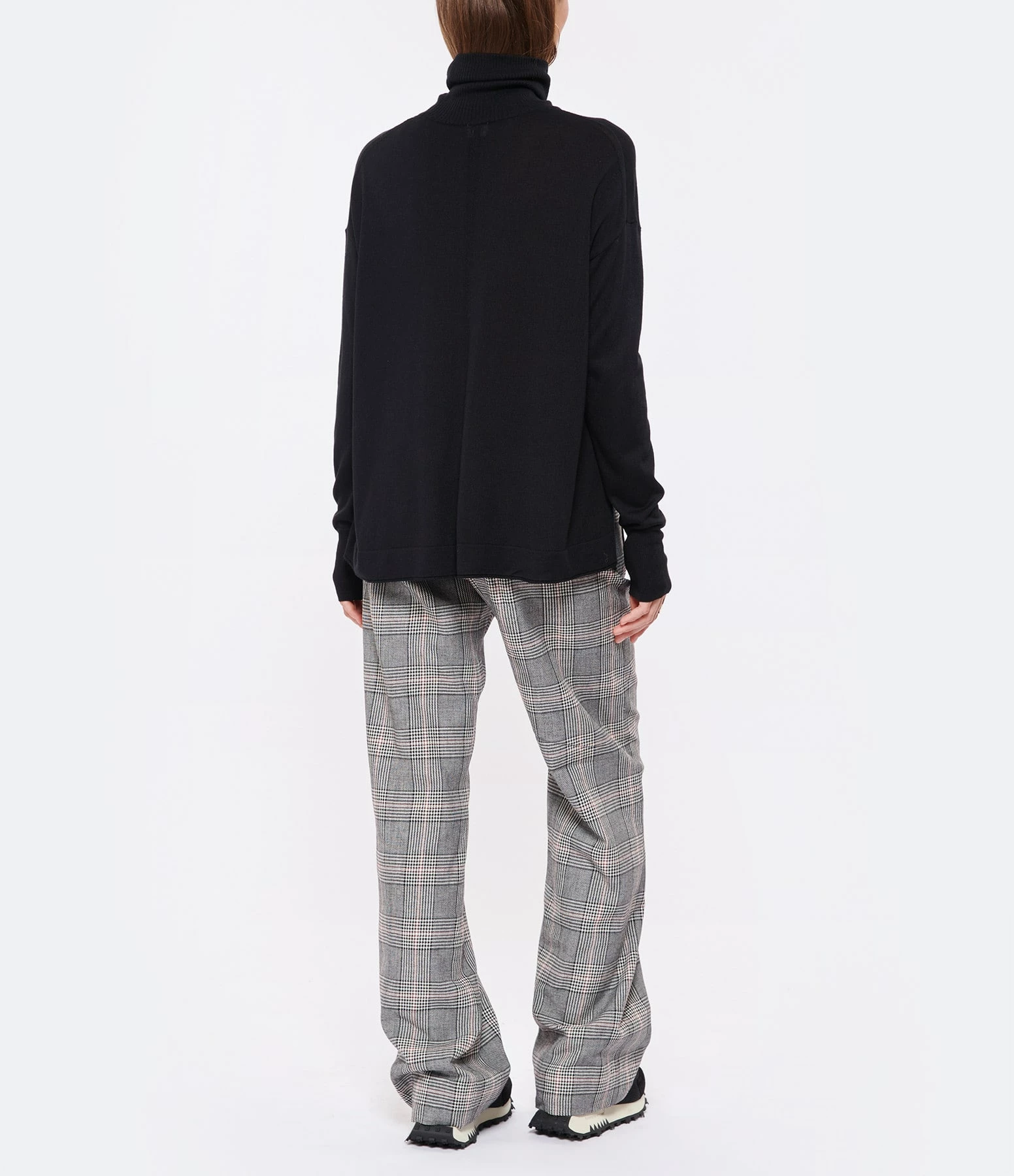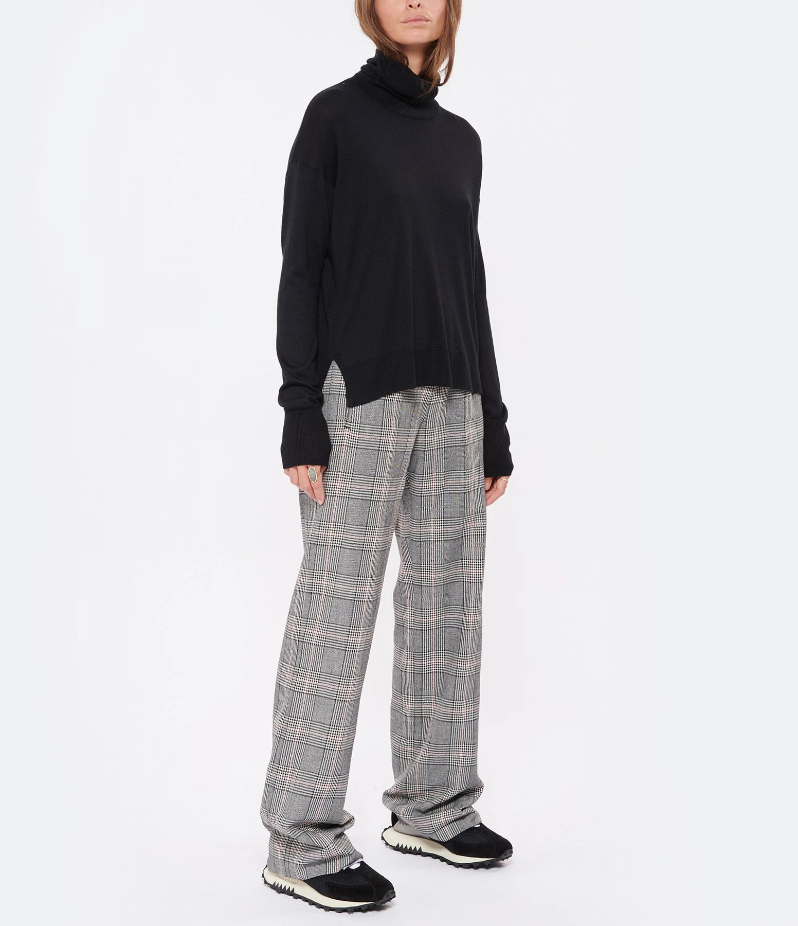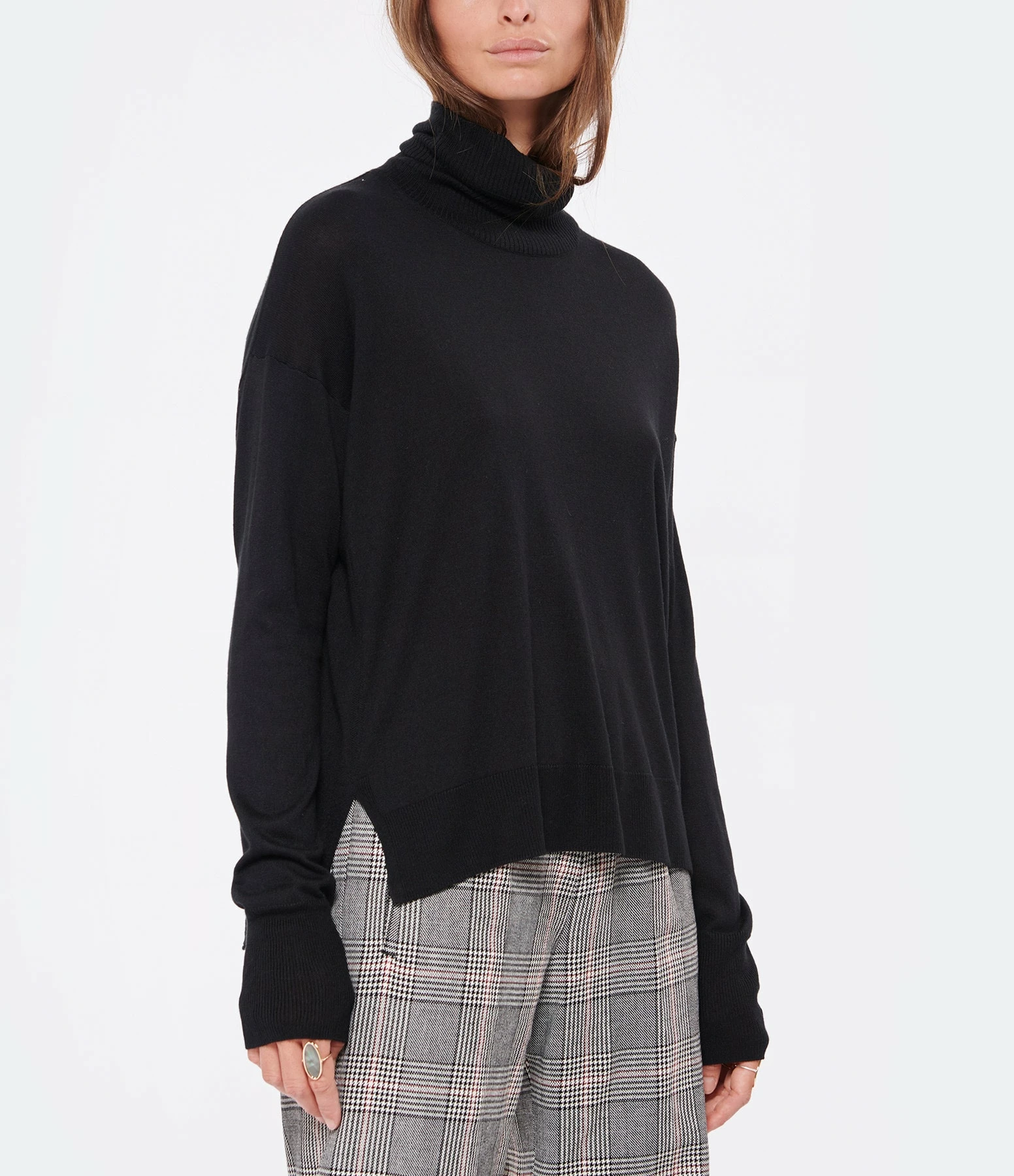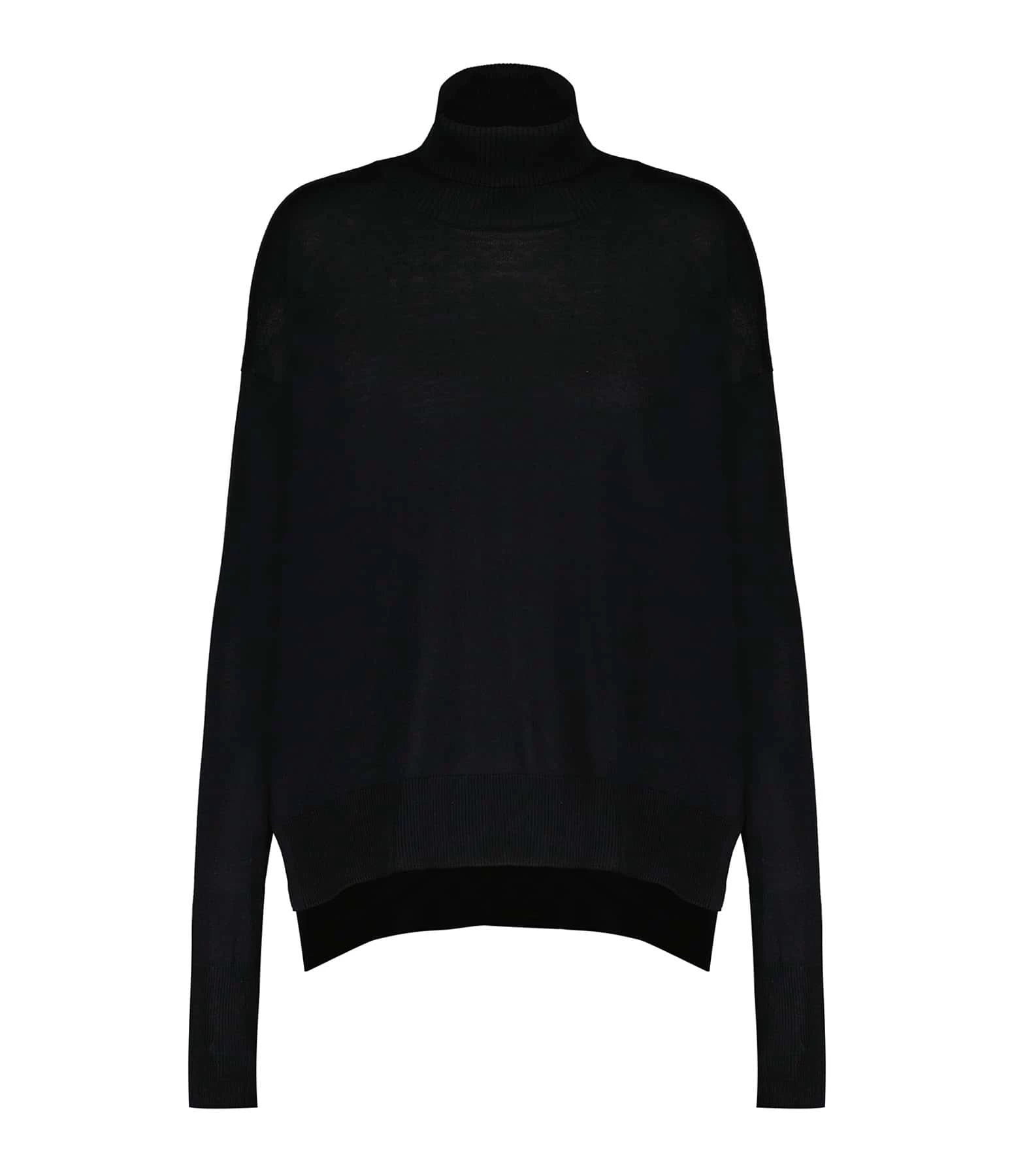 Pull en soie et cachemire noir. Col roulé côtelé. Manches longues avec poignet côtelé. Deux fentes latérales Coupe droite large. Base droite côtelée.