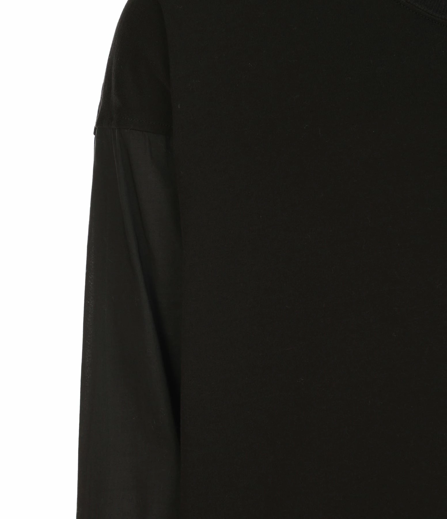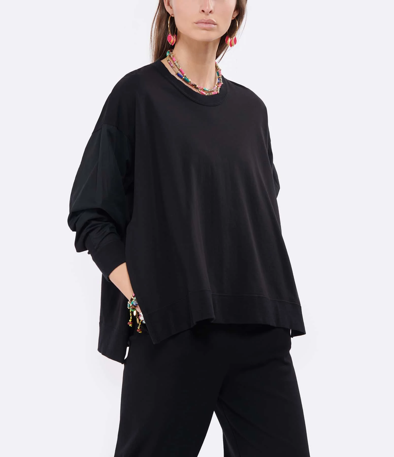 Sweatshirt en coton effet bi-matière. Col arrondie. Manches longues élastiquées effet chemise. Fentes latérales. Coupe droite. Plus long à l’arrière.