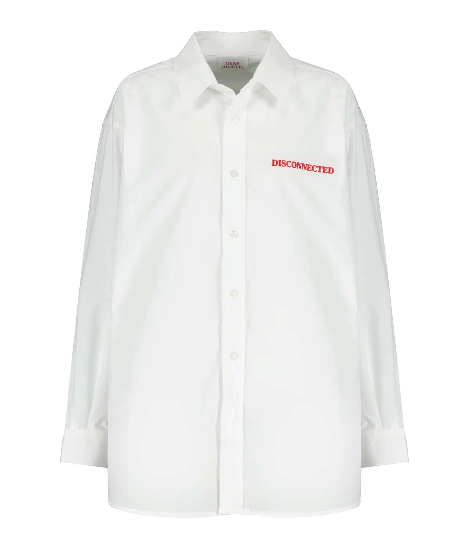 Chemise en coton blanc. Inscription brodée rouge “Disconnected” sur la poitrine. Col chemisier. Fermeture boutonnée. Manches longues. Coupe ample. Base droite.