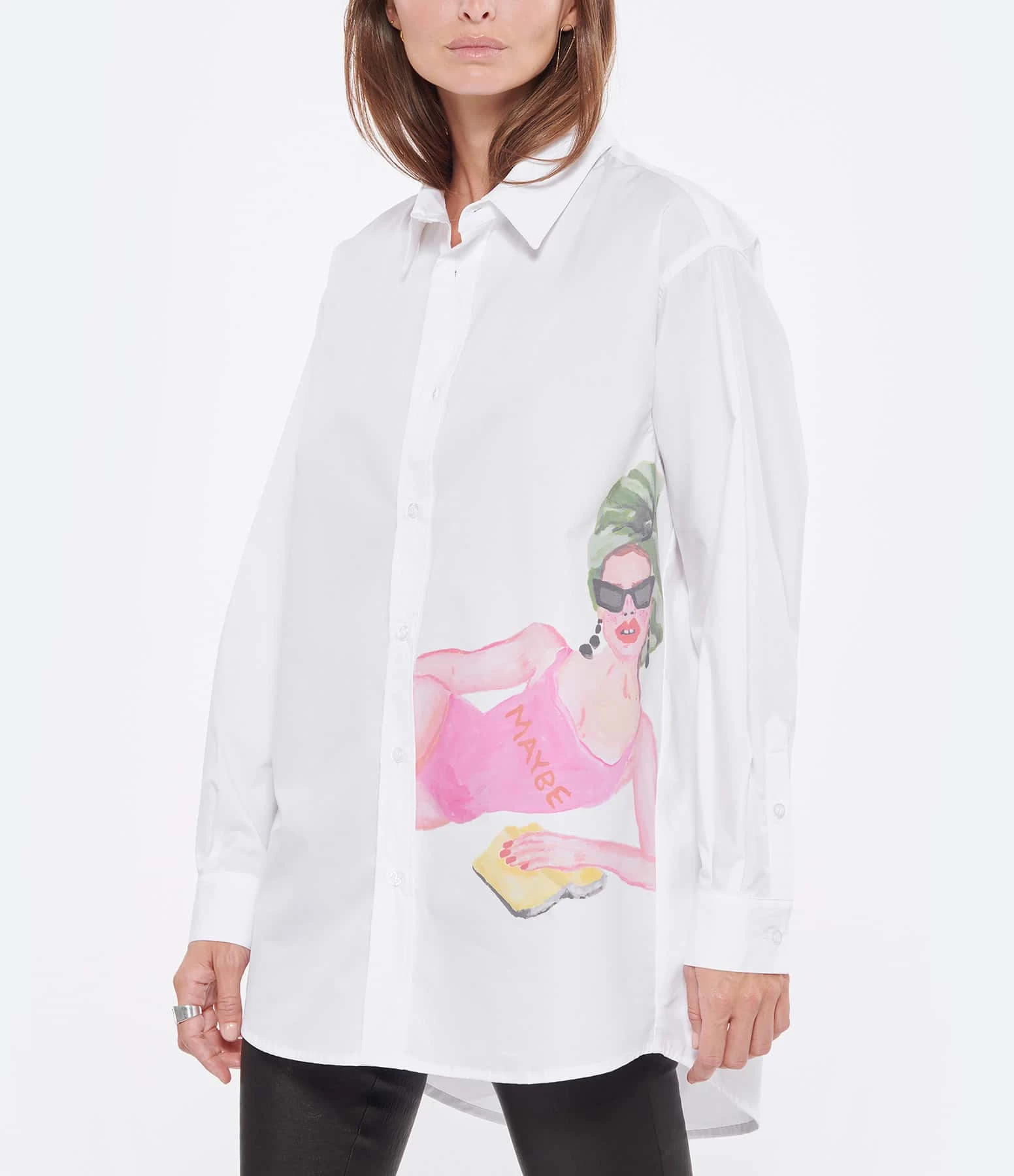 Chemise en coton blanc. Imprimé dessin femme à l’avant. Col chemisier. Fermeture boutonnée. Manches longues. Coupe ample. Base droite.