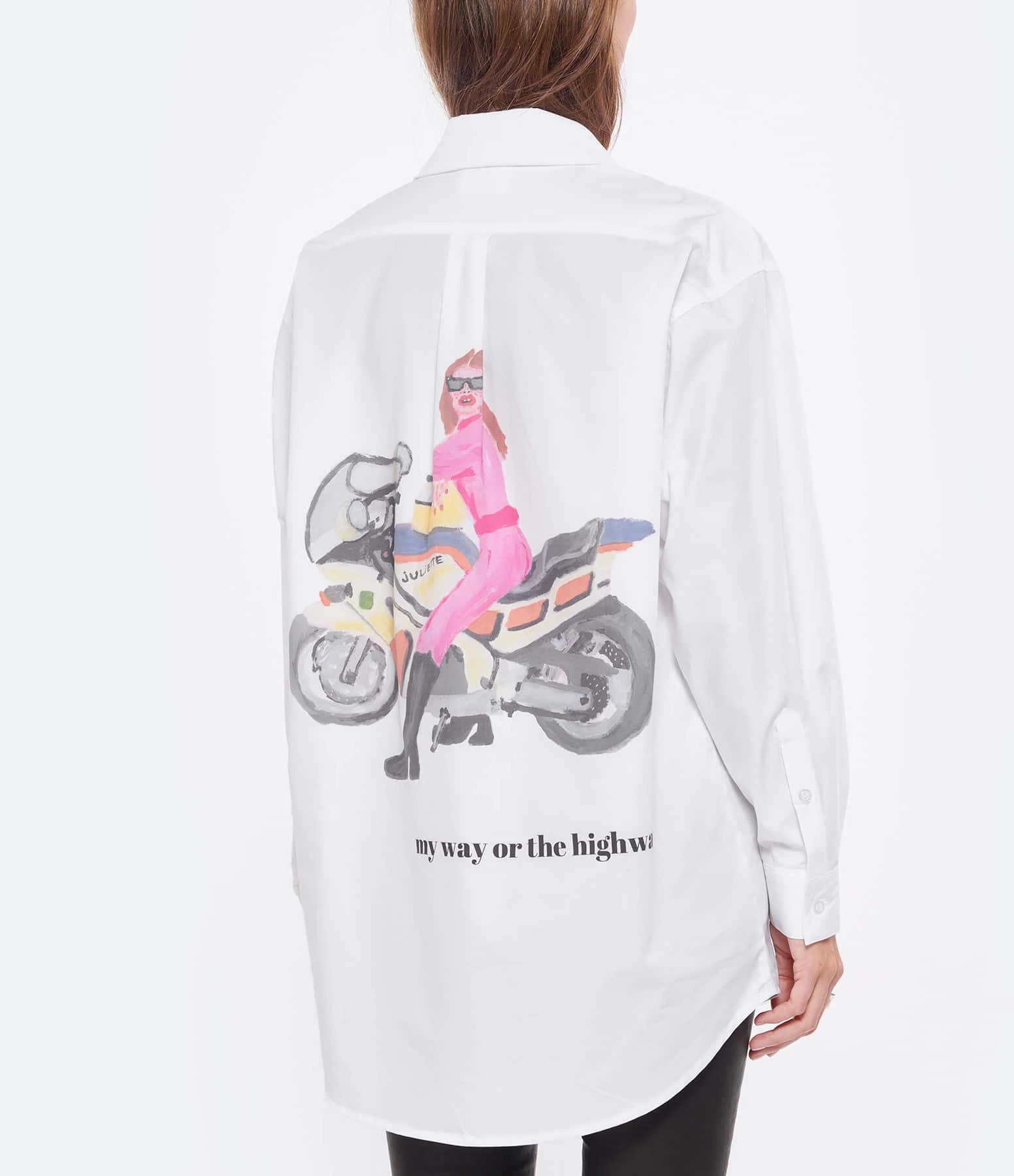 Chemise en coton blanc. Imprimé dessin motarde au dos. Col chemisier. Fermeture boutonnée. Manches longues. Coupe ample. Base droite.