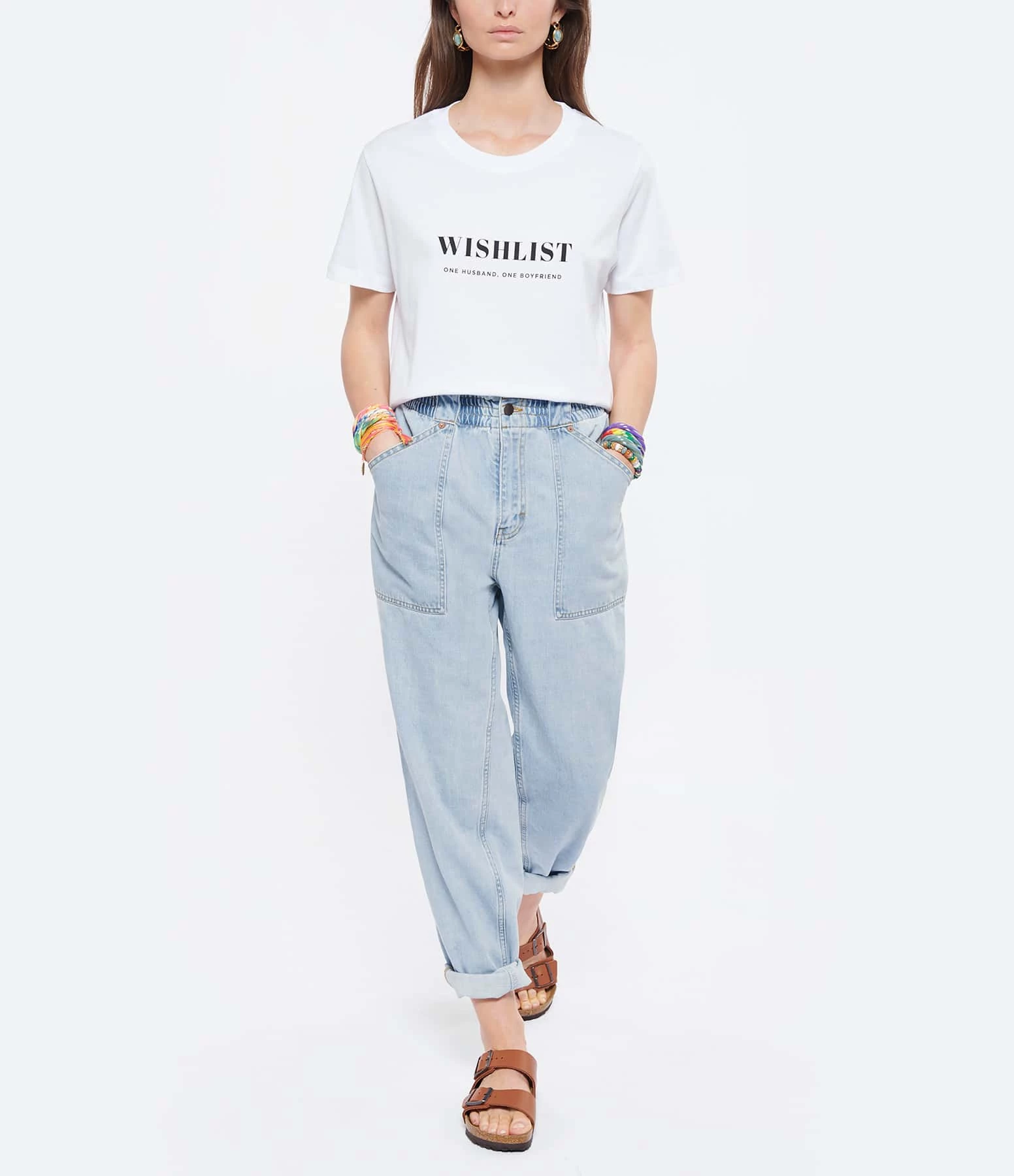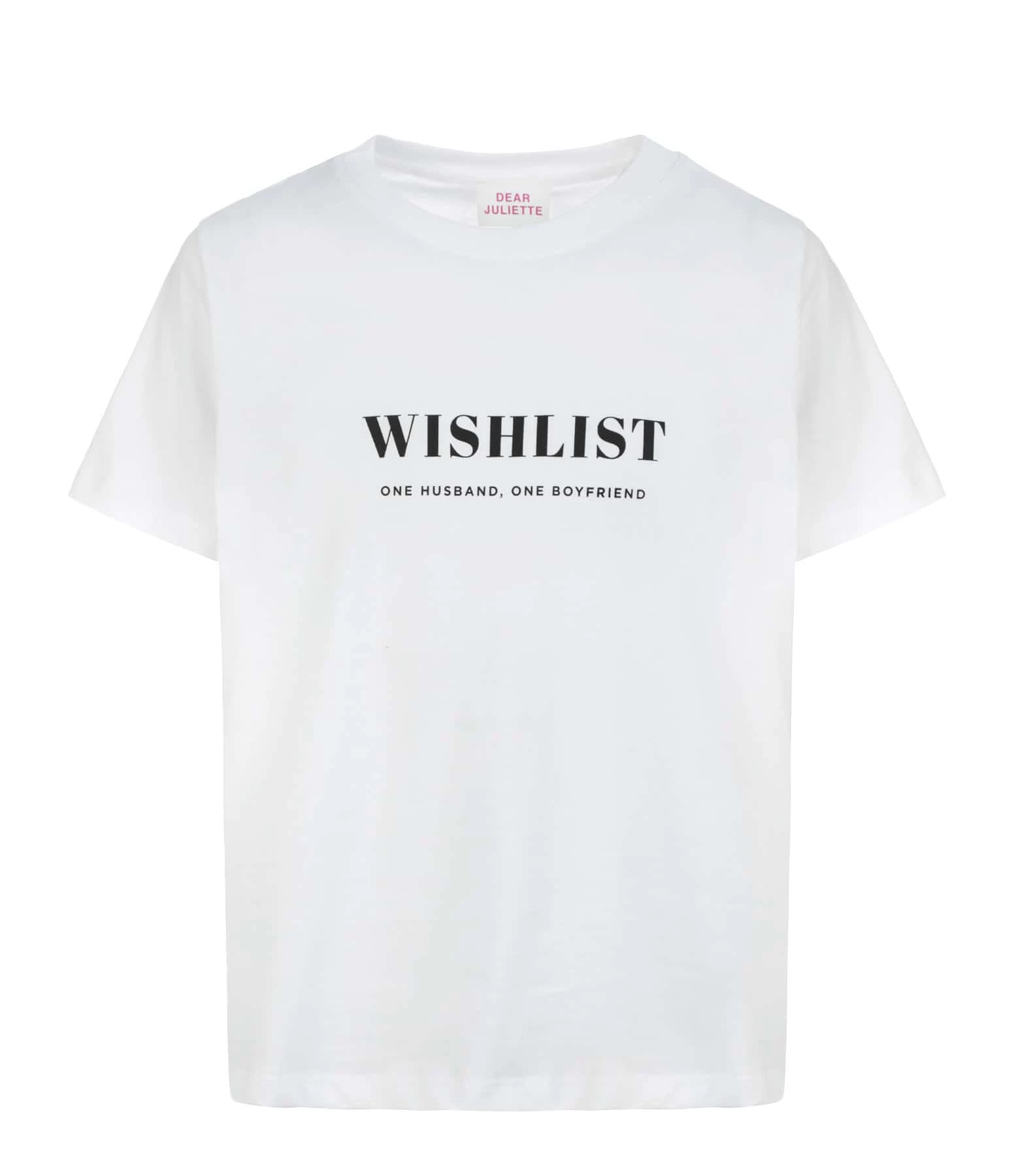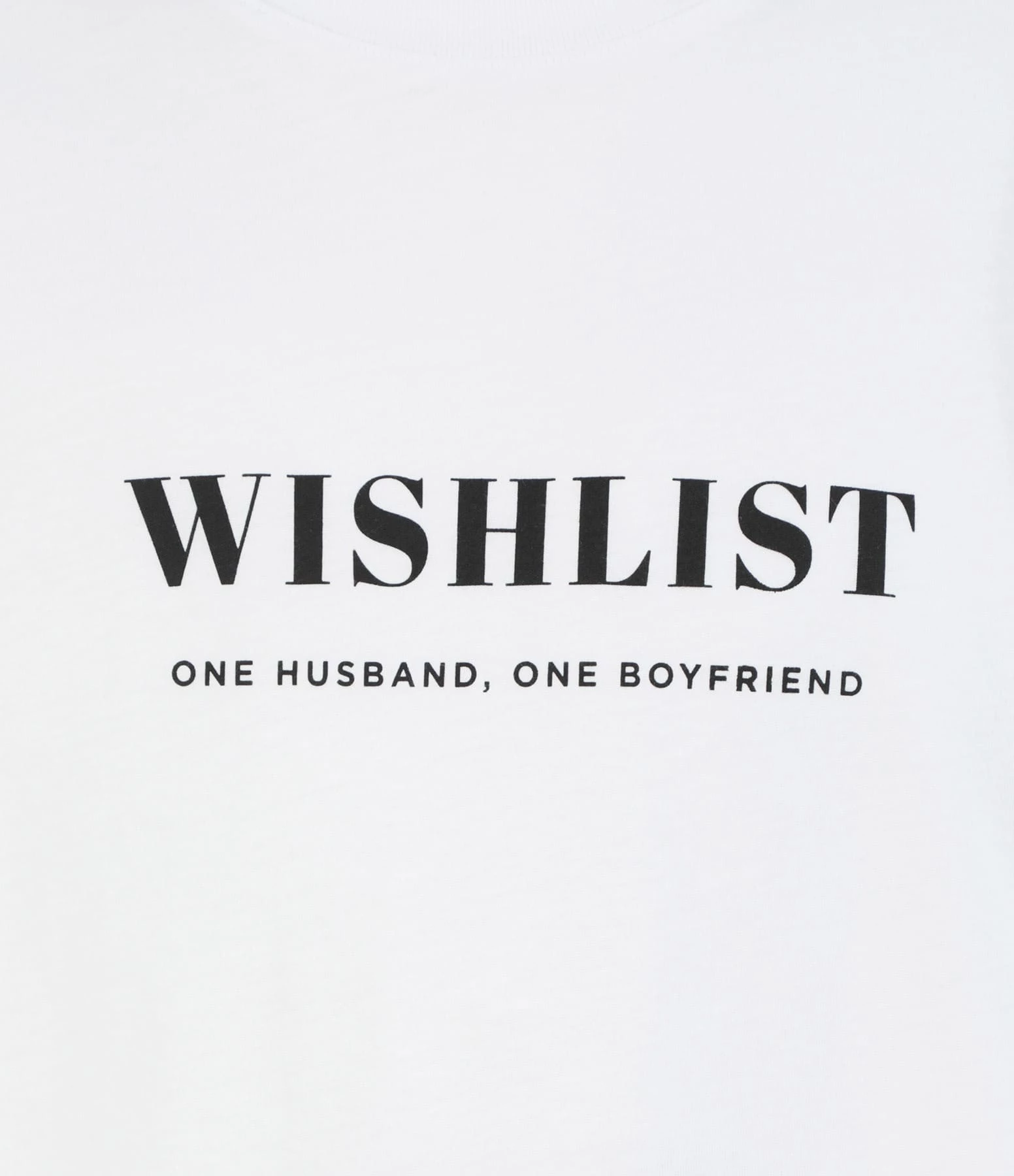 Tee-shirt en coton blanc. Inscription noire “WISHLIST, one husband, one boyfriend” floquée à l’avant. Col rond. Manches courtes. Coupe droite. Base droite.