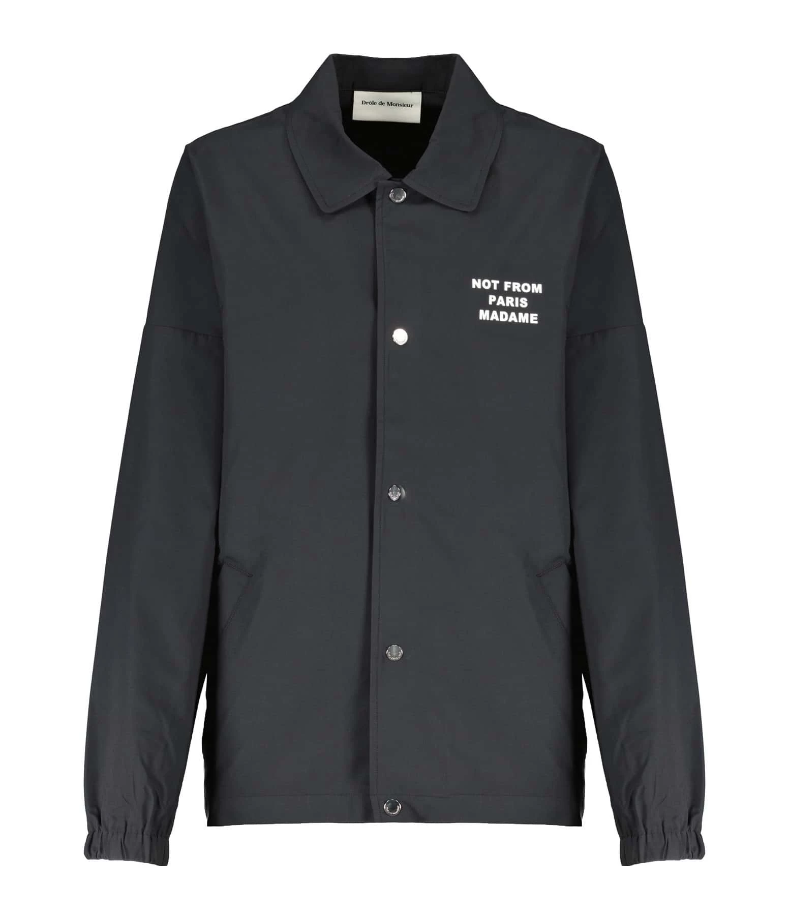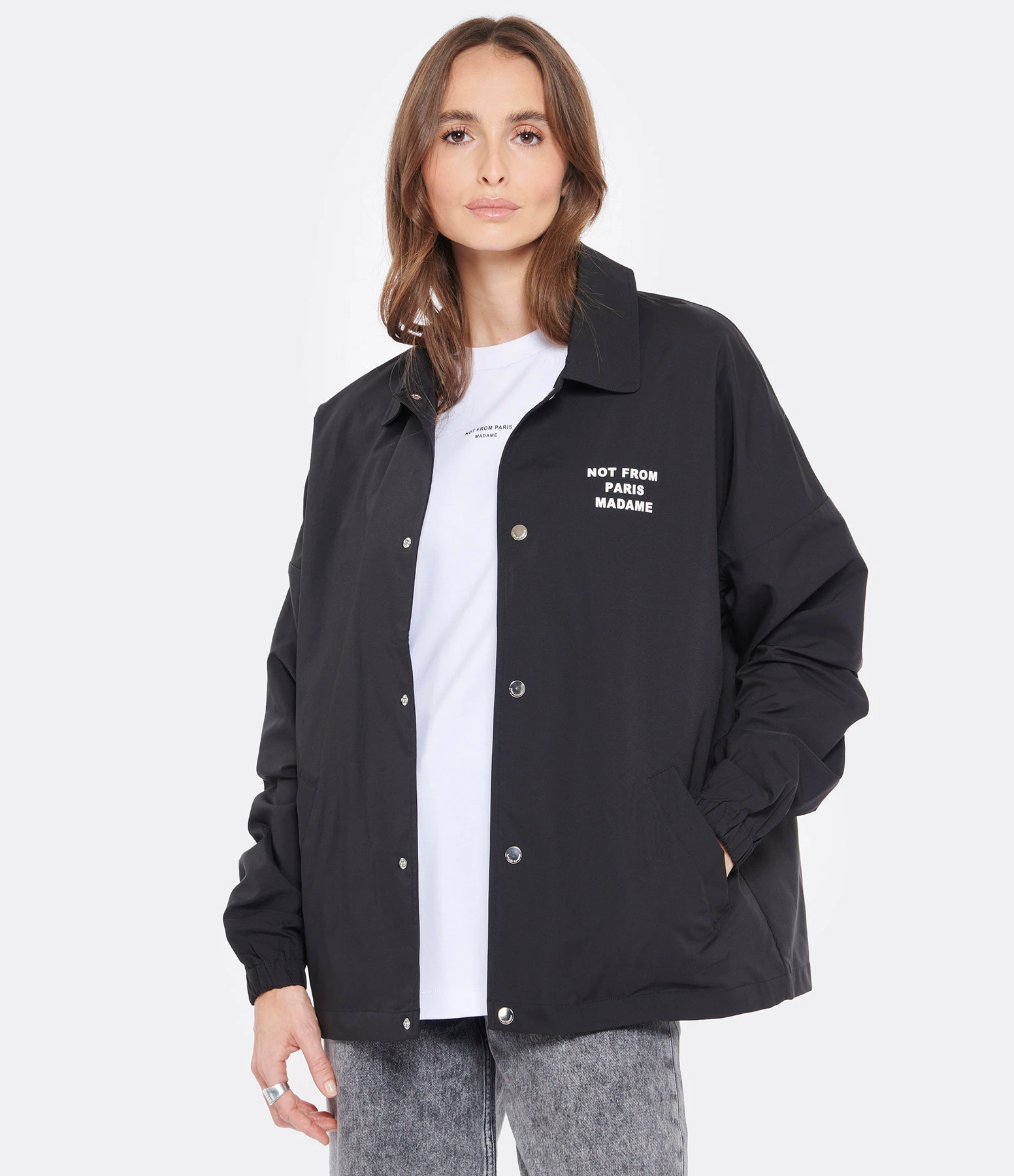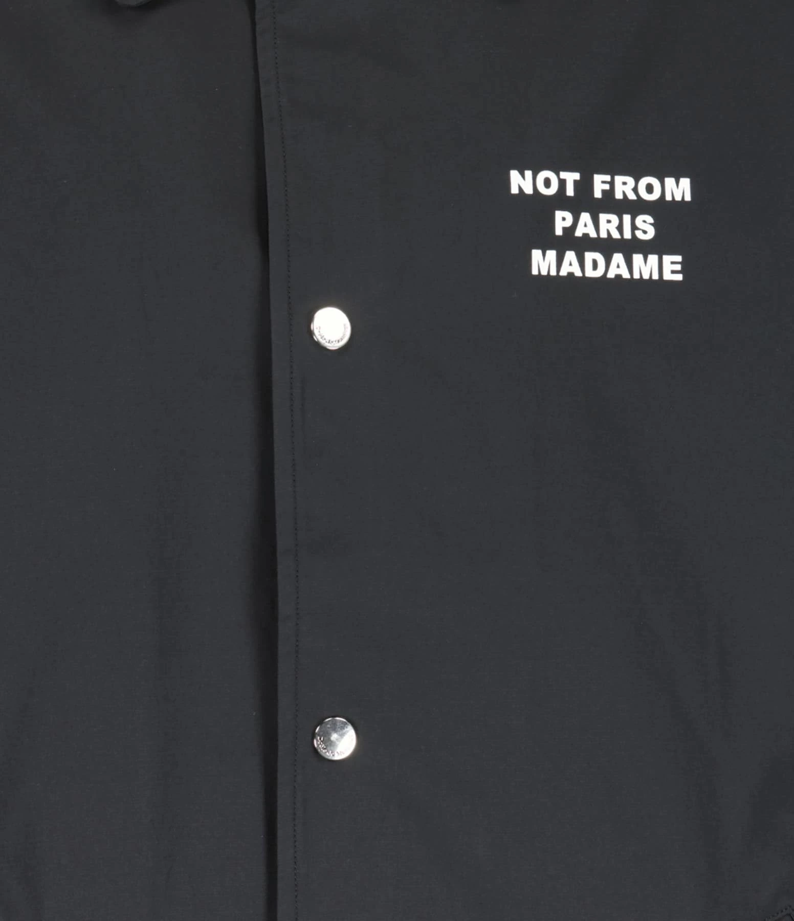 Surchemise noire. Inscriptions à l’avant et à l’arrière “NOT FROM PARIS MADAME”. Col chemise. Manches longues. Deux poches plaquées fendues. Fermeture par boutons pressions. Coupe droite. Base droite.