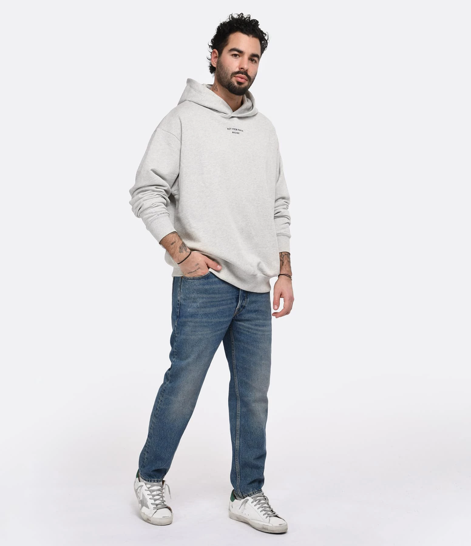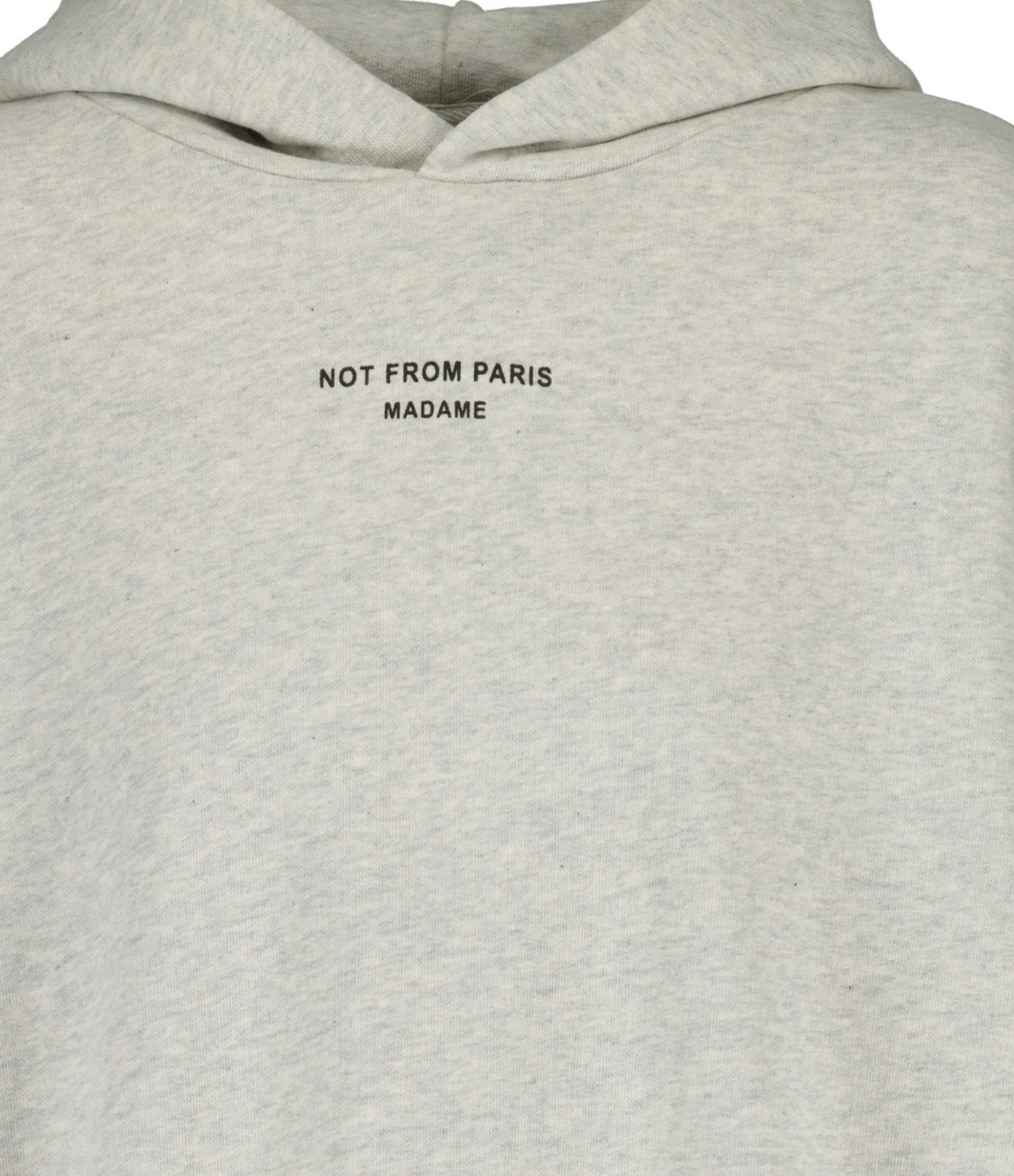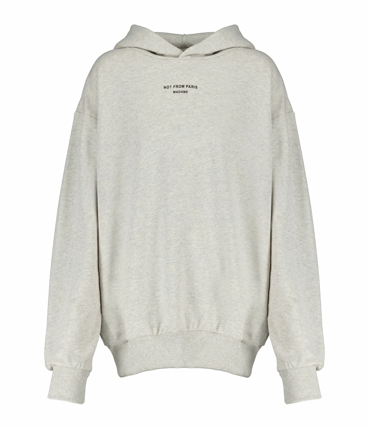 Sweatshirt en coton gris chiné. Inscriptions “NOT FROM PARIS MADAME”. Col à capuche. Manches longues avec poignets côtelés. Coupe ample. Base droite côtelée. Non doublé.