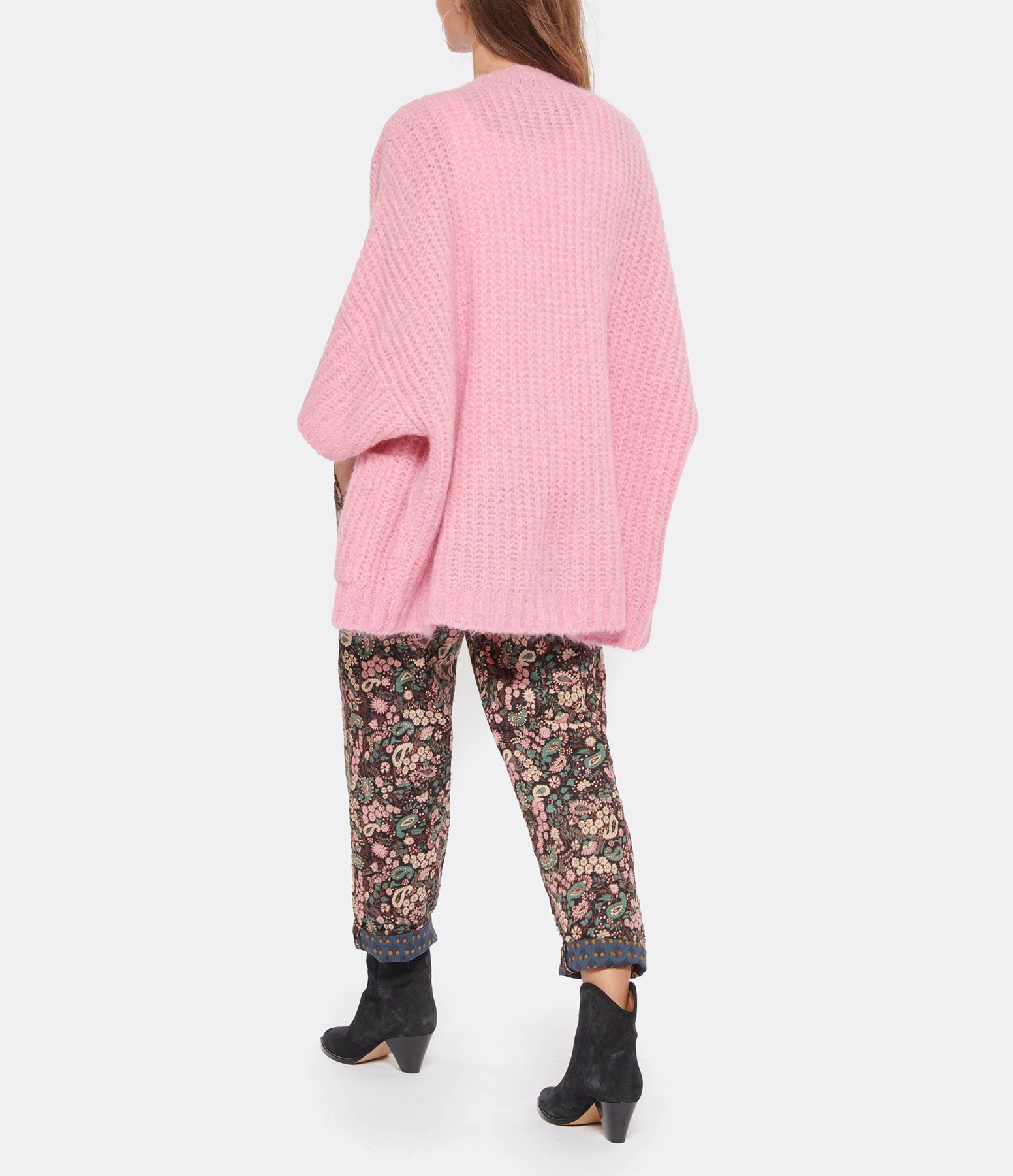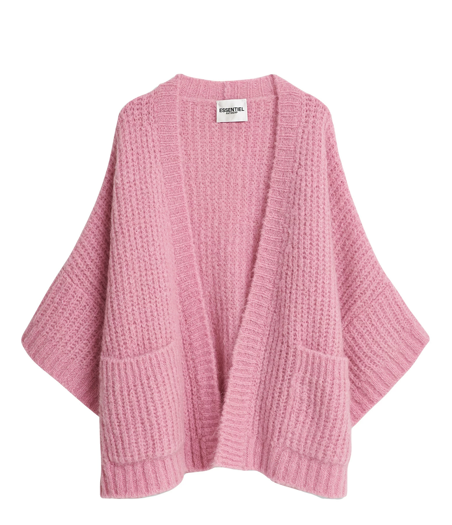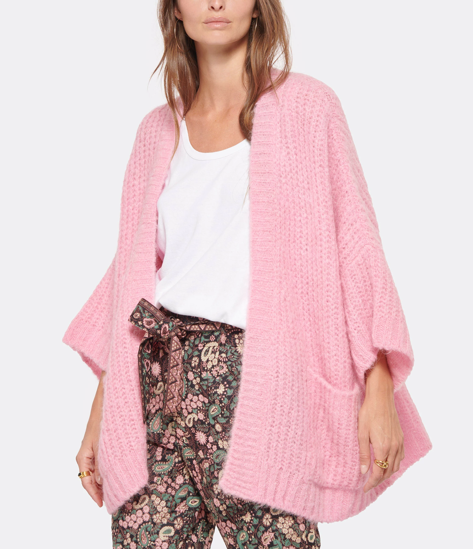 Cardigan en mohair rose. Manches 3/4. Deux poches plaquées. Coupe oversize. Base droite.
