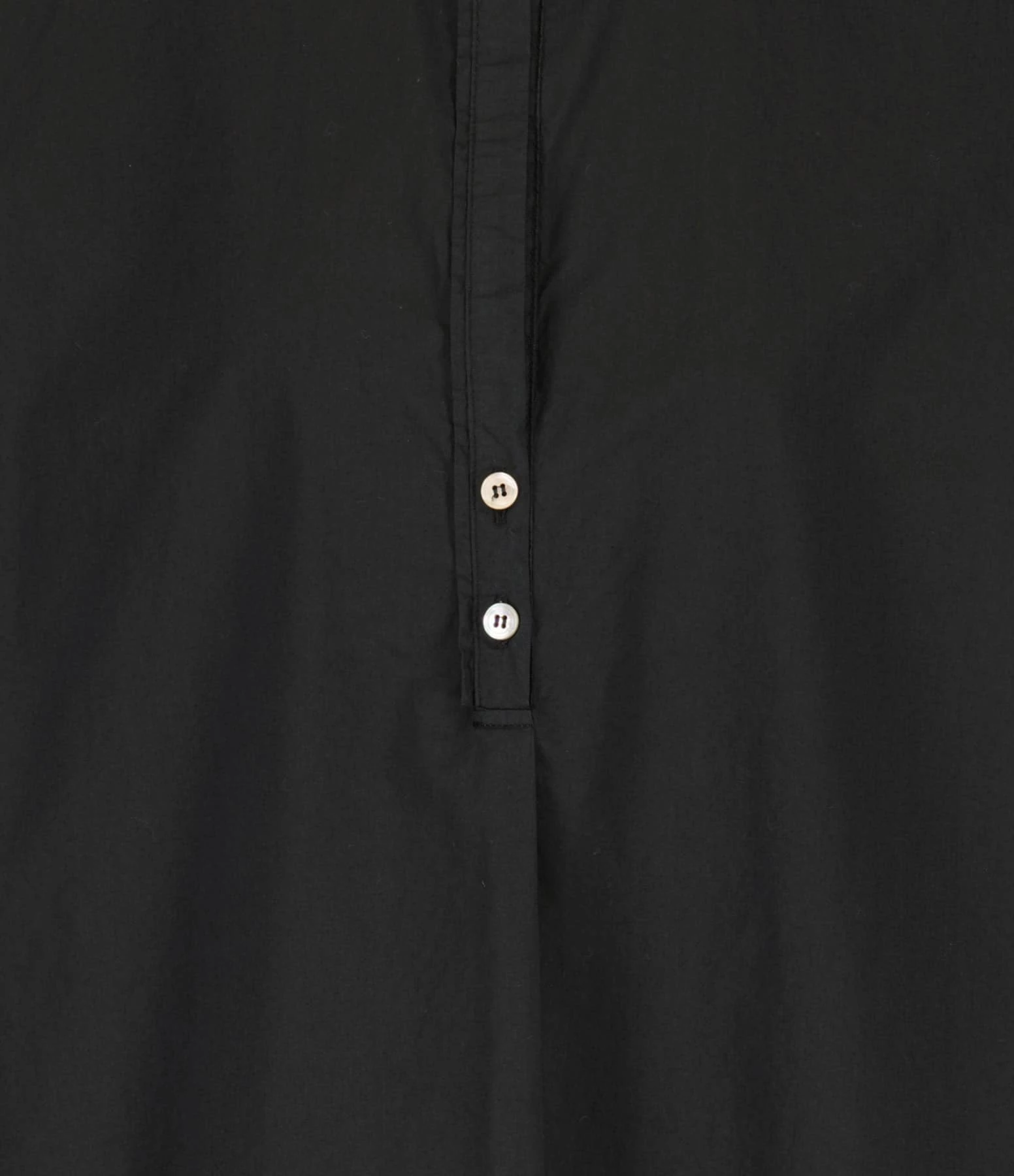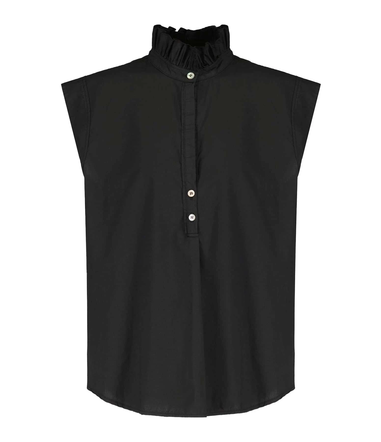 Blouse en popeline de coton noir. Col officier volanté. Sans manches. Demi-patte de boutonnage sur le devant. Petits boutons nacrés. Pli creux dans le dos. Coupe ample. Base arrondie.