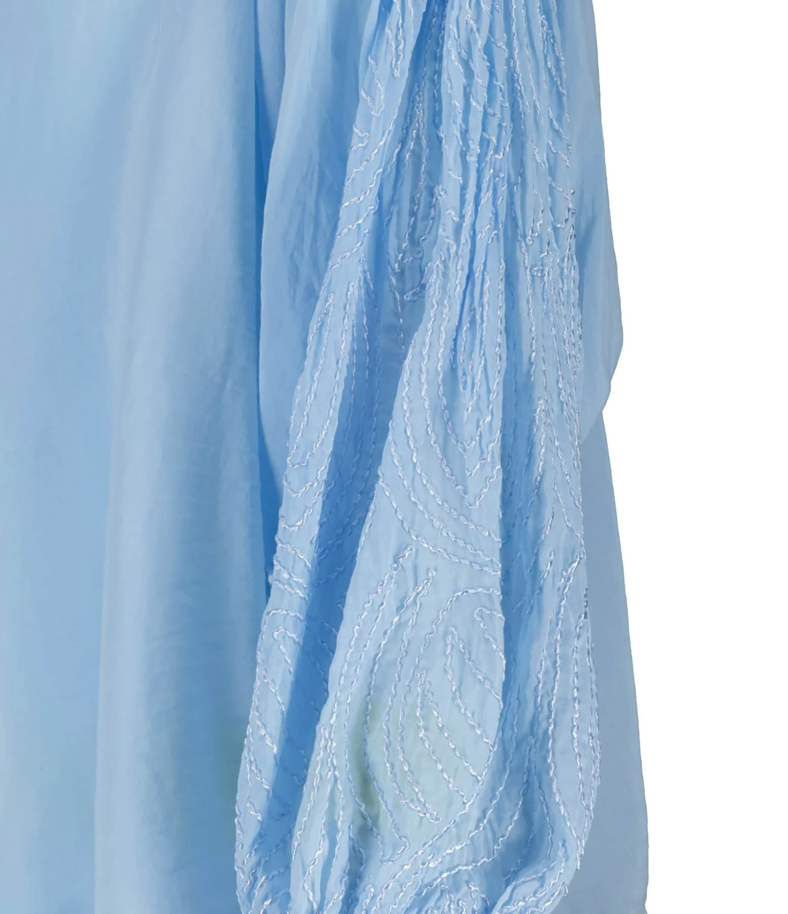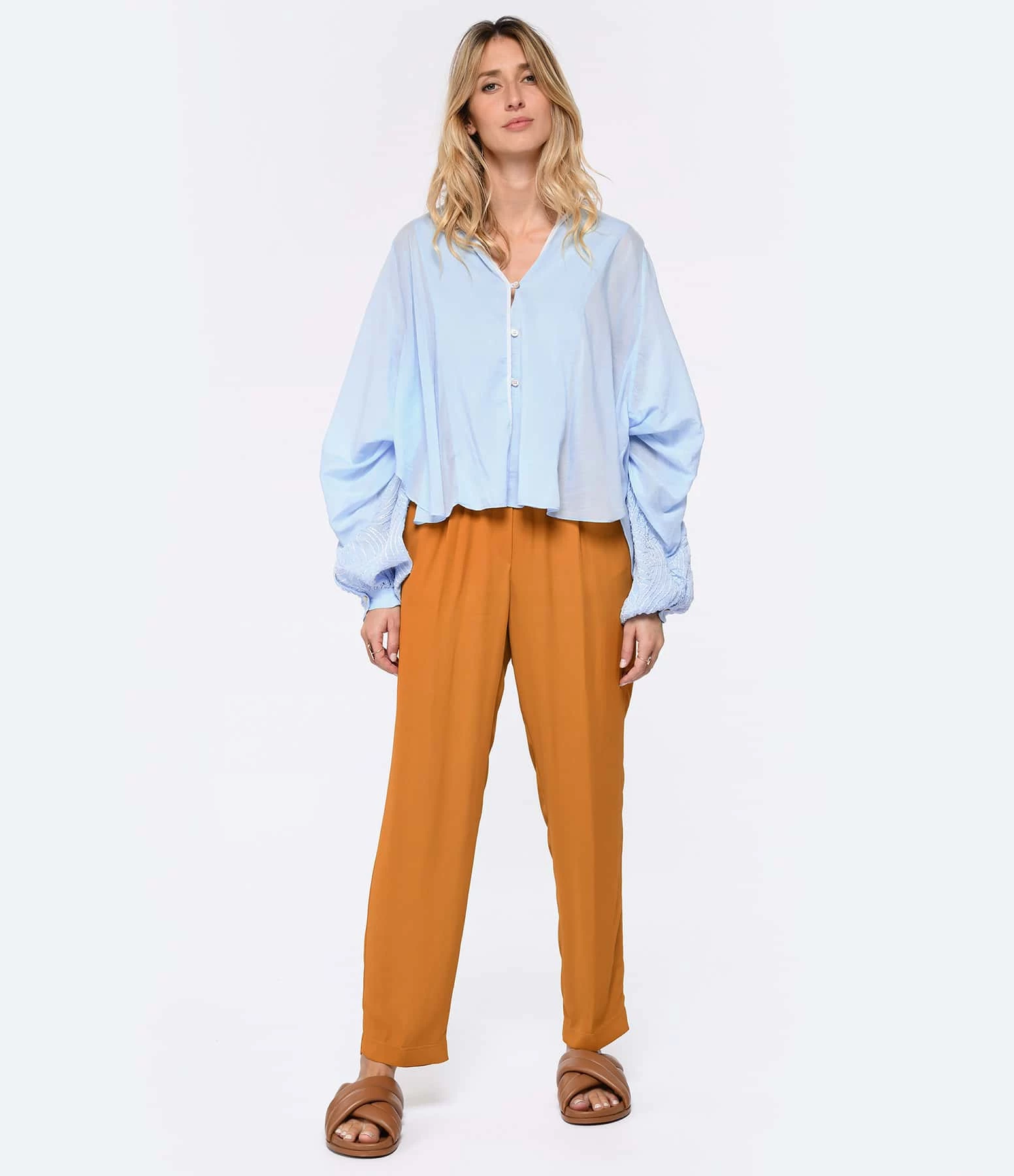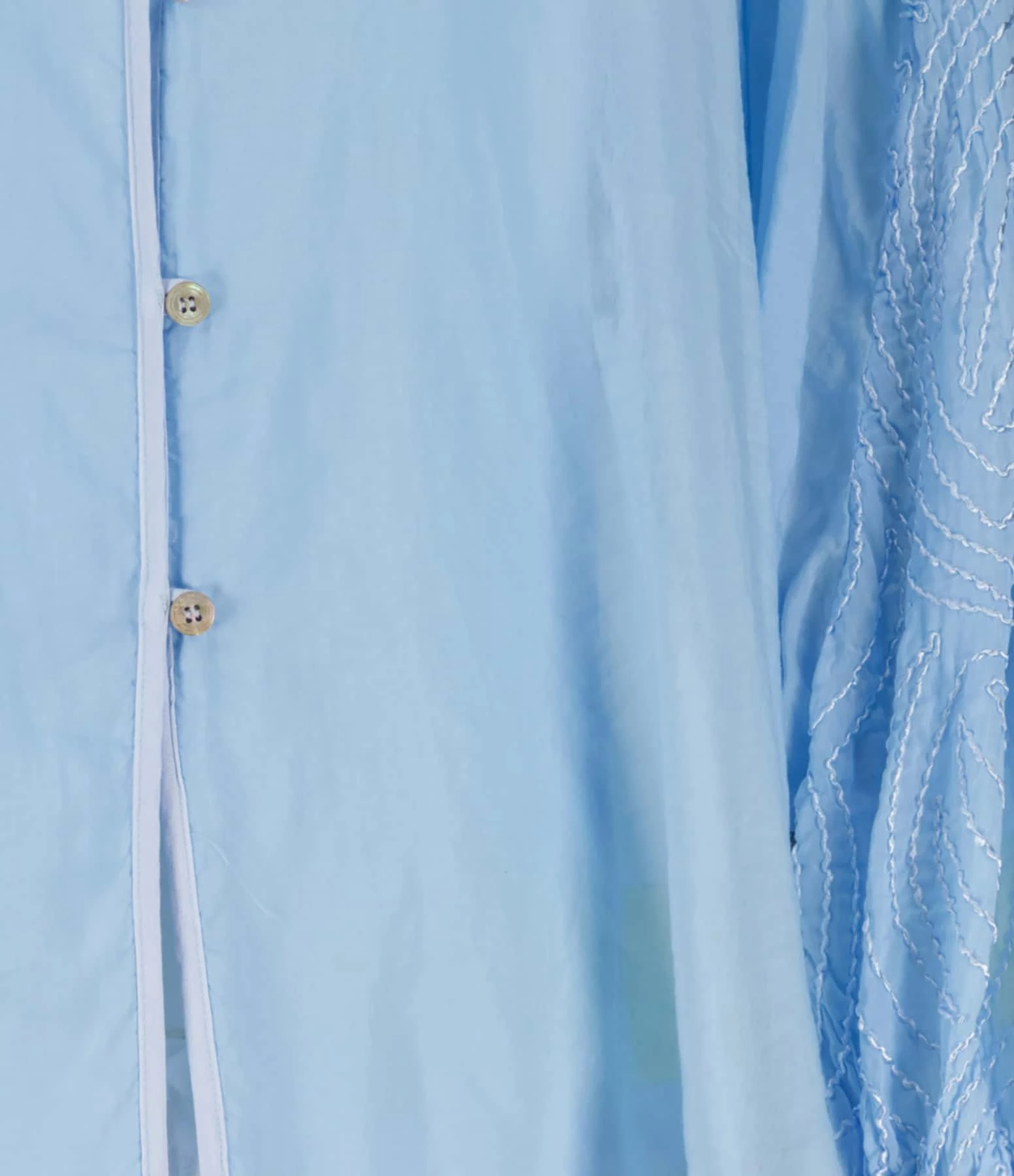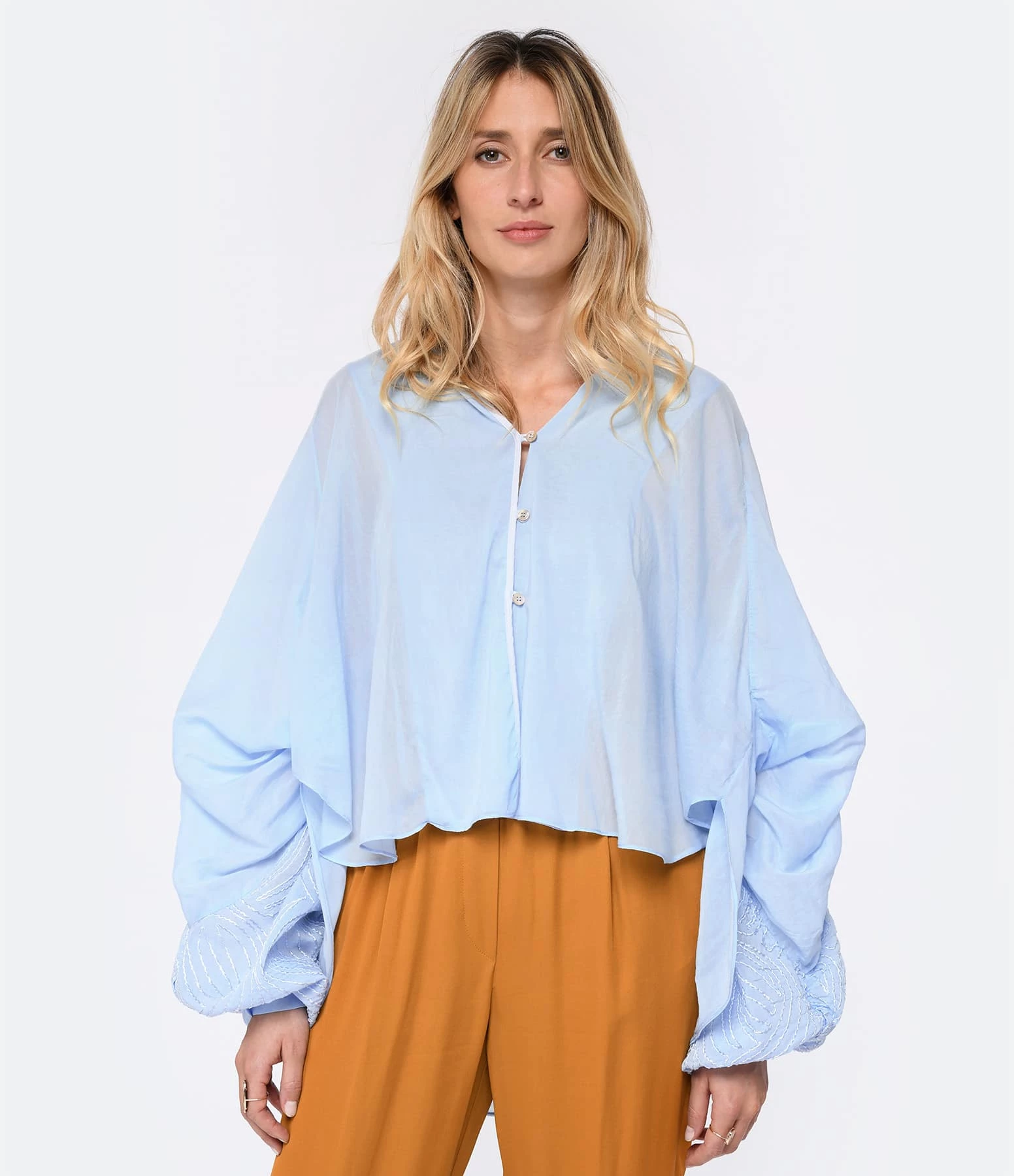 Chemise en coton et soie bleu. Col en V. Épaules froncées. Manches longues ornées de broderies avec fentes et poignets froncés et boutonnés. Fermeture boutonnée sur le devant. Petits boutons nacrés. Coupe large. Base arrondie.