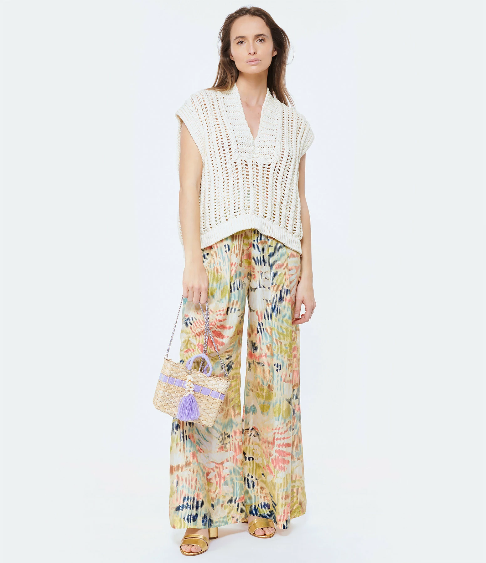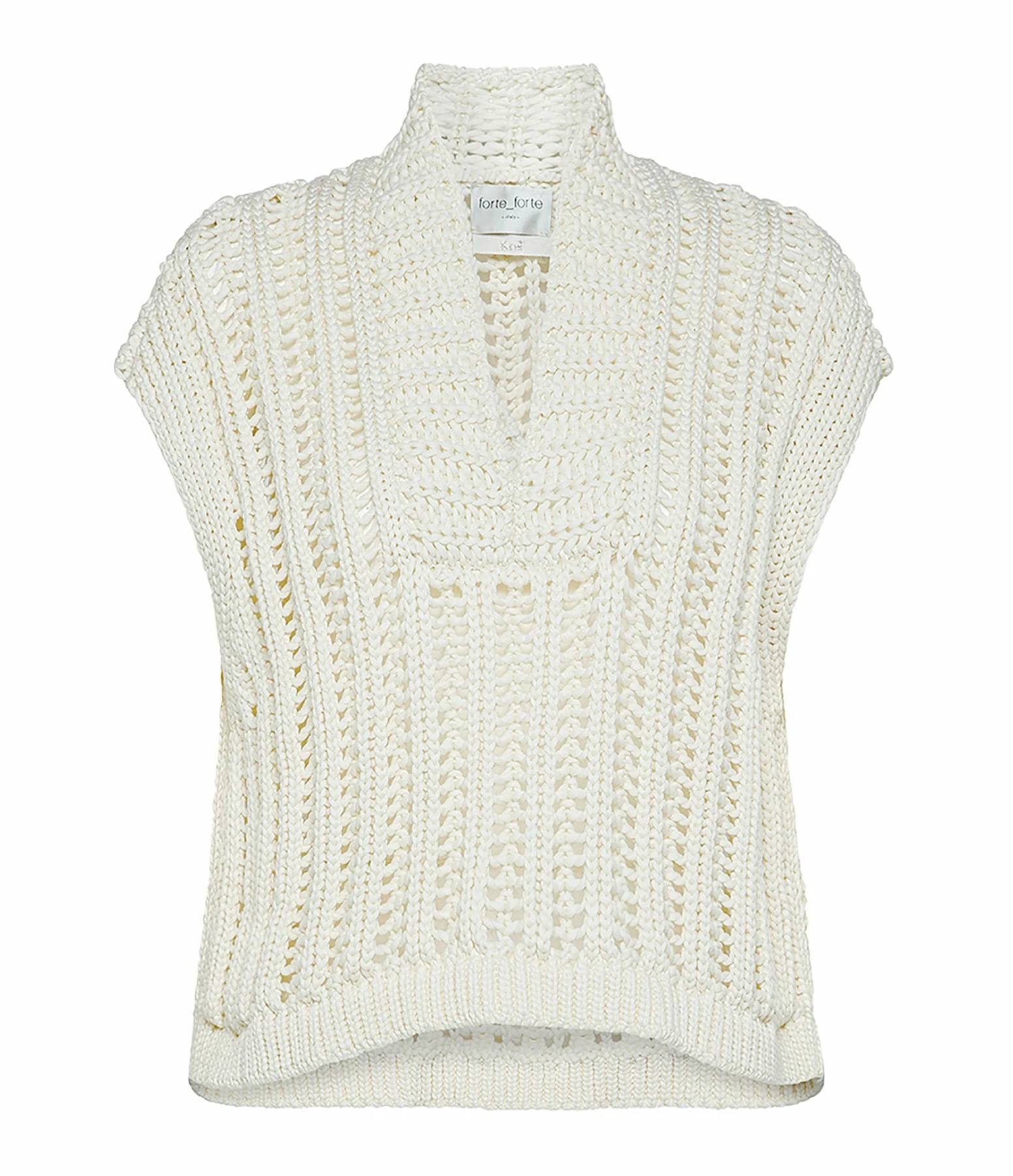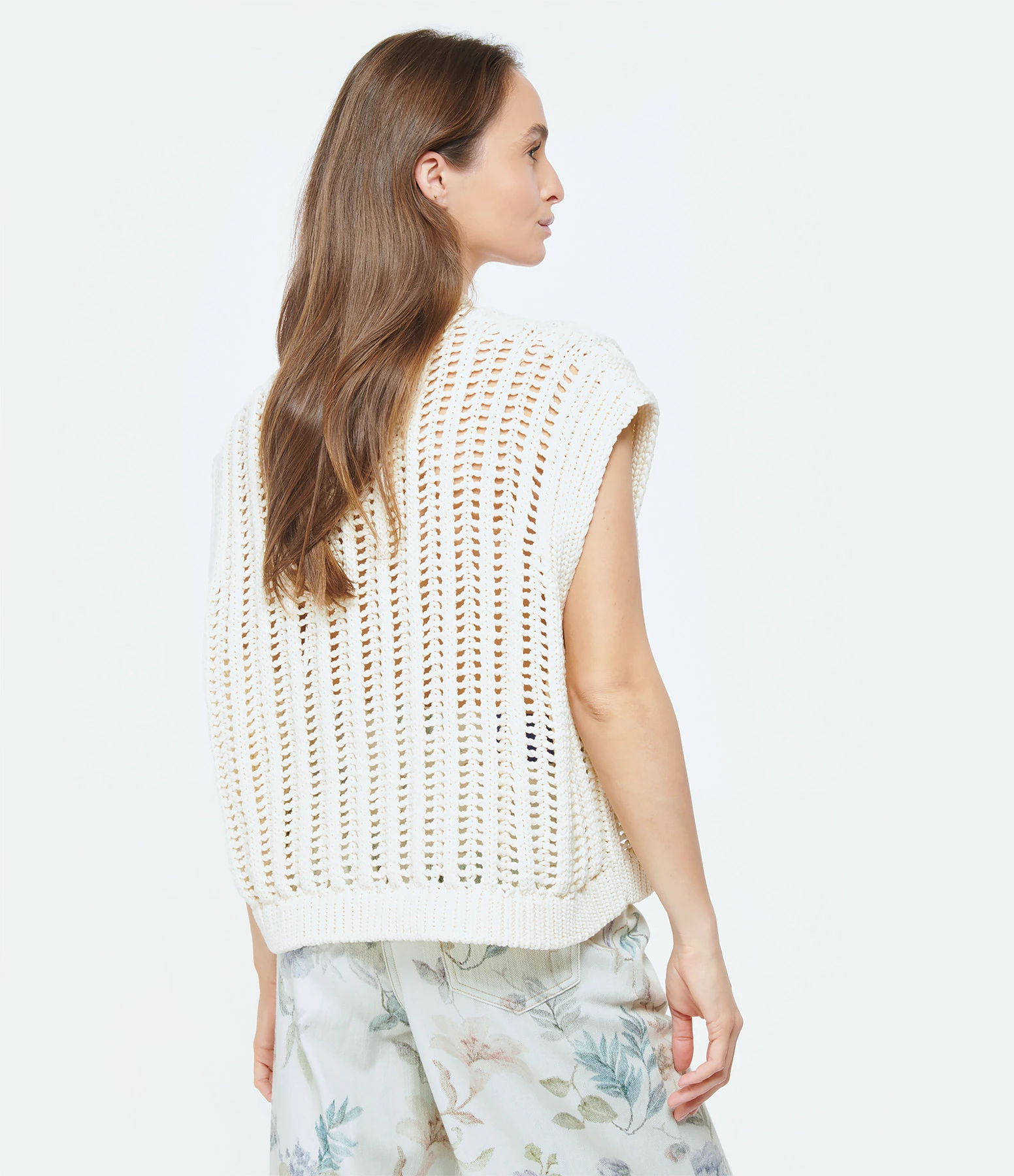 Pull sans manches blanc en coton crocheté. Ajouré. Col en V. Coupe droite. Base droite.