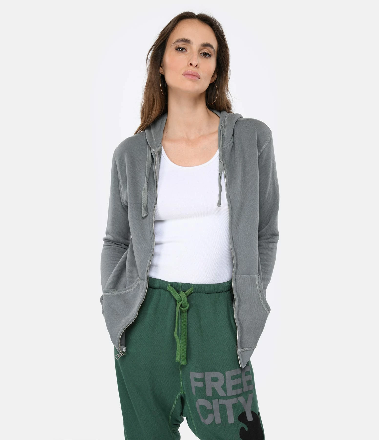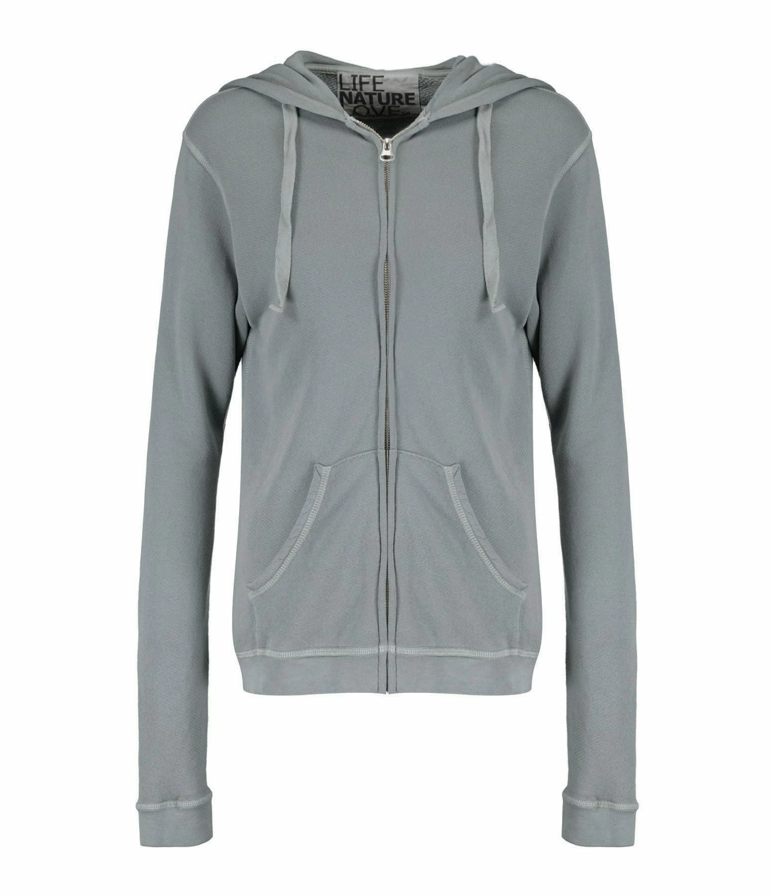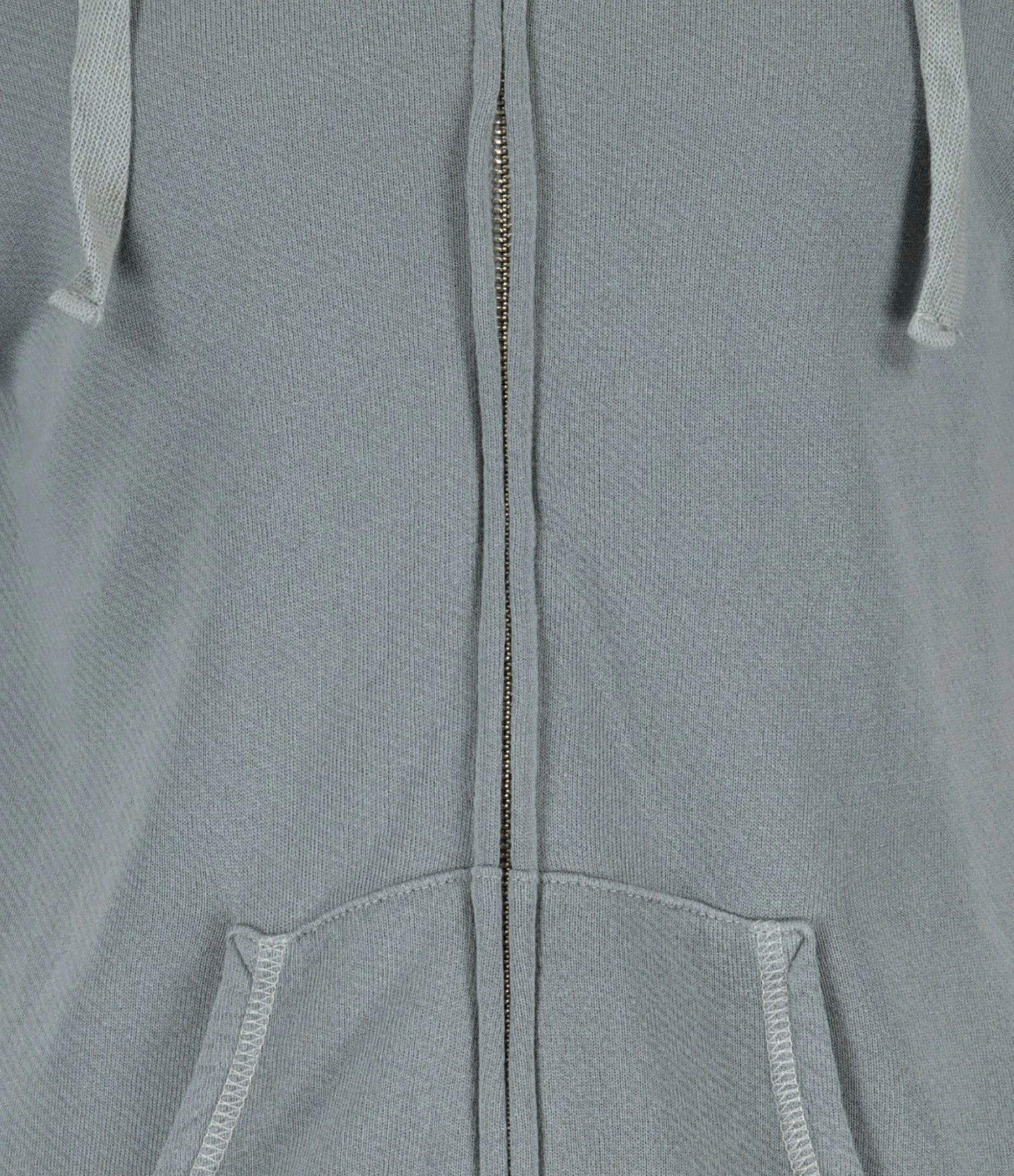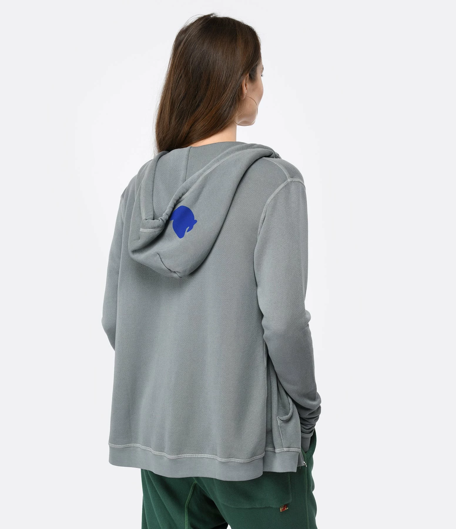 Veste à capuche grise. Logo oiseau bleu sérigraphié sur la capuche. Capuche avec cordon de serrage. Fermeture par zip sur le devant. Manches longues. Deux poches à l’avant. Coupe droite. Base droite.