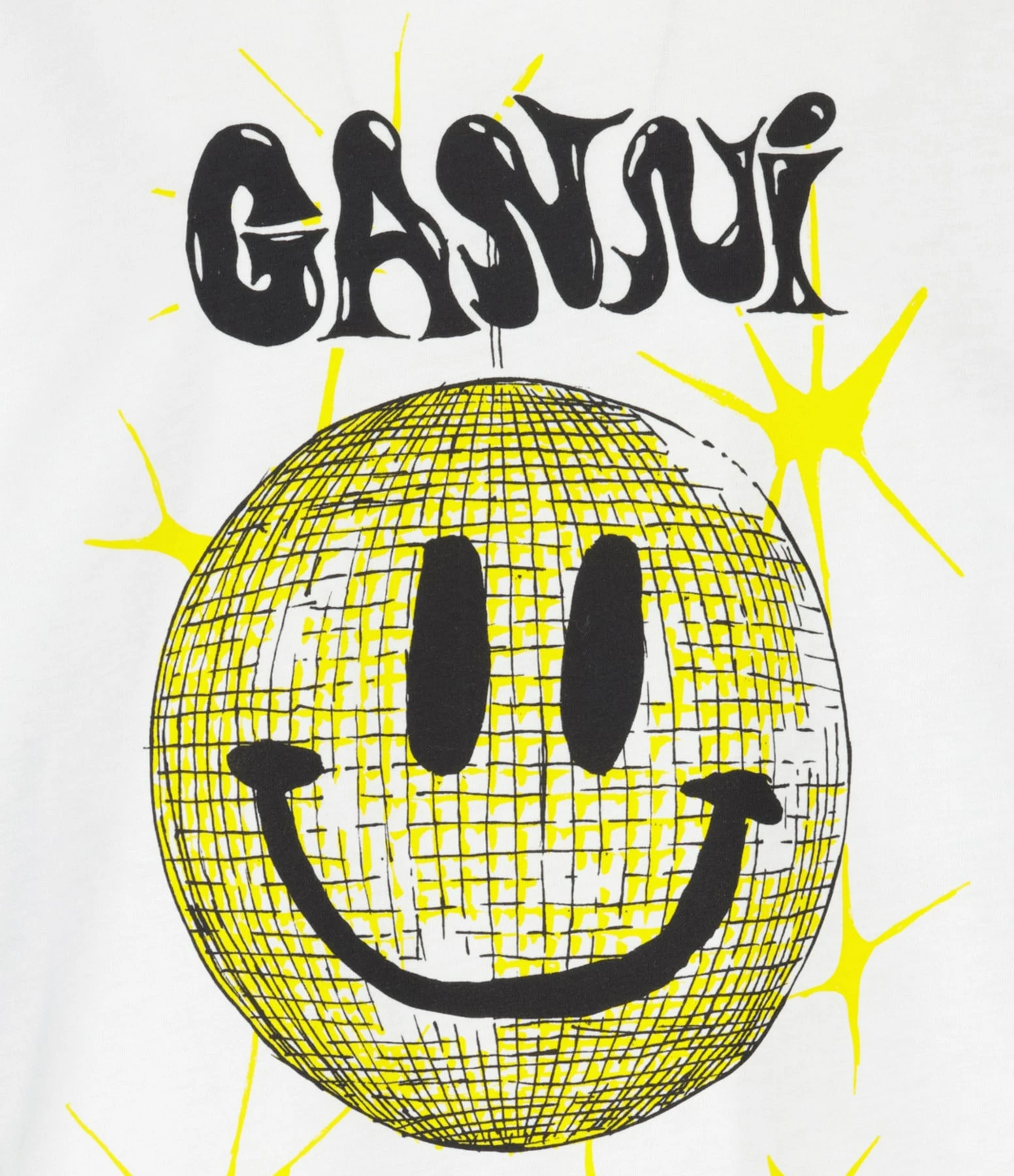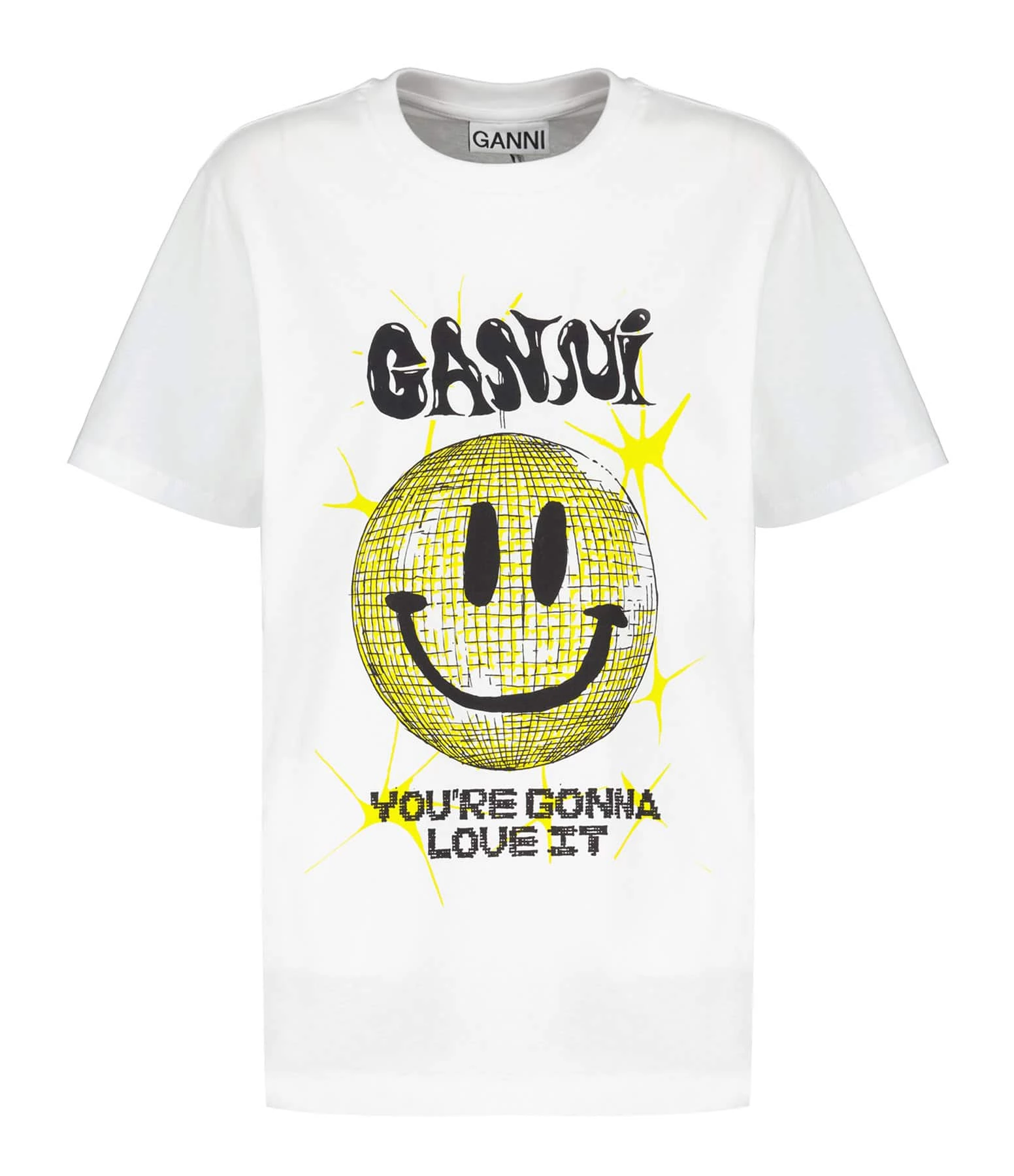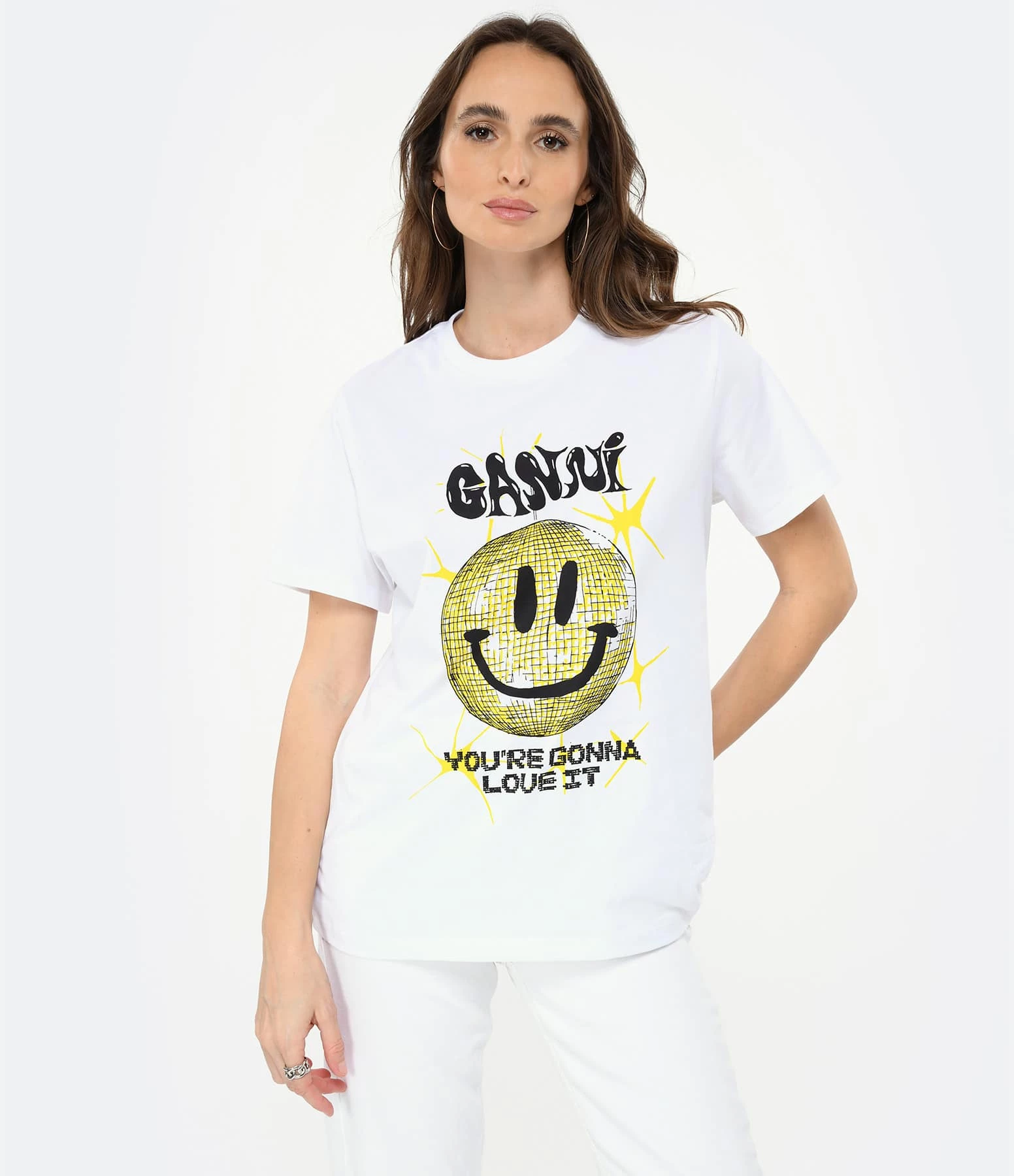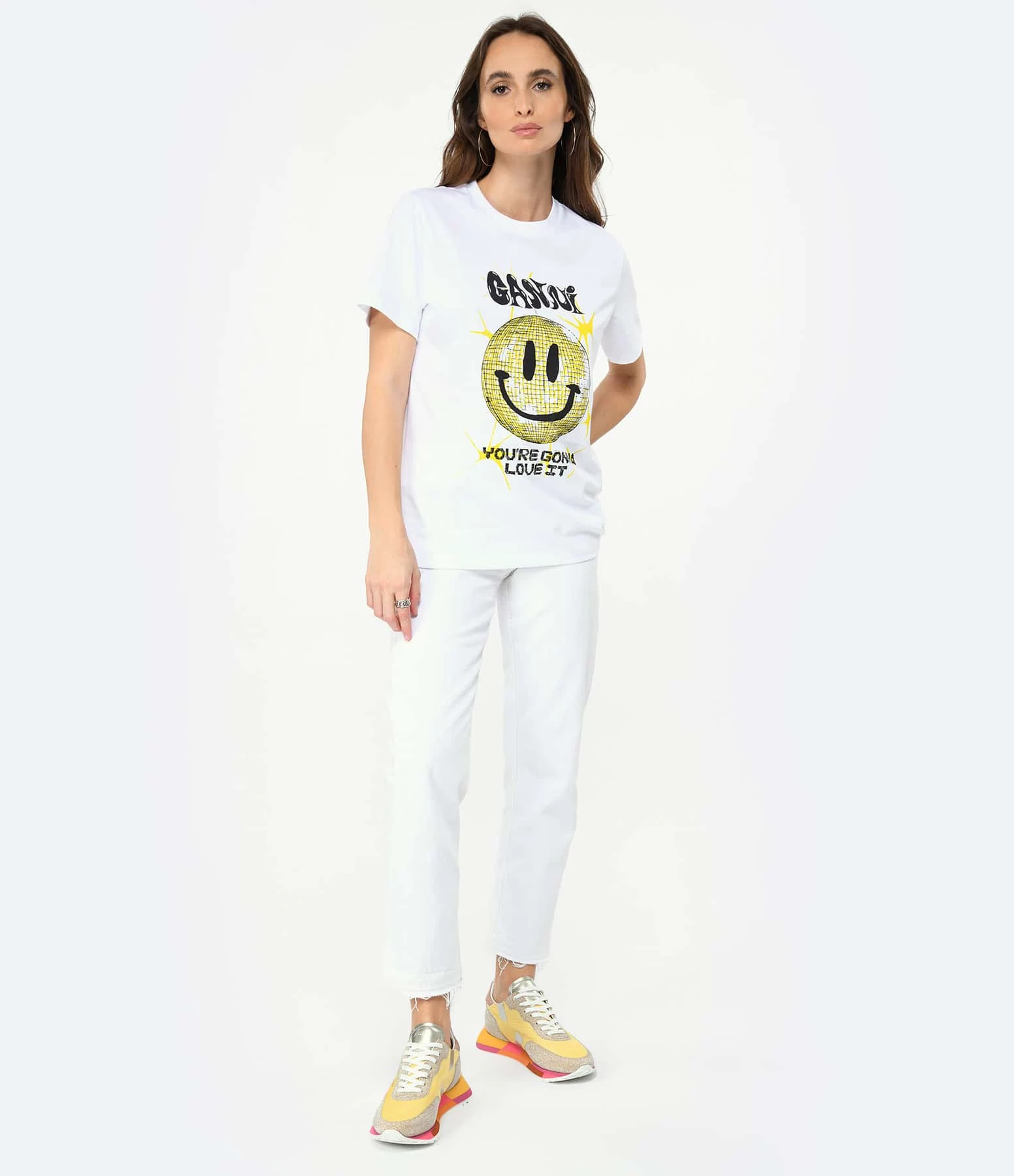 Tee-shirt en coton blanc avec un graphique flocké présentant le logo, un smiley et l’inscription “You’re gonna love it” dans des tons jaunes et blancs sur le devant. Col rond côtelé. Manches courtes. Coupe ample. Base droite.