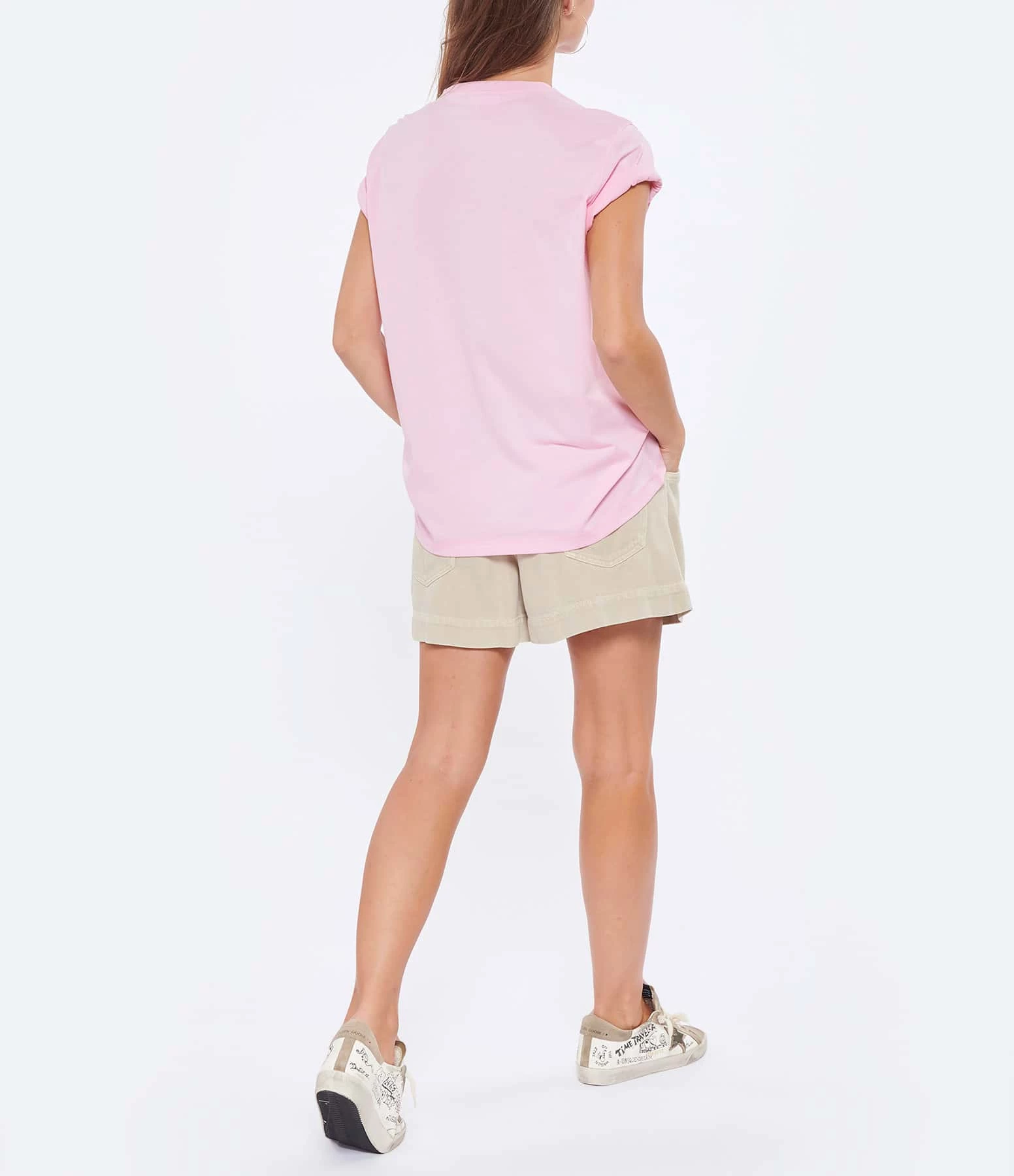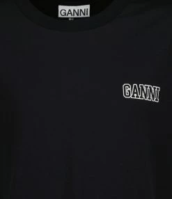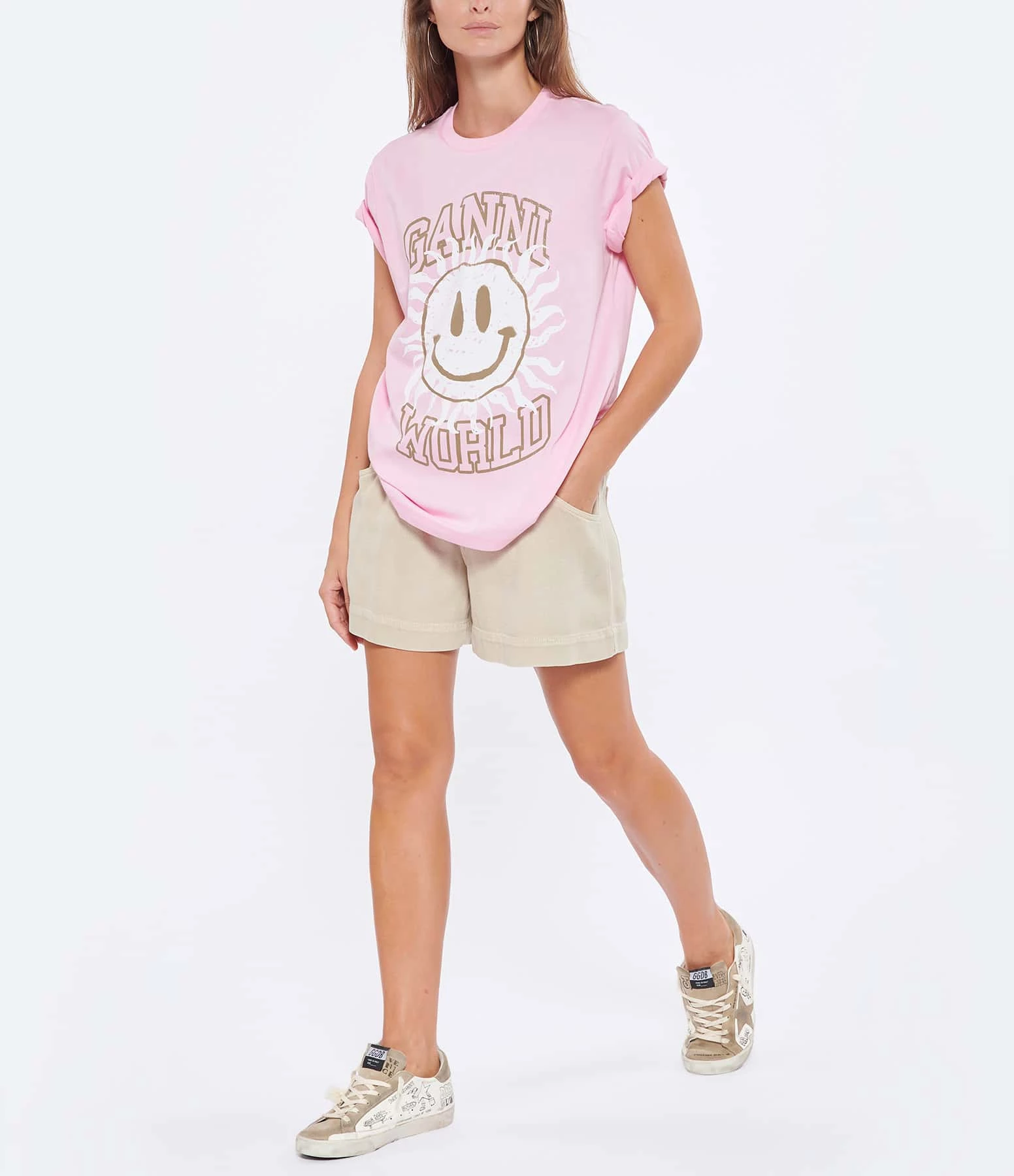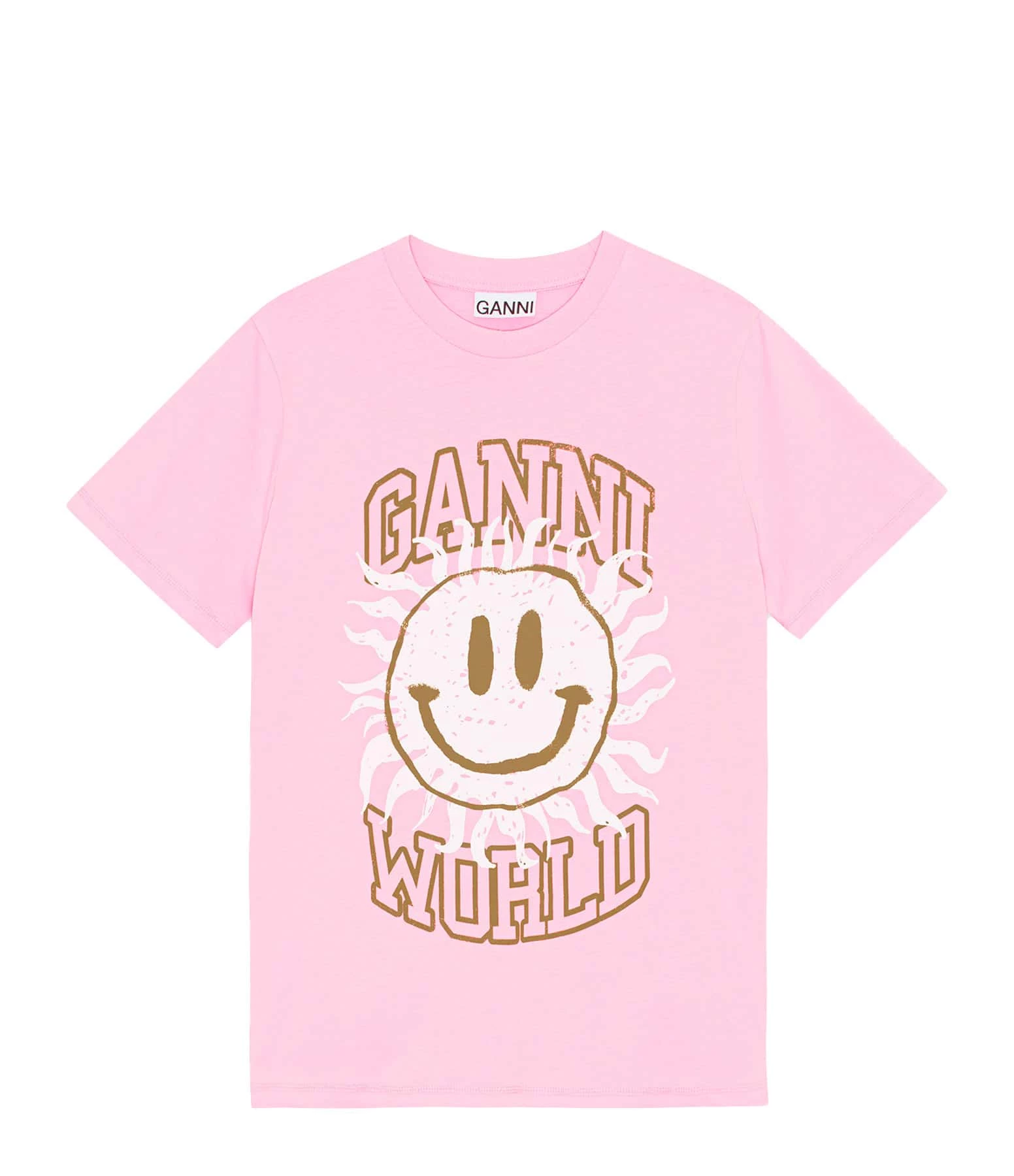 Tee-shirt en coton rose présentant une sérigraphie “smiley GANNI” en blanc et doré floquée à l’avant. Col rond. Manches courtes. Coupe droite. Base droite.
