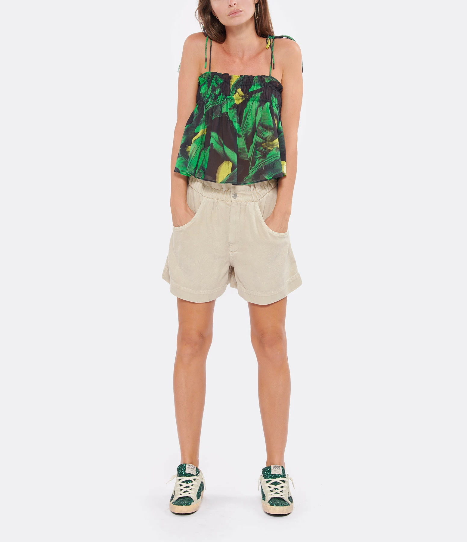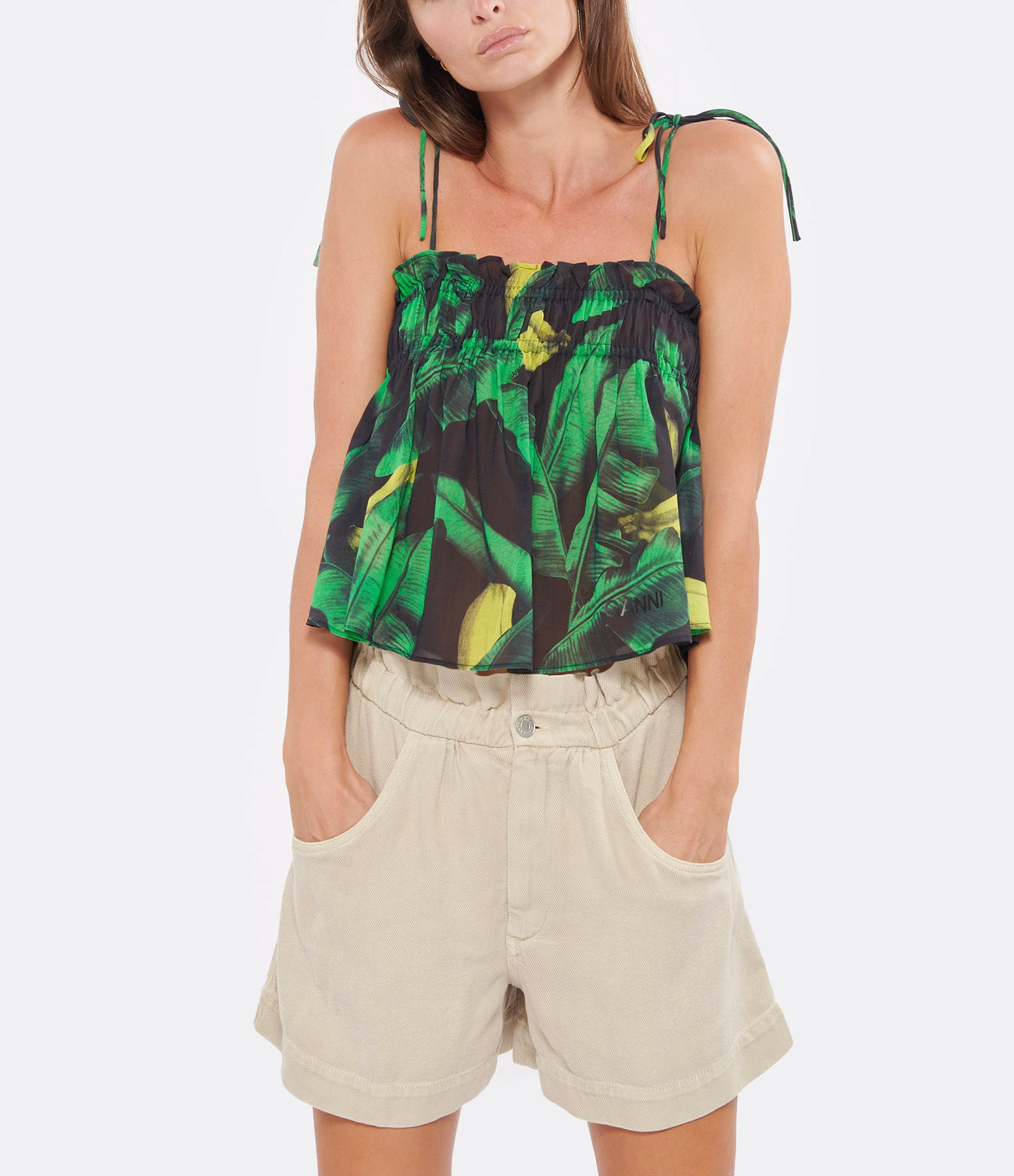 Caraco en coton à imprimé tropical jaune, vert et noir. Encolure carrée froncée et volantée. Sans manches. Fines bretelles à nouer. Coupe droite pour un porté décontracté. longueur légèrement raccourcie. Base droite. Non doublé.