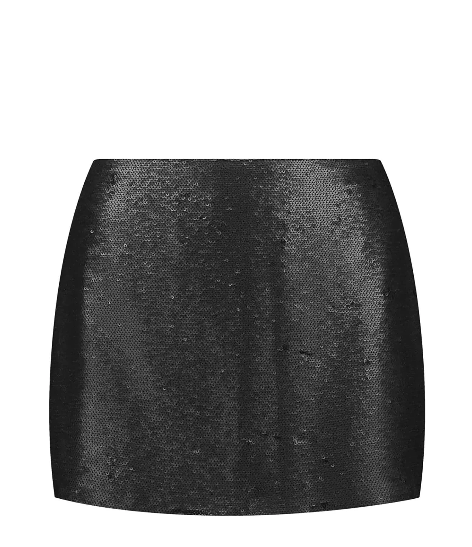 Mini jupe à sequins noirs. Fermeture zippée invisible latérales. Coupe près du corps. Base droite. Doublée par un short.