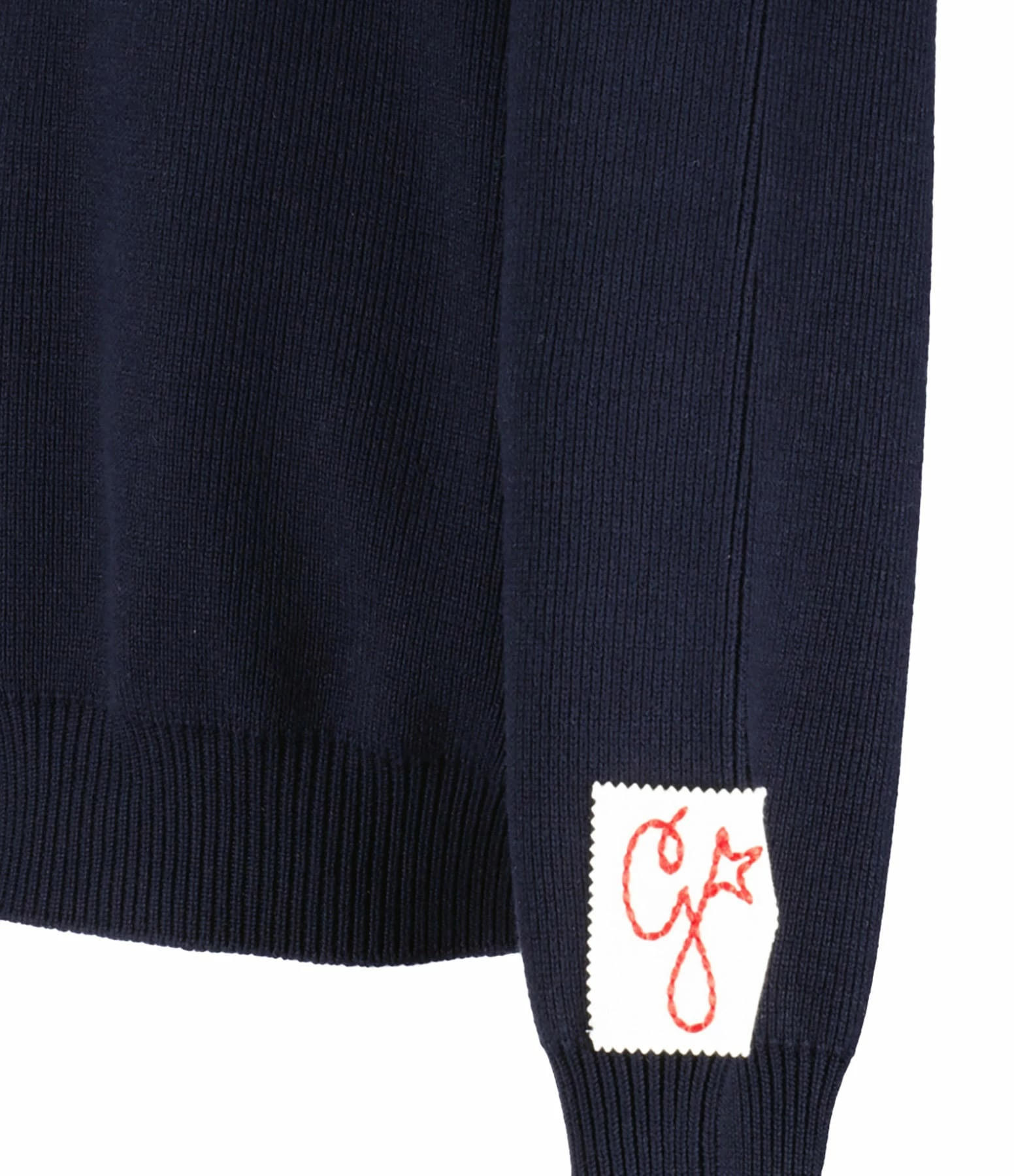 Pull en maille côtelée de coton mélangé bleu foncé. Col rond. Manches longues. Patch amovible avec la lettre G brodée en rouge sur le poignet gauche. Double logo étoile en métal bronze dans la nuque. Coupe ample. Base droite.
