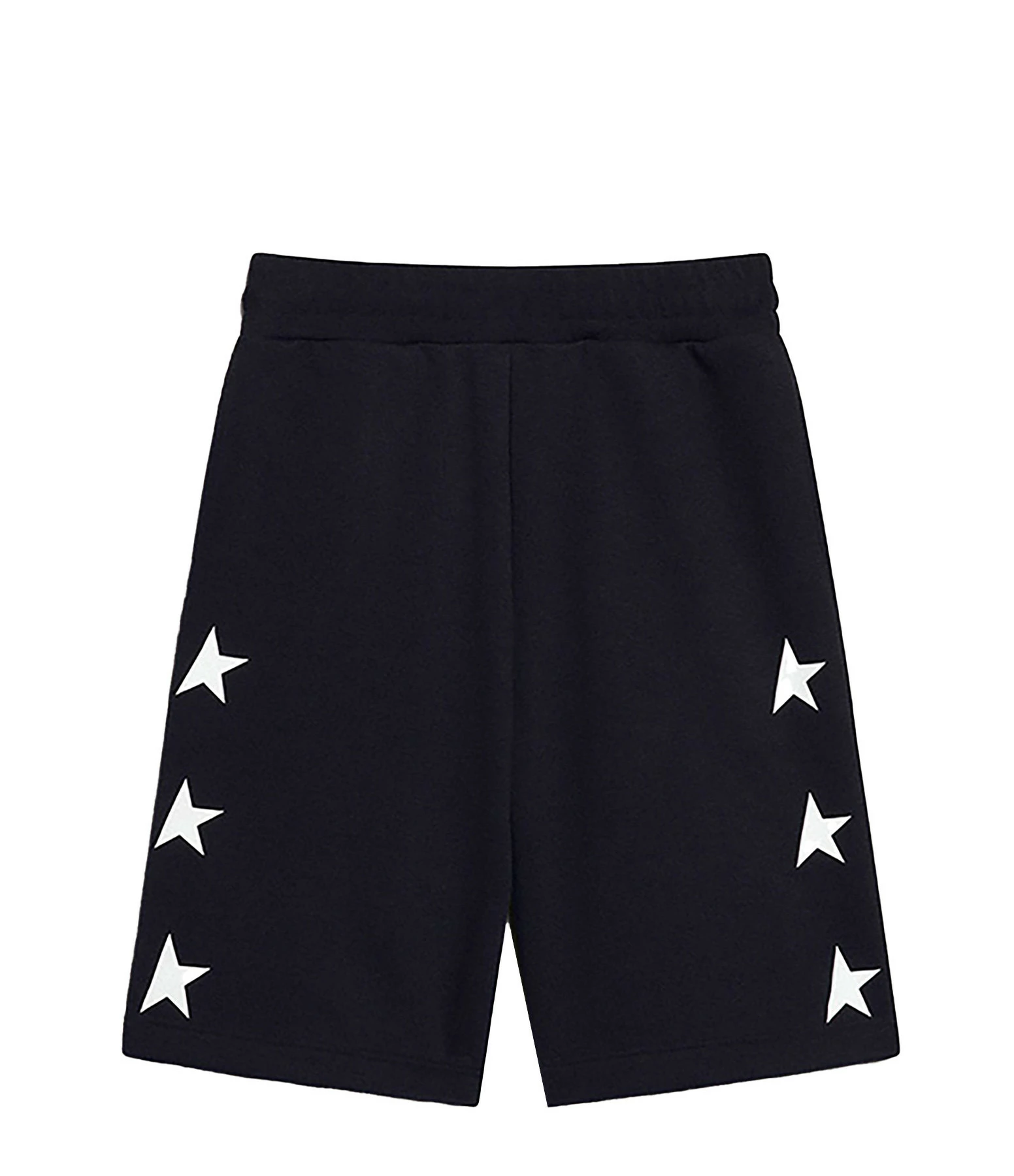 Short pour enfant en coton bleu marine. Logo étoile flocké en blanc sur les côtés. Taille élastiquée. Coupe droite. Base droite.
