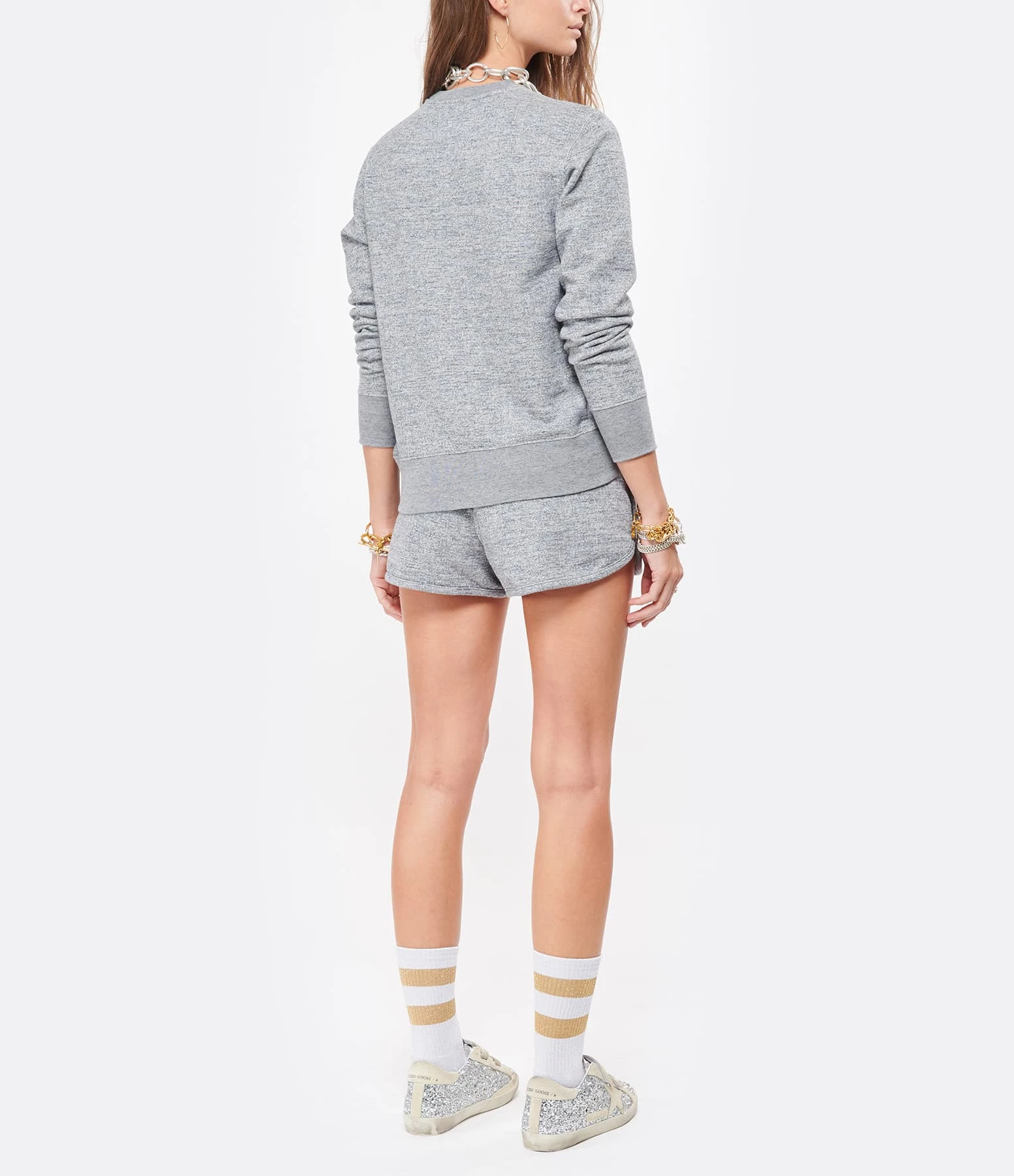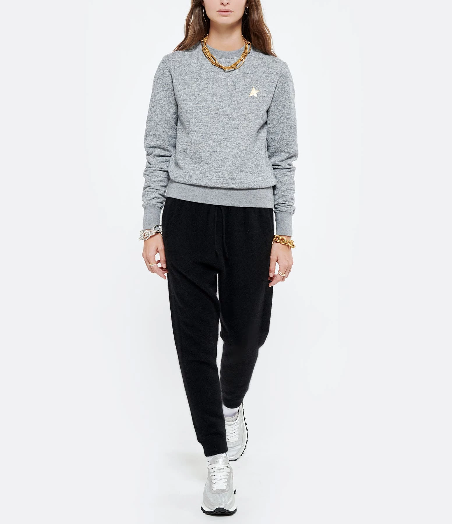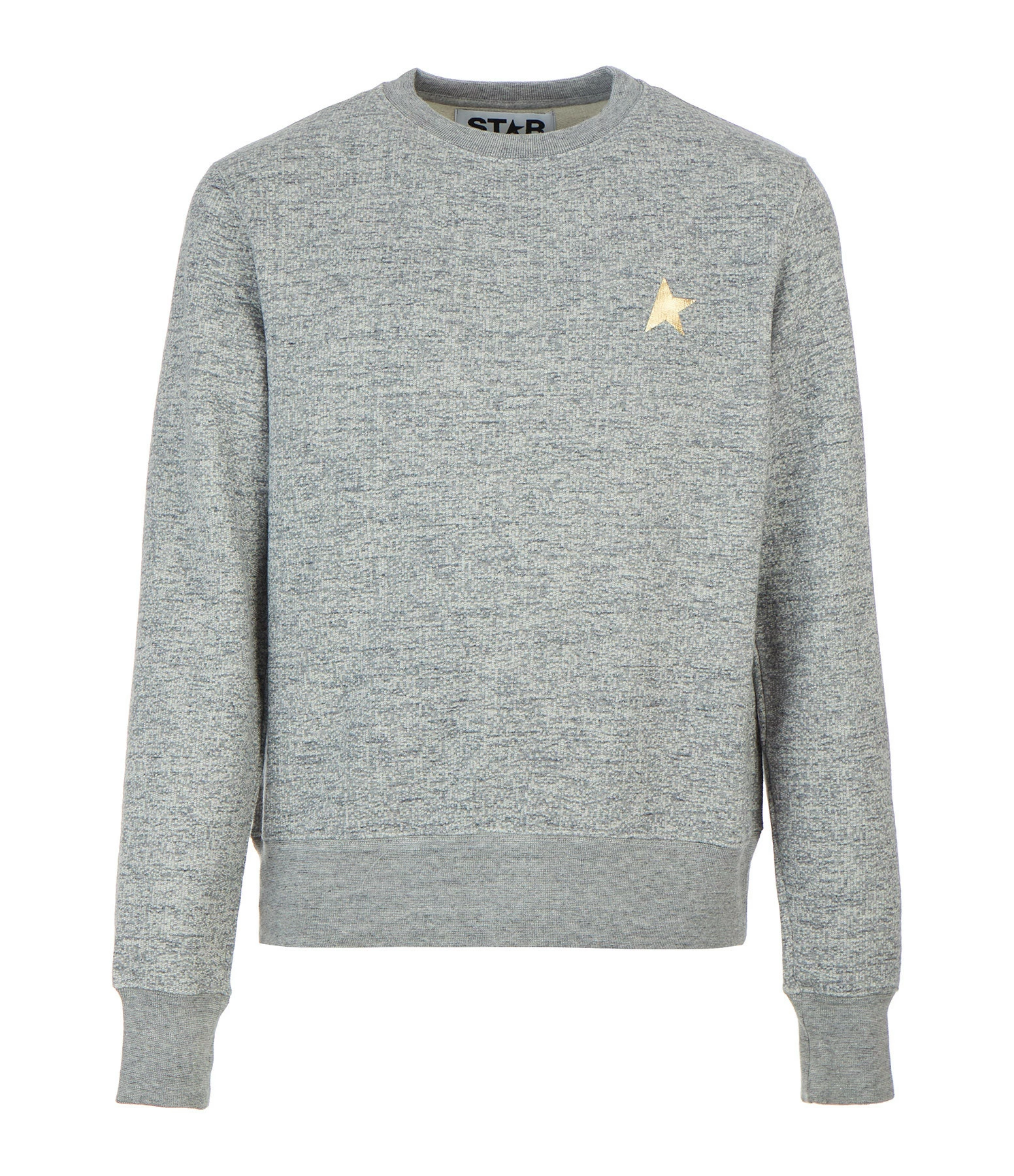Sweatshirt en coton gris chiné. Étoile dorée côté cœur. Col rond. Manches longues. Coupe droite. Base droite.