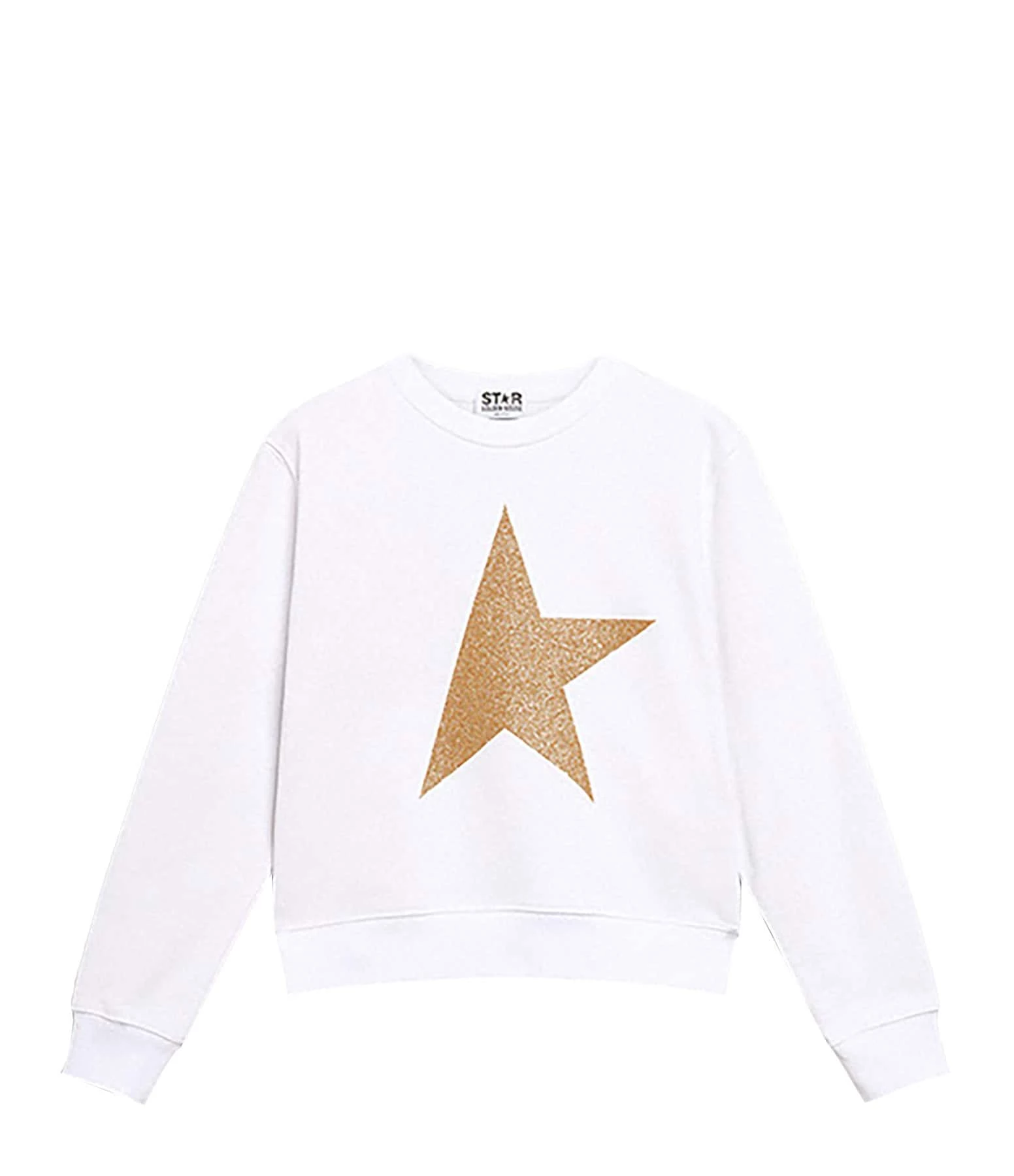 Sweatshirt en coton molletonné blanc. Logo étoile doré pailleté sérigraphié sur le devant. Col rond côtelé. Manches longues avec poignets côtelés. Inscription “STAR GOLDEN GOOSE” sérigraphiée en doré dans le dos. Coupe droite. Base droite côtelée.