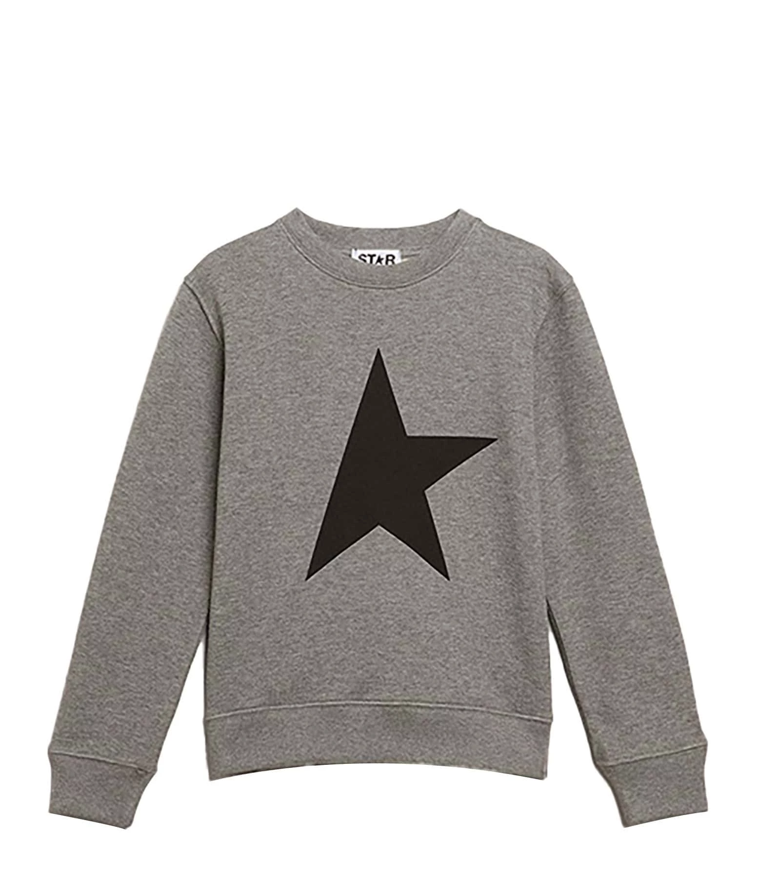 Sweatshirt en coton molletonné gris chiné. Logo étoile noir sérigraphié sur le devant. Col rond côtelé. Manches longues avec poignets côtelés. Inscription “STAR GOLDEN GOOSE” sérigraphiée en noir dans le dos. Coupe droite. Base droite côtelée.