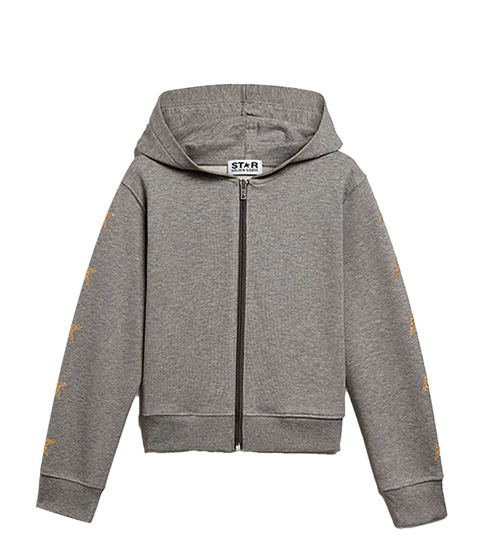 Veste sweatshirt en coton gris. Logo étoile dorées pailletées sur les manches. Manches longues avec poignets côtelées. Inscription “STAR GOLDEN GOOSE” sérigraphiée en doré pailleté. Coupe droite. Base droite côtelée.