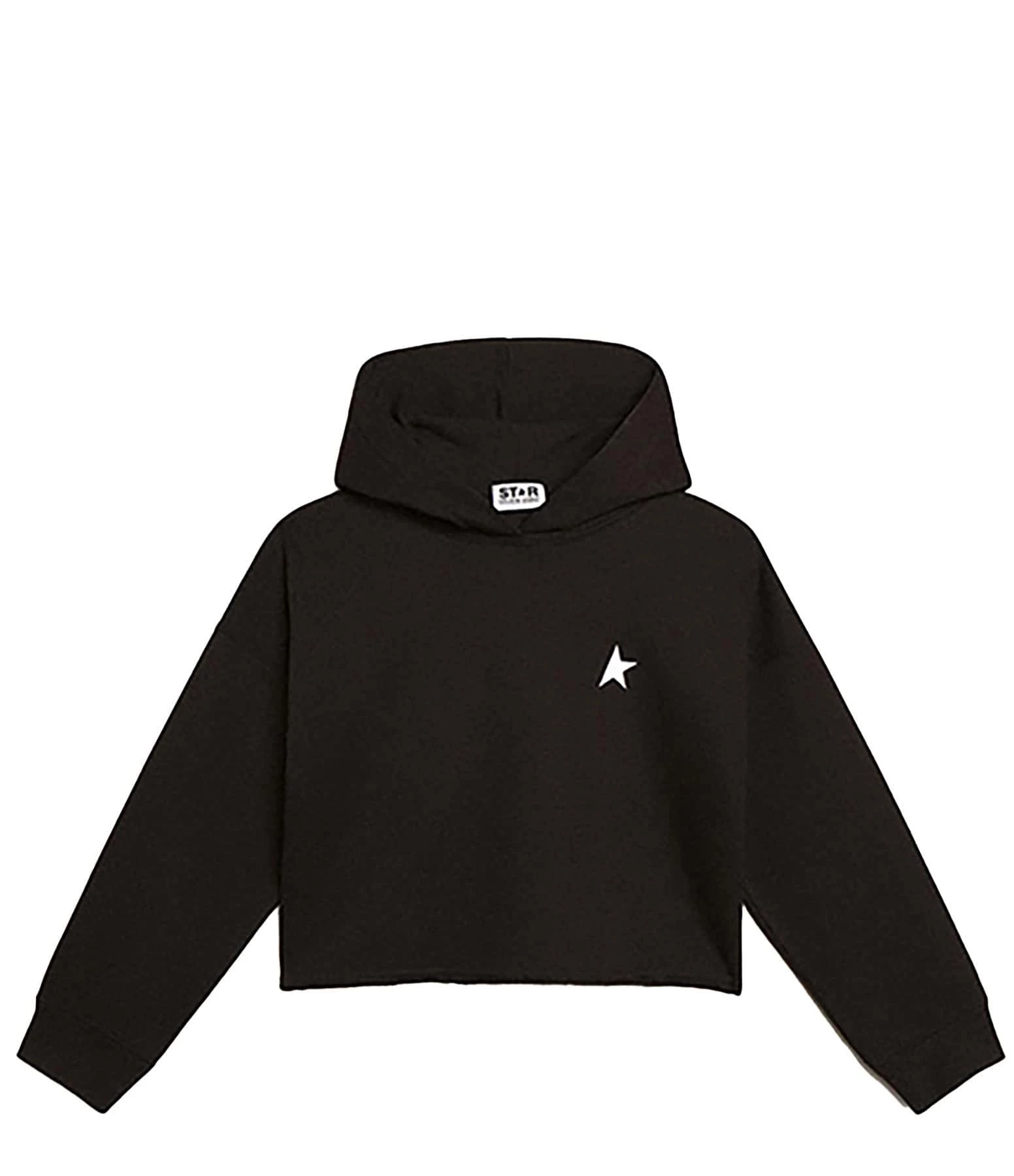 Sweatshirt court en coton molletonné mélangé noir. Logo étoile imprimé en blanc sur la poitrine. Col à capuche. Manches longues avec poignets côtelés. Longueur raccourcie. Coupe ample. Base droite côtelée.