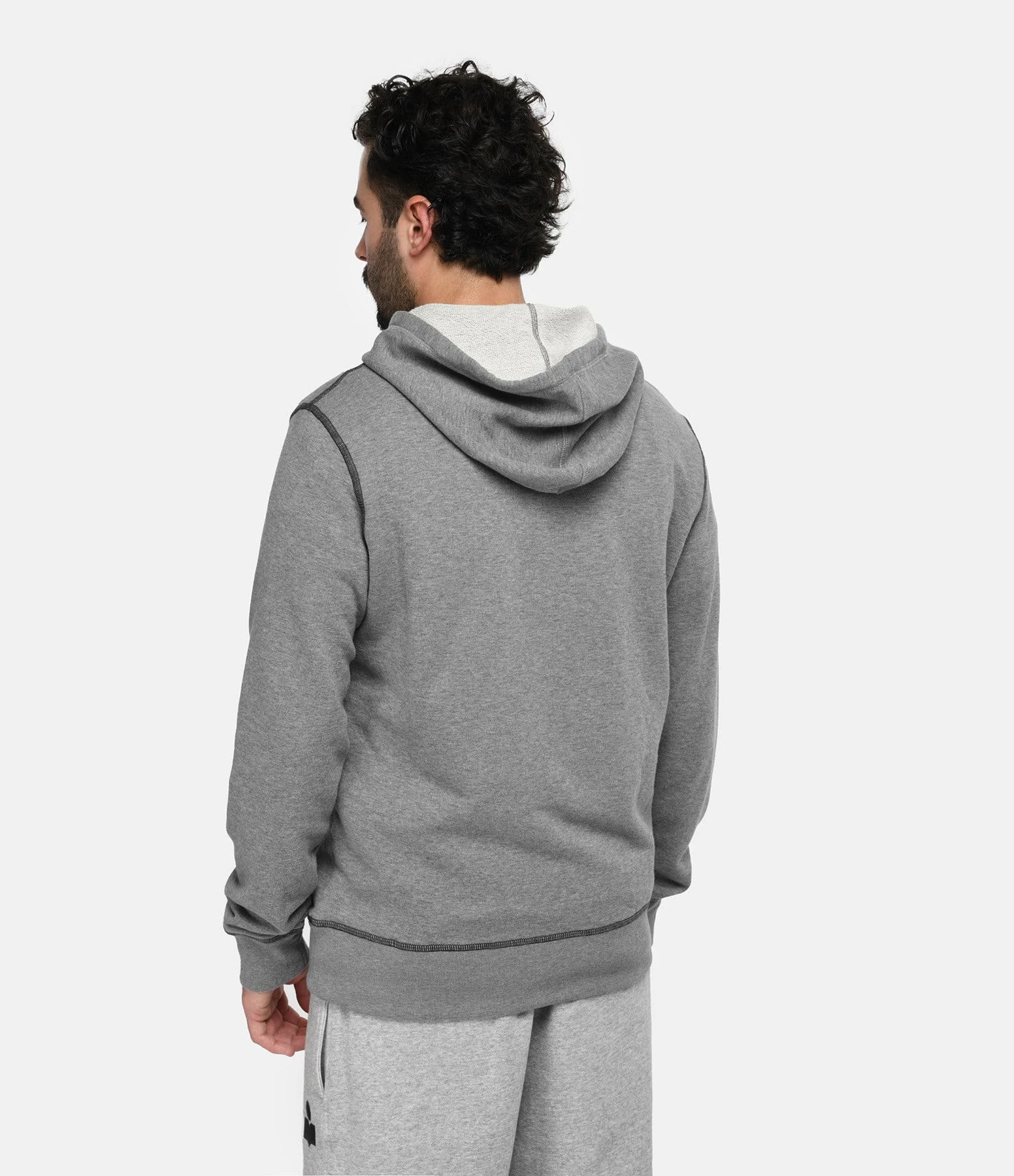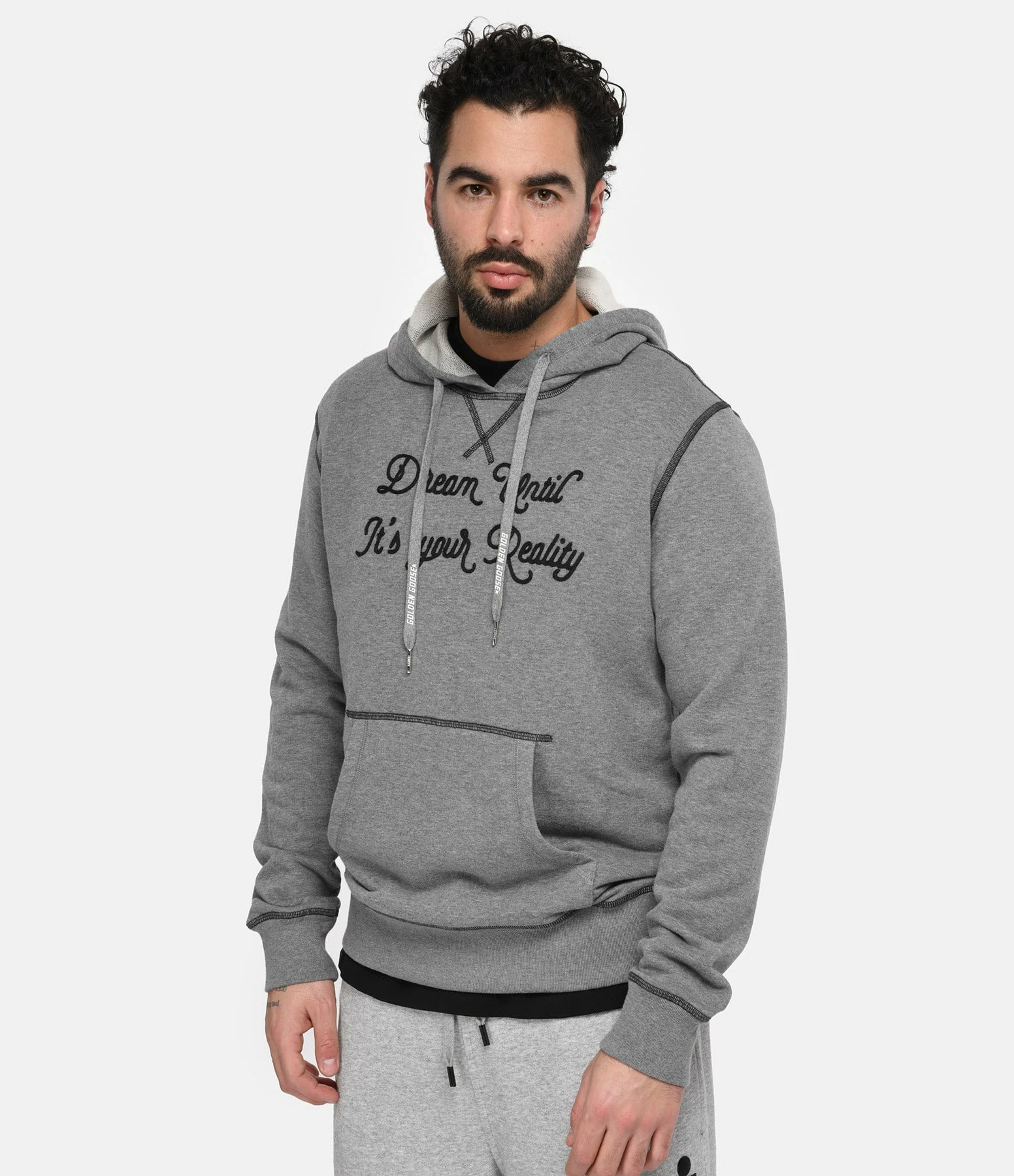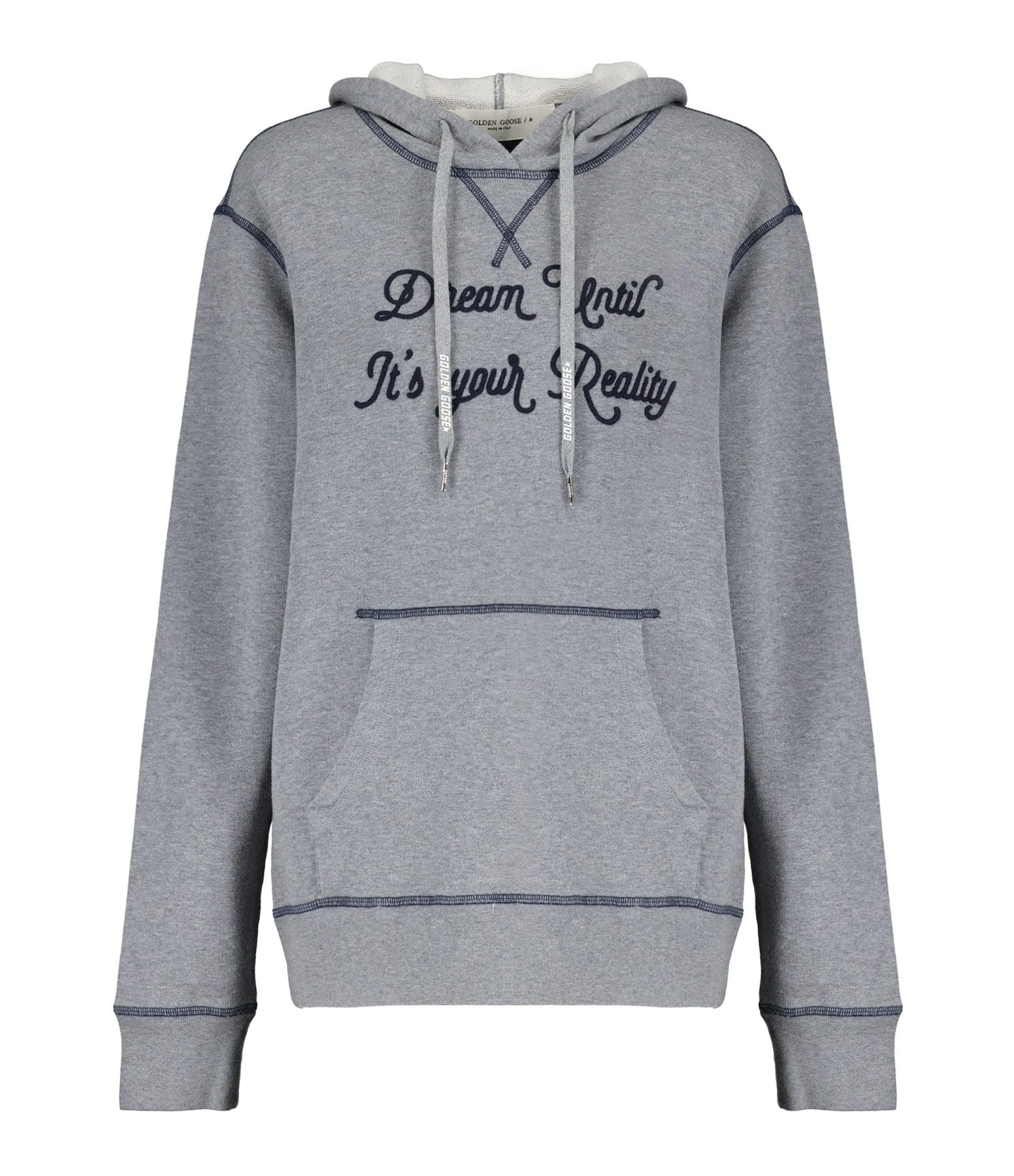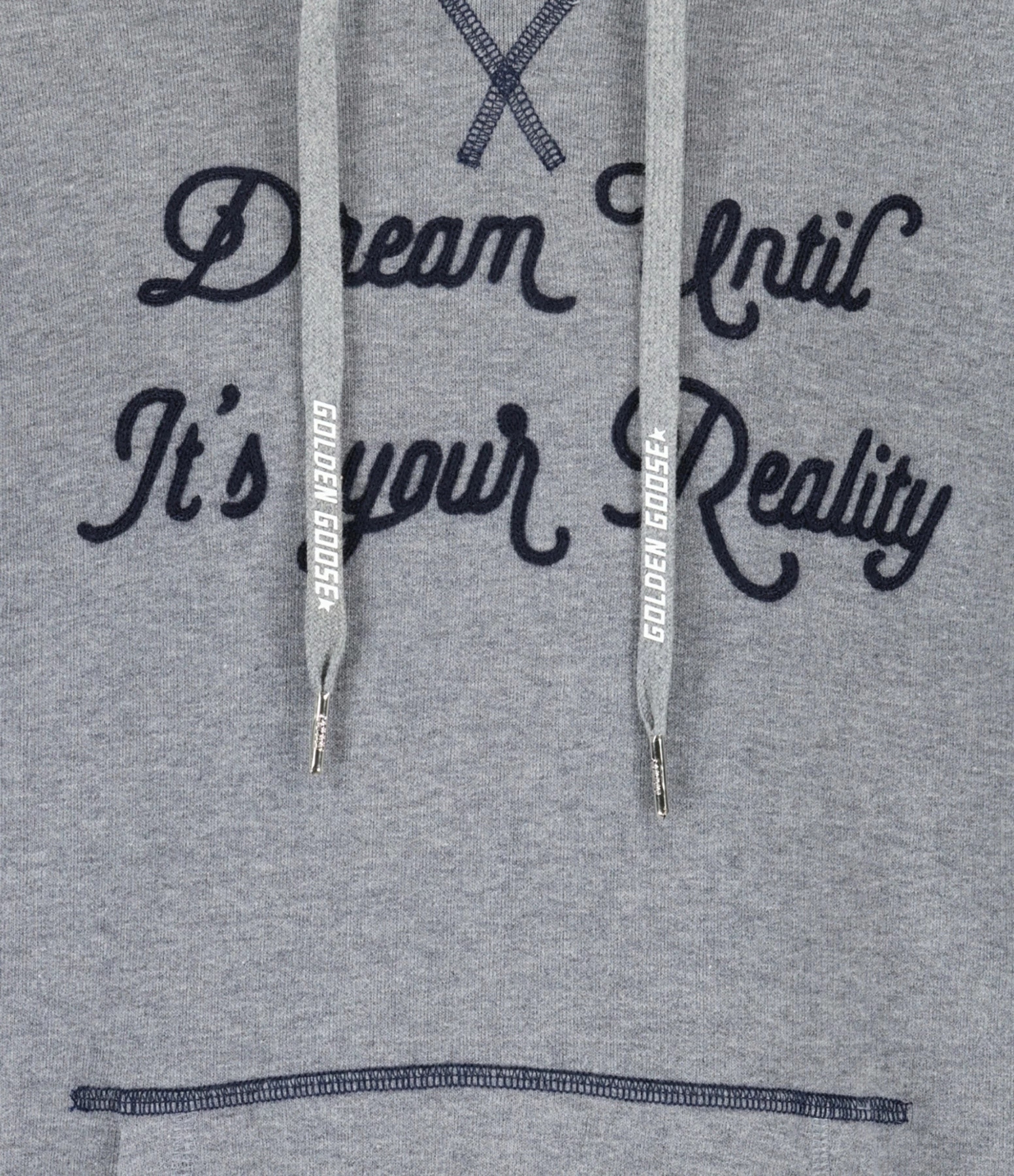 Sweatshirt en coton molletonné gris chiné avec l’inscription “Dream Until It’s your Reality” brodée en noir sur le devant. Coutures soulignées par un surjet bleu foncé. Col à capuche avec cordon de serrage. Manches longues avec poignets côtelés. Double logo étoile en métal bronze dans la nuque. Une poche kangourou sur le devant. Coupe droite. Base droite côtelée.