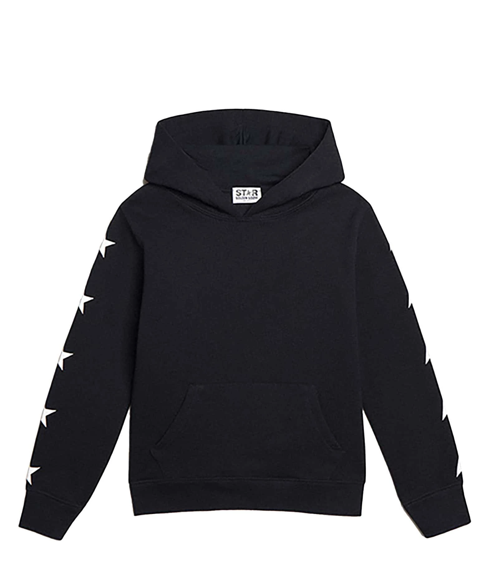 Sweatshirt en coton molletonné bleu marine. Logo “étoile” sérigraphié en blanc sur les manches. Col à capuche. Manches longues avec poignets côtelés. Poche kangourou sur le devant. Coupe droite. Base droite côtelée.